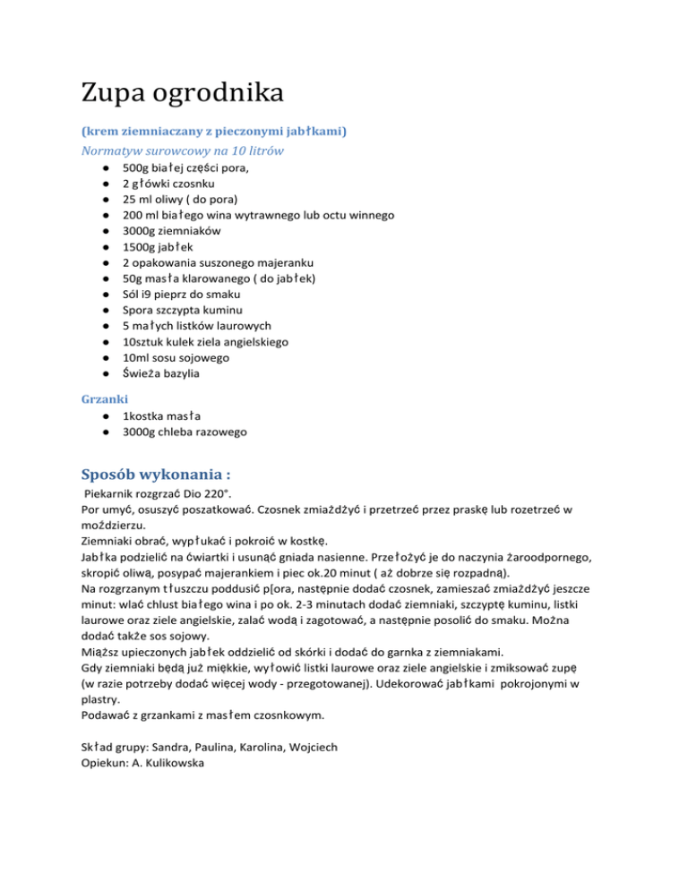 Zupa ogrodnika (krem ziemniaczany z pieczonymi jabłkami) Normatyw surowcowy na 10 litrów ● ● ● ● ● ● ● ● ● ● ● ● ● ● 500g białej części pora, 2 główki czosnku 25 ml oliwy ( do pora) 200 ml białego wina wytrawnego lub octu winnego 3000g ziemniaków 1500g jabłek 2 opakowania suszonego majeranku 50g masła klarowanego ( do jabłek) Sól i9 pieprz do smaku Spora szczypta kuminu 5 małych listków laurowych 10sztuk kulek ziela angielskiego 10ml sosu sojowego Świeża bazylia Grzanki ● 1kostka masła ● 3000g chleba razowego Sposób wykonania : Piekarnik rozgrzaćDio 220°. Por umyć, osuszyćposzatkować. Czosnek zmiażdżyći przetrzećprzez praskęlub rozetrzećw moź dzierzu. Ziemniaki obrać, wypłukaći pokroićw kostkę. Jabłka podzielićna ćwiartki i usunąćgniada nasienne. Przełożyćje do naczynia żaroodpornego, skropićoliwą, posypaćmajerankiem i piec ok.20 minut ( ażdobrze sięrozpadną). Na rozgrzanym tłuszczu poddusićp[ora, następnie dodaćczosnek, zamieszaćzmiażdżyćjeszcze minut: wlaćchlust białego wina i po ok. 2-3 minutach dodaćziemniaki, szczyptękuminu, listki laurowe oraz ziele angielskie, zalaćwodąi zagotować, a następnie posolićdo smaku. Można dodaćtakż e sos sojowy. Mią ż sz upieczonych jabłek oddzielićod skórki i dodaćdo garnka z ziemniakami. Gdy ziemniaki będąjużmię kkie, wyłowićlistki laurowe oraz ziele angielskie i zmiksowaćzupę (w razie potrzeby dodaćwięcej wody - przegotowanej). Udekorowaćjabłkami pokrojonymi w plastry. Podawaćz grzankami z masłem czosnkowym. Skł ad grupy: Sandra, Paulina, Karolina, Wojciech Opiekun: A. Kulikowska