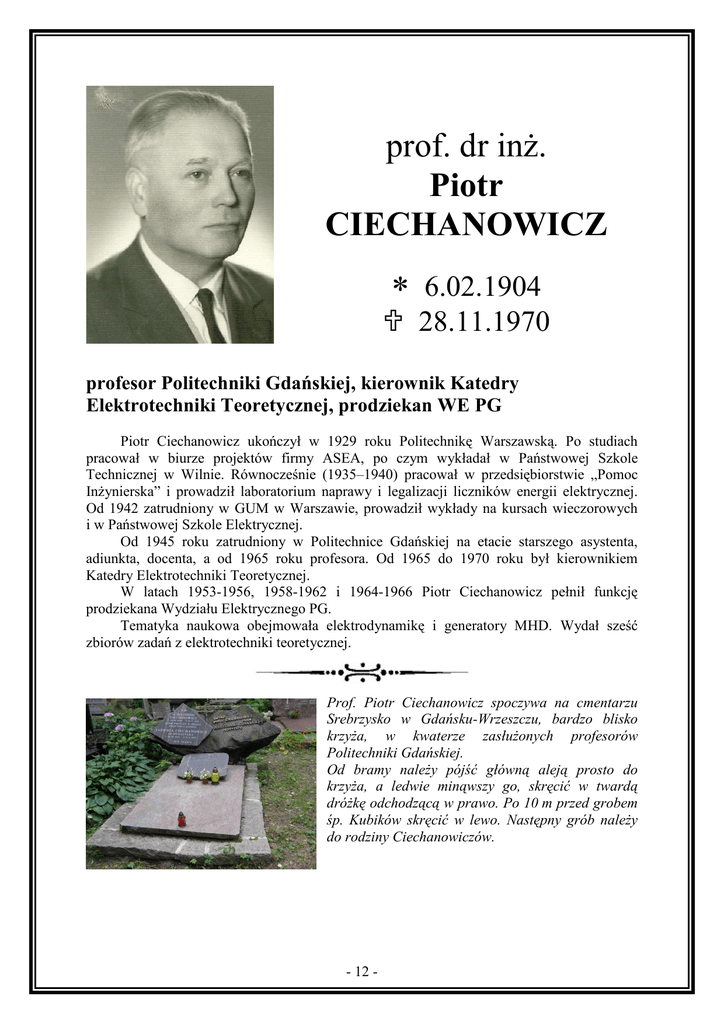 prof. dr inż. Piotr CIECHANOWICZ ∗ 6.02.1904 28.11.1970 profesor Politechniki Gdańskiej, kierownik Katedry Elektrotechniki Teoretycznej, prodziekan WE PG Piotr Ciechanowicz ukończył w 1929 roku Politechnikę Warszawską. Po studiach pracował w biurze projektów firmy ASEA, po czym wykładał w Państwowej Szkole Technicznej w Wilnie. Równocześnie (1935–1940) pracował w przedsiębiorstwie „Pomoc Inżynierska” i prowadził laboratorium naprawy i legalizacji liczników energii elektrycznej. Od 1942 zatrudniony w GUM w Warszawie, prowadził wykłady na kursach wieczorowych i w Państwowej Szkole Elektrycznej. Od 1945 roku zatrudniony w Politechnice Gdańskiej na etacie starszego asystenta, adiunkta, docenta, a od 1965 roku profesora. Od 1965 do 1970 roku był kierownikiem Katedry Elektrotechniki Teoretycznej. W latach 1953-1956, 1958-1962 i 1964-1966 Piotr Ciechanowicz pełnił funkcję prodziekana Wydziału Elektrycznego PG. Tematyka naukowa obejmowała elektrodynamikę i generatory MHD. Wydał sześć zbiorów zadań z elektrotechniki teoretycznej. Prof. Piotr Ciechanowicz spoczywa na cmentarzu Srebrzysko w Gdańsku-Wrzeszczu, bardzo blisko krzyża, w kwaterze zasłużonych profesorów Politechniki Gdańskiej. Od bramy należy pójść główną aleją prosto do krzyża, a ledwie minąwszy go, skręcić w twardą dróżkę odchodzącą w prawo. Po 10 m przed grobem śp. Kubików skręcić w lewo. Następny grób należy do rodziny Ciechanowiczów. - 12 -