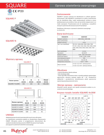 SQUARE Oprawa oœwietlenia awaryjnego IP20 Zastosowanie 1311/2012 SQUARE P, oprawa rastrowa do wbudowania w sufitach gipsowokartonowych, albo SQUARE N, montowana na suficie, przeznaczona jest do oœwietlenia dróg i wyjœæ ewakuacyjnych zarówno w pracy podstawowej tj. przy zasilaniu z sieci, jak i po zaniku napiêcia sieci, tj. w trybie awaryjnym. Przystosowana jest do wspó³pracy z wszystkimi wersjami systemów oferowanymi przez firmê Hybryd. SQUARE UARE P Dodatkowe informacje o oprawach oœwietlenia awaryjnego na stronie 26. Dane techniczne PARAMETR Napiêcie zasilania Klasa ochronnoœci Stopieñ ochrony Typ i moc œwietlówki SQUARE N Iloœæ œwietlówek Typ baterii Napiêcie baterii Pojemnoœæ baterii Czas ³adowania baterii Czas pracy awaryjnej Temperatura otoczenia Wymiary oprawy SQUARE P Z³¹cze sieciowe WARTOŒÆ 230V 50Hz; 220V (CB) I IP 20 T8/ G13: 16W,18W; 36W; 58W; 70W T5/ G5: 14W; 21W; 24W; 25W; 28W; 32W 35W; 39W; 45W; 49W; 50W; 54W; 73W 80W 1,2,3,4 Ni-Cd HT 3,6V; 4,8V; 6,0V; 8,4V 1,5Ah; 2,5Ah; 4,0Ah 24h 1h, 2h, 3h +10°C ÷ +40°C 4 x 0,5 ÷2,5 mm 2 (wersja jasna) 3 x 0,5 ÷2,5 mm 2 (wersja ciemna) B Obudowa A C Nazwa oprawy A [mm] B [mm] C [mm] Otwór [mm] SQUARE P 4x18W 595 595 80 585x585 - materia³ obudowy: blacha stalowa - kolor obudowy: bia³y - raster typu PAR: Polerowany raster o wysokim po³ysku zapewniaj¹cy ograniczenie olœnienia powy¿ej k¹tów 600 i 650. Paraboliczne odb³yœniki i parabolicznie ukszta³towane p³ytki poprzeczne zapewniaj¹ wysok¹ sprawnoœæ rastra. Wersje oprawy - zamawianie Wszystkie wersje oprawy oraz sposób zamawiania podane s¹ na ostatnich stronach katalogu. SQUARE N B Krzywa rozsy³u œwiat³a SQUARE 4x18W A C Nazwa oprawy A [mm] B [mm] C [mm] SQUARE N 2x18W 628 246 61 SQUARE N 2x36W 1236 246 61 SQUARE N 2x58W 1536 246 61 SQUARE N 4x18W 628 443 61 UWAGA Adaptacjê opraw do wersji awaryjnej dla innych mocy oferujemy na indywidualne zamówienia zgodnie ze œwiadectwem dopuszczenia CNBOP. Oferujemy pomoc w przygotowaniu dokumentacji dla uzyskania œwiadectwa dopuszczenia CNBOP dla opraw innych typów, pracuj¹cych w systemach oœwietlenia awaryjnego. R email: [email protected] www: hybryd.com.pl 46 Sp. z o.o. tel: +48 (32) 233 98 83 fax: +48 (32) 233 98 84 Hybryd Sp. z o.o. Sikorskiego 28, 44-120 Pyskowice Oprawy oœwietlenia awaryjnego - dane do zamówienia Oprawa Typ obudowy Wykonanie Moc Taw [h] Tryb pracy SFERA N ST 1x18W 2 J P AT 2x18W CT 1x26W CB 2x26W SFERA 1x32W Przyk³ad tworzenia nazwy: SFERA N CT 2x18W 2J Oprawa Typ obudowy Wykonanie Moc Taw [h] Tryb pracy SQUARE N ST 4x14W 2 J P AT 4x18W CT 2x36W SQUARE CB Przyk³ad tworzenia nazwy: SQUARE P AT 4x18W 2J Legenda: Typ bry³y fotometrycznej: patrz indywidualne karty produktów. Wielkoœæ oprawy: Puste pole – ma³a D – du¿a. Typ oprawy lub klosz: N – natynkowa P – podtynkowa DW – oprawa dwustronna b¹dŸ klosz dwustronny. Wykonanie: ST – standard AT – autotest CT – centraltest CB – centralna bateria, CB-MA – centralna bateria z wbudowanym modu³em adresowym, CB-MP – centralna bateria z wbudowanym modu³em prze³¹czaj¹cym, CB-MAP – centralna bateria z wbudowanym modu³em adresowo-prze³¹czaj¹cym, BU-MA – zasilanie buforowe. Taw [h] - czas pracy awaryjnej: nie definiuje siê dla wszystkich wykonañ CB. Tryb pracy: C – ciemny J – jasny N – nocny (tylko dla wykonania CT). Zdefiniowany dla wykonañ ST, AT, CT, CB-MA (oprawy LED) i CB-MAP (oprawy œwietlówkowe). Zakres temperatur: Puste pole - standardowy zakres temperatur T – oprawa o rozszerzonym zakresie temperatur (patrz dane techniczne) z wbudowanym termostatem H-323 (bateri¹ termostatyzowan¹). Kolor obudowy: pola oznaczone * dostêpne na specjalne zamówienie – wyd³u¿ony czas dostawy. R Hybryd Sp. z o.o. Sikorskiego 28, 44-120 Pyskowice tel: +48 (32) 233 98 83 fax: +48 (32) 233 98 84 email: [email protected] www: hybryd.com.pl 63 Sp. z o.o. Wykonania, funkcje Oprawy oœwietlenia awaryjnego Wykonania - testowanie, monitoring ST = Standard - test pracy awaryjnej przy pomocy przycisku TEST , albo poprzez zanik zasilania; AT = Autotest - automatyczne okresowe wykonywanie testów: TEST A - test sprawnoœci lampy, raz w miesi¹cu; TEST B - pomiar czasu pracy awaryjnej, raz w roku; CT = Centraltest - wspó³praca z central¹ monitoruj¹c¹, albo z komputerem PC (pe³na adresacja opraw, wizualizacja opraw na planie obiektu, raporty o stanie systemu), testy wywo³ywane z jednostki steruj¹cej H-300 PC lub H-302 C; CB = Centralna Bateria - oprawa zasilana z sieci napiêciem 230V AC 50Hz, a po zaniku napiêcia sieci, napiêciem 220V DC pochodz¹cym z centralnej baterii, oprawa posiada wbudowany statecznik (wersja oprawy LED ma wbudowany statecznik LED 220V DC oraz modu³ LED); CB-MA – oprawa w wykonaniu CB z wbudowanym modu³em adresowym MA-02. Umo¿liwia wykrywanie stanu konkretnej oprawy na linii w przypadku opraw œwietlówkowych, b¹dŸ dodatkowo sterowania prac¹ grupy opraw LED. CB-MP – oprawa w wykonaniu CB z wbudowanym modu³em prze³¹czaj¹cym MP-2. Umo¿liwia sterowanie pracy podstawowej oprawy pod³¹czonej do systemu Centralnej Baterii (tylko dla opraw œwietlówkowych). CB-MAP – oprawa w wykonaniu CB z wbudowanym modu³em adresowo-prze³¹czaj¹cym MAP. Umo¿liwia zarówno wykrywanie stanu konkretnej oprawy na linii, jak równie¿ sterowania prac¹ podstawow¹ z systemu centralnej baterii i zewnêtrznego ³¹cznika. BU-MA = Zasilanie Buforowe - oprawa przeznaczona do wykorzystania z buforowymi zasilaczami 12 - 24V DC, posiada wbudowany statecznik LED 24V DC oraz modu³ LED. Funkcje opraw 1.Po zaniku napiêcia sieci nastêpuje automatycznie prze³¹czenie zasilania Ÿród³a œwiat³a na awaryjne z baterii akumulatorów (w wykonaniu ST, AT i CT). 2.Sygnalizacja stanu oprawy i akumulatora (dla wykonañ ST, AT i CT). 3.Nadzór napiêcia sieci i stanu akumulatora (dla wykonañ ST, AT i CT). 4.Zabezpieczenie przed g³êbokim roz³adowaniem akumulatora (dla wykonañ ST, A
