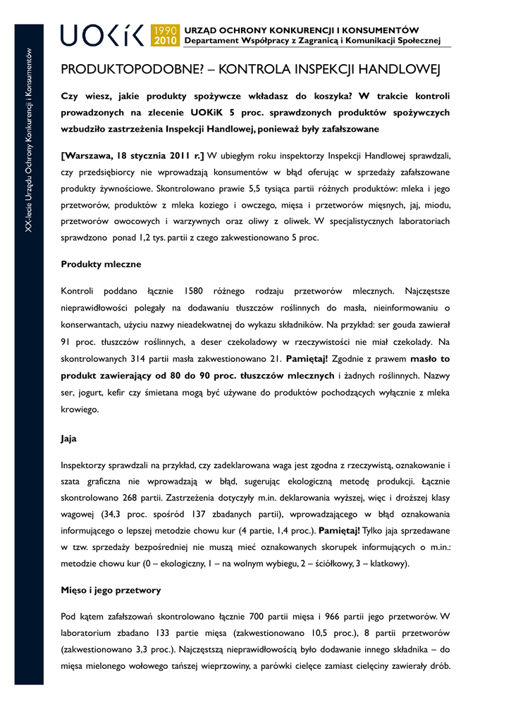 URZĄD OCHRONY KONKURENCJI I KONSUMENTÓW Departament Współpracy z Zagranicą i Komunikacji Społecznej PRODUKTOPODOBNE? – KONTROLA INSPEKCJI HANDLOWEJ Czy wiesz, jakie produkty spożywcze wkładasz do koszyka? W trakcie kontroli prowadzonych na zlecenie UOKiK 5 proc. sprawdzonych produktów spożywczych wzbudziło zastrzeżenia Inspekcji Handlowej, ponieważ były zafałszowane [Warszawa, 18 stycznia 2011 r.] W ubiegłym roku inspektorzy Inspekcji Handlowej sprawdzali, czy przedsiębiorcy nie wprowadzają konsumentów w błąd oferując w sprzedaży zafałszowane produkty żywnościowe. Skontrolowano prawie 5,5 tysiąca partii różnych produktów: mleka i jego przetworów, produktów z mleka koziego i owczego, mięsa i przetworów mięsnych, jaj, miodu, przetworów owocowych i warzywnych oraz oliwy z oliwek. W specjalistycznych laboratoriach sprawdzono ponad 1,2 tys. partii z czego zakwestionowano 5 proc. Produkty mleczne Kontroli poddano łącznie 1580 różnego rodzaju przetworów mlecznych. Najczęstsze nieprawidłowości polegały na dodawaniu tłuszczów roślinnych do masła, nieinformowaniu o konserwantach, użyciu nazwy nieadekwatnej do wykazu składników. Na przykład: ser gouda zawierał 91 proc. tłuszczów roślinnych, a deser czekoladowy w rzeczywistości nie miał czekolady. Na skontrolowanych 314 partii masła zakwestionowano 21. Pamiętaj! Zgodnie z prawem masło to produkt zawierający od 80 do 90 proc. tłuszczów mlecznych i żadnych roślinnych. Nazwy ser, jogurt, kefir czy śmietana mogą być używane do produktów pochodzących wyłącznie z mleka krowiego. Jaja Inspektorzy sprawdzali na przykład, czy zadeklarowana waga jest zgodna z rzeczywistą, oznakowanie i szata graficzna nie wprowadzają w błąd, sugerując ekologiczną metodę produkcji. Łącznie skontrolowano 268 partii. Zastrzeżenia dotyczyły m.in. deklarowania wyższej, więc i droższej klasy wagowej (34,3 proc. spośród 137 zbadanych partii), wprowadzającego w błąd oznakowania informującego o lepszej metodzie chowu kur (4 partie, 1,4 proc.). Pamiętaj! Tylko jaja sprzedawane w tzw. sprzedaży bezpośredniej nie muszą mieć oznakowanych skorupek informujących o m.in.: metodzie chowu kur (0 – ekologiczny, 1 – na wolnym wybiegu, 2 – ściółkowy, 3 – klatkowy). Mięso i jego przetwory Pod kątem zafałszowań skontrolowano łącznie 700 partii mięsa i 966 partii jego przetworów. W laboratorium zbadano 133 partie mięsa (zakwestionowano 10,5 proc.), 8 partii przetworów (zakwestionowano 3,3 proc.). Najczęstszą nieprawidłowością było dodawanie innego składnika – do mięsa mielonego wołowego tańszej wieprzowiny, a parówki cielęce zamiast cielęciny zawierały drób. URZĄD OCHRONY KONKURENCJI I KONSUMENTÓW Departament Współpracy z Zagranicą i Komunikacji Społecznej Inne to zastosowanie nazw, które nie były adekwatne do informacji zamieszczonych w wykazach składników (w schabie w majeranku producent deklarował mięso z kurczaka, a w pasztecie grzybowym nie zadeklarowano grzybów). Pamiętaj! Prawo nie określa minimalnych wymagań jakościowych dla przetworów mięsnych. To producent deklaruje na opakowaniu skład np. dla wędlin. Oznacza to, że konsument chcący porównać tę samą wędlinę pochodzącą od różnych producentów, powinien wiedzieć, że ich skład, mimo tej samej nazwy, może znacznie się różnić. Nie jest to niezgodne z prawem. Nieprawidłowością będzie jednak, gdy deklaracja producenta nie będzie zgodna z rzeczywistym składem produktu. Działania Zgodnie z prawem, na przedsiębiorcę, który wprowadza do obrotu zafałszowane produkty Inspekcja Handlowa może nałożyć maksymalną karę do 10 proc. ubiegłorocznego przychodu. W wyniku ostatniej kontroli nałożono kary w łącznej wysokości 232 794 zł. Wycofano 65 partii zafałszowanych produktów, dodatkowo nakazano przedsiębiorcom prawidłowe oznakowanie 77 partii. Prawa konsumentów Urząd Ochrony Konkurencji i Konsumentów przypomina konsumentom o określonych terminach reklamacji nieświeżej czy przeterminowanej żywności: paczkowanej – w terminie 3 dni od chwili otwarcia, sprzedawanej luzem – 3 dni od momentu zakupu. Warto dodać, że towary kupione w promocji, a będące niezgodne z umową również podlegają reklamacji. Wszelkie zastrzeżenia dotyczące oznakowania, jakości i bezpieczeństwa produktów można zgłaszać w wojewódzkich inspektoratach Inspekcji Handlowej. Ponadto bezpłatną pomoc w dochodzeniu swoich praw uzyskamy od powiatowych lub miejskich rzeczników konsumentów. Dodatkowe informacje dla mediów: Małgorzata Cieloch, Rzecznik prasowy UOKiK Departament Współpracy z Zagranicą i Komunikacji Społecznej Pl. Powstańców Warszawy 1, 00-950 Warszawa Tel. (22) 827 28 92, 55 60 106, 55 60 430 Fax (22) 826 11 86 E-mail: [email protected]