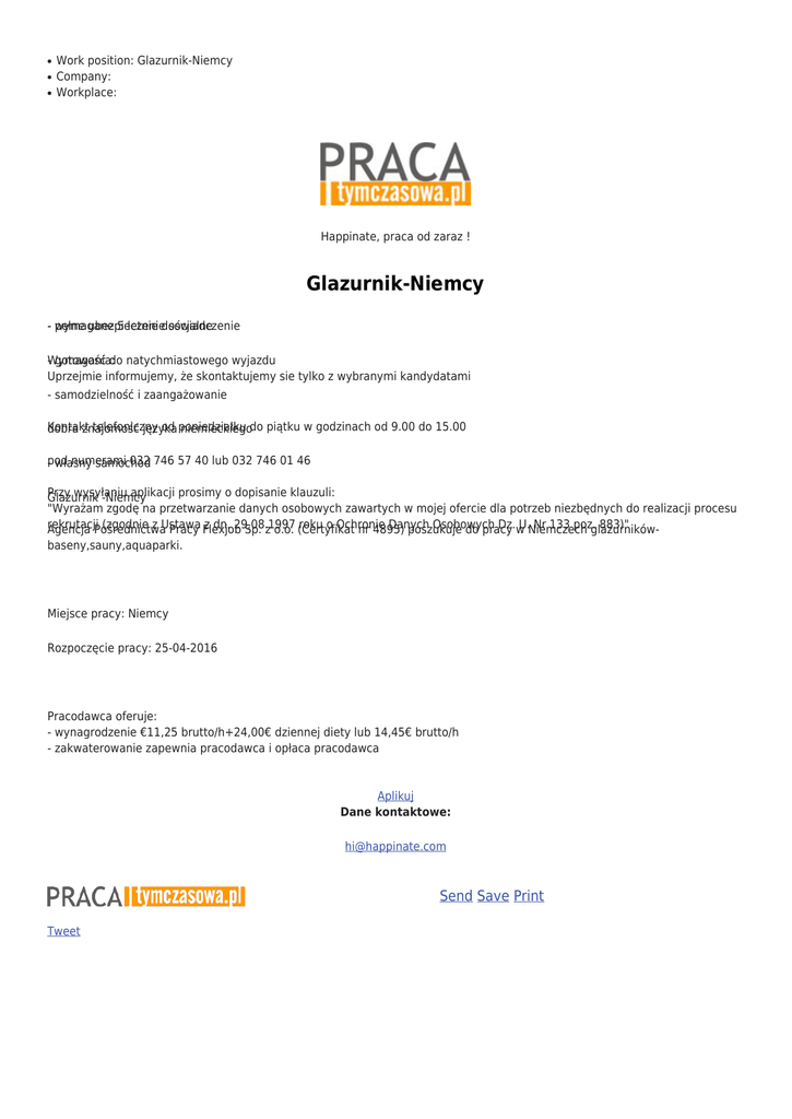 ● ● ● Work position: Glazurnik-Niemcy Company: Workplace: Happinate, praca od zaraz ! Glazurnik-Niemcy - pełne wymagane ubezpieczenie 5 letnie doświadczenie socjalne - gotowość do natychmiastowego wyjazdu Wymagania: Uprzejmie informujemy, że skontaktujemy sie tylko z wybranymi kandydatami - samodzielność i zaangażowanie Kontakt telefoniczny od poniedziałku dobra znajomość języka niemieckiegodo piątku w godzinach od 9.00 do 15.00 pod numerami 032 746 57 40 lub 032 746 01 46 - własny samochod Przy wysyłaniu aplikacji prosimy o dopisanie klauzuli: Glazurnik -Niemcy "Wyrażam zgodę na przetwarzanie danych osobowych zawartych w mojej ofercie dla potrzeb niezbędnych do realizacji procesu rekrutacji (zgodnie z Ustawa z dn. 29.08.1997 roku o Ochronie Danych Osobowych Dz. wU.Niemczech Nr 133 poz.glazurników883)" Agencja Pośrednictwa Pracy Flexjob Sp. z o.o. (Certyfikat nr 4895) poszukuje do pracy baseny,sauny,aquaparki. Miejsce pracy: Niemcy Rozpoczęcie pracy: 25-04-2016 Pracodawca oferuje: - wynagrodzenie €11,25 brutto/h+24,00€ dziennej diety lub 14,45€ brutto/h - zakwaterowanie zapewnia pracodawca i opłaca pracodawca Aplikuj Dane kontaktowe: [email protected] Send Save Print Tweet