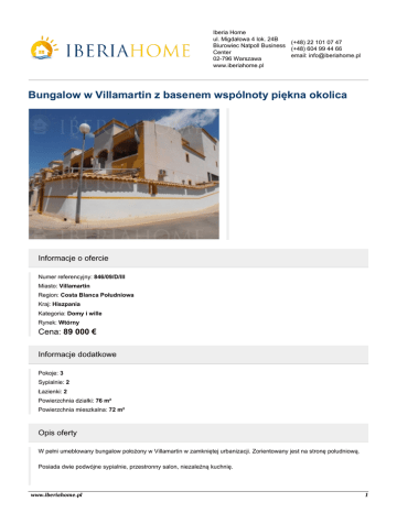 Iberia Home ul. Migdałowa 4 lok. 24B (+48) 22 101 07 47 Biurowiec Natpoll Business (+48) 604 99 44 66 Center email: [email protected] 02-796 Warszawa www.iberiahome.pl Bungalow w Villamartin z basenem wspólnoty piękna okolica Informacje o ofercie Numer referencyjny: 846/09/D/III Miasto: Villamartin Region: Costa Blanca Południowa Kraj: Hiszpania Kategoria: Domy i wille Rynek: Wtórny Cena: 89 000 € Informacje dodatkowe Pokoje: 3 Sypialnie: 2 Łazienki: 2 Powierzchnia działki: 76 m² Powierzchnia mieszkalna: 72 m² Opis oferty W pełni umeblowany bungalow położony w Villamartin w zamkniętej urbanizacji. Zorientowany jest na stronę południową. Posiada dwie podwójne sypialnie, przestronny salon, niezależną kuchnię. www.iberiahome.pl 1 W pobliżu znajduje się centrum, gdzie są restauracje, sklepy, apteka. Do centrum handlowego La Zenia jest 1,5km. Do plaż Orihuela Costa 3km. Wewnątrz jest klimatyzacja. Na terenie wspólnoty znajduje się basen. Udogodnienia ● Basen wspólnoty ● Taras ● Umeblowany ● Pole golfowe ● Oddzielna kuchnia ● Miejsce parkingowe ● Klimatyzacja ● Ogródek www.iberiahome.pl 2