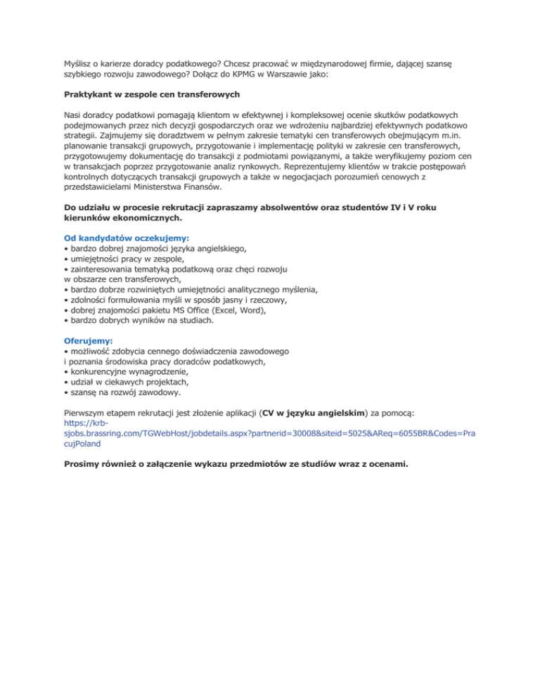 Myślisz o karierze doradcy podatkowego? Chcesz pracować w międzynarodowej firmie, dającej szansę szybkiego rozwoju zawodowego? Dołącz do KPMG w Warszawie jako: Praktykant w zespole cen transferowych Nasi doradcy podatkowi pomagają klientom w efektywnej i kompleksowej ocenie skutków podatkowych podejmowanych przez nich decyzji gospodarczych oraz we wdrożeniu najbardziej efektywnych podatkowo strategii. Zajmujemy się doradztwem w pełnym zakresie tematyki cen transferowych obejmującym m.in. planowanie transakcji grupowych, przygotowanie i implementację polityki w zakresie cen transferowych, przygotowujemy dokumentację do transakcji z podmiotami powiązanymi, a także weryfikujemy poziom cen w transakcjach poprzez przygotowanie analiz rynkowych. Reprezentujemy klientów w trakcie postępowań kontrolnych dotyczących transakcji grupowych a także w negocjacjach porozumień cenowych z przedstawicielami Ministerstwa Finansów. Do udziału w procesie rekrutacji zapraszamy absolwentów oraz studentów IV i V roku kierunków ekonomicznych. Od kandydatów oczekujemy: • bardzo dobrej znajomości języka angielskiego, • umiejętności pracy w zespole, • zainteresowania tematyką podatkową oraz chęci rozwoju w obszarze cen transferowych, • bardzo dobrze rozwiniętych umiejętności analitycznego myślenia, • zdolności formułowania myśli w sposób jasny i rzeczowy, • dobrej znajomości pakietu MS Office (Excel, Word), • bardzo dobrych wyników na studiach. Oferujemy: • możliwość zdobycia cennego doświadczenia zawodowego i poznania środowiska pracy doradców podatkowych, • konkurencyjne wynagrodzenie, • udział w ciekawych projektach, • szansę na rozwój zawodowy. Pierwszym etapem rekrutacji jest złożenie aplikacji (CV w języku angielskim) za pomocą: https://krbsjobs.brassring.com/TGWebHost/jobdetails.aspx?partnerid=30008&siteid=5025&AReq=6055BR&Codes=Pra cujPoland Prosimy również o załączenie wykazu przedmiotów ze studiów wraz z ocenami.