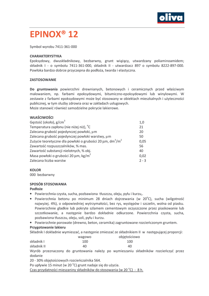 EPINOX® 12 Symbol wyrobu 7411-361-000 CHARAKTERYSTYKA Epoksydowy, dwuskładnikowy, bezbarwny, grunt wiążący, utwardzany poliaminoamidem; składnik I - o symbolu 7411-361-000, składnik II - utwardzacz 897 o symbolu 8222-897-000. Powłoka bardzo dobrze przyczepna do podłoża, twarda i elastyczna. ZASTOSOWANIE Do gruntowania powierzchni drewnianych, betonowych i ceramicznych przed właściwym malowaniem, np. farbami epoksydowymi, bitumiczno-epoksydowymi lub winylowymi. W zestawie z farbami epoksydowymi może być stosowany w obiektach mieszkalnych i użyteczności publicznej, w tym służby zdrowia oraz w zakładach usługowych. Może stanowić również samodzielne pokrycie lakierowe. WŁAŚCIWOŚCI Gęstość (około), g/cm3 Temperatura zapłonu (nie niżej niż), oC Zalecana grubość pojedynczej powłoki, µm Zalecana grubość pojedynczej powłoki warstwy, µm Zużycie teoretyczne dla powłoki o grubości 20 µm, dm3/m2 Zawartość rozpuszczalników, % mas. Zawartość substancji nielotnych, % obj. Masa powłoki o grubości 20 µm, kg/m2 Zalecana liczba warstw 1,0 21 20 50 0,05 56 40 0,02 2-3 KOLOR 000 bezbarwny SPOSÓB STOSOWANIA Podłoże • Powierzchnia czysta, sucha, pozbawiona tłuszczu, oleju, pyłu i kurzu,. • Powierzchnia betonu po minimum 28 dniach dojrzewania (w 20oC), sucha (wilgotność najwyżej. 4%), o odpowiedniej wytrzymałości, bez rys, występów i szczelin, wolna od piasku. Powierzchnie gładkie lub pokryte szlamem cementowym oczyszczone przez piaskowanie lub szczotkowanie, a następnie bardzo dokładnie odkurzone. Powierzchnia czysta, sucha, pozbawiona tłuszczu, oleju, soli, pyłu i kurzu. • Powierzchnie porowate (drewno, beton, ceramika) zagruntowane rozcieńczonym gruntem. Przygotowanie lakieru Składnik I dokładnie wymieszać, a następnie zmieszać ze składnikiem II w następującej proporcji: wagowo objętościowo składnik I 100 100 składnik II 40 40 Wyrób przeznaczony do gruntowania należy po wymieszaniu składników rozcieńczyć przez dodanie 20 - 30% objętościowych rozcieńczalnika 564. o Po upływie 15 minut (w 20 C) grunt nadaje się do użycia. Czas przydatności mieszaniny składników do stosowania (w 20 oC) - 8 h. EPINOX 12 Metoda nakładania Natrysk bezpowietrzny, pędzel. Parametry natrysku bezpowietrznego: średnica dyszy ciśnienie w dyszy 0,33 - 0,43 mm 10 - 12 MPa Rozcieńczalnik 564 o symbolu 8154-564-000. Rozpuszczalnik do mycia aparatury: rozcieńczalnik 564. Warunki podczas malowania i utwardzania powłoki: o o - minimalna temperatura podłoża +5 C oraz co najmniej 3 C wyższa od temperatury punktu rosy, - wilgotność względna powietrza najwyżej 85%, - dobra wentylacja. Czas schnięcia (w 20o): stopień 1 - 1 h, stopień 6 - 24 h, do nałożenia kolejnych warstw: najkrótszy - 8 h, najdłuższy - 3 dni, do szlifowania: najkrótszy - 24 h. Podane czasy dotyczą powłoki o zalecanej grubości, schnącej w warunkach dobrej wentylacji. Czasy te mogą ulec zmianie wraz ze zmianą temperatury, warunków wentylacji, ilości warstw i grubości pokrycia. Czas pełnego utwardzenia powłoki: w 20 oC - 7 dni, w 10 oC - 14 dni. Następne wymalowania Farby epoksydowe, poliuretanowe i winylowe OLIVA. INFORMACJA DODATKOWA • Przy wymalowaniach dekoracyjnych każdą wyschniętą warstwę, przed nałożeniem następnej, należy przeszlifować w celu uzyskania gładkiej powierzchni i dobrej przyczepności kolejnej powłoki. Resztki pyłu po szlifowaniu należy dokładnie usunąć. • Pomieszczenia zamknięte podczas i po malowaniu należy starannie wietrzyć do zaniku zapachu, a po tym okresie można oddać je do użytku. TRWAŁOŚĆ WYROBU: 9 miesięcy od daty produkcji. UWAGA! W czasie aplikacji i schnięcia powłoki wydzielają się palne i szkodliwe dla zdrowia substancje. Należy unikać wdychania par i mgły produktu oraz kontaktu wyrobu z oczami i skórą. Stosować tylko w dobrze wentylowanych pomieszczeniach. Szczegółowe informacje na temat substancji niebezpiecznych zawartych w wyrobach i związanych z nimi zagrożeń podane są w kartach charakterystyki substancji niebezpiecznych, które udostępniamy na życzenie naszych Klientów. 7421-101-XX0 Październik 2003 © by OLIVA Informacje w instrukcji, oparte na badaniach laboratoryjnych i naszym doświadczeniu, podajemy z zamiarem ułatwienia pracy naszym Klientom. Odstępstwa od instrukcji prosimy uzgadniać z serwisem technicznym OLIVA. Określenia techniczne zawarte w instrukcji objaśniono we wstępie do katalogu. Zastrzegamy sobie prawo do zmiany instrukcji bez uprzedniego zawiadomienia.