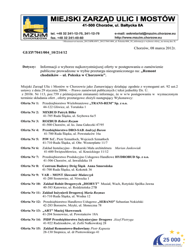 \\Mzuimserver\mzuim_2012\SPRAWY_2012\7041\004_ul. Poleska\004_10_informacja o wyborze oferty_na stronę.doc JL Chorzów, 08 marca 2012r. GI/ZP/7041/004_10/214/12 Dotyczy: Informacji o wyborze najkorzystniejszej oferty w postępowaniu o zamówienie publiczne prowadzone w trybie przetargu nieograniczonego na: „Remont chodników – ul. Poleska w Chorzowie”. Miejski Zarząd Ulic i Mostów w Chorzowie jako Zamawiający działając zgodnie z wymogami art. 92 ust.2 ustawy z dnia 29 stycznia 2004r. – Prawo zamówień publicznych ( tekst jednolity Dz. U. z 2010r. Nr 113, poz.759 z późniejszymi zmianami) informuje, Ŝe w w/w postępowaniu w wyznaczonym terminie składania ofert , oferty przetargowe złoŜyli następujący Wykonawcy: Oferta Nr 1: Przedsiębiorstwo WielobranŜowe „TRANS-REM” Sp. z o.o. 44-122 Gliwice, ul. Toruńska 1 Oferta Nr 2: MIXBUD Patryk Bilke 41-705 Ruda Śląska, ul. Szybowa 6a/5 Oferta Nr 3: ROZBUD Robert Rozum 41-500 Chorzów, ul. ks. Jana Gałeczki 47/95 Oferta Nr 4: Przedsiębiorstwo DRO-SAB Andrzej Buron 41-700 Ruda Śląska, ul. Powstańców 16a Oferta Nr 5: PiW S.C. Piotr Szmatłoch, Wojciech Szmatłoch 41-710 Ruda Śląska, ul. Obr. Westerplatte 11/7 Oferta Nr 6: Zakład Instalacyjno – Brukarski Mała architektura Marian Jankowiak 41-600 Świętochłowice, ul. Krasickiego 11/12 Oferta Nr 7: Przedsiębiorstwo Produkcyjno Usługowo Handlowe HYDROBUD Sp. z o.o. 41-506 Chorzów, ul. Inwalidzka 18 Oferta Nr 8: Centrum Budowy Dróg Śląsk Anna Smorońska 41-700 Ruda Śląska, ul. Kokotek 36 Oferta Nr 9: VAR – MONT Sławomir Mularczyk 41-200 Sosnowiec, ul. Niwecka 1 Oferta Nr 10: Zakład Robót Drogowych „DIORYT” Musiał, Wach, Rotyński Spółka Jawna 40-383 Katowice, ul. Roździeńska 27B Oferta Nr 11: Zakład InŜynierii Drogowej Maria Rozmus 41-710 Ruda Śląska, ul. Wodna 12 Oferta Nr 12: Przedsiębiorstwo Handlowo Usługowe „SEBANO” Sebastian Nokielski 42-283 Boronów, Mzyki, ul. Słoneczna 78 Oferta Nr 13: „ART” Maciej Skowronek 41-204 Sosnowiec, ul. Powstańców 18A Oferta Nr 14: PIDP Przedsiębiorstwo InŜynieryjno- Drogowe Józef Pietryga 41-922 Radzionków, ul. Zofii Nałkowskiej 28 Oferta Nr 15: Zakład Remontowo-Budowlany Piotr Kapusta 28-130 Stopnica, ul. dr Piotrowskiego 41 Oferta Nr 16: ZUBIT ZABRZE Sp. z o.o. 41-819 Zabrze, ul. Trocera 21 Oferta Nr 17: REM-DRÓG Sp. z o.o. 41-500 Chorzów, ul. Wiejska 18 Oferta Nr 18: MPGKiM Sp. z o.o. 41-100 Siemianowice, ul. Śmiłowskiego 15 Oferta Nr 19: PPHU „INSTAL-BUDOTECH” Gorol Jan 42-287 Kamienica, ul. Częstochowska 38c Oferta Nr 20: Firma „BRUK KOMPLEX” Łukasz Sitek 42-283 Boronów, ul. Niwska 27B Oferta Nr 21: PS-INVEST Piotr Skowronek 42-584 Wymysłów, ul. Sienkiewicza 36 Do realizacji w.w. zamówienia wybrana została oferta Nr 7 złoŜona przez: Przedsiębiorstwo Produkcyjno Usługowo Handlowe HYDROBUD Sp. z o.o., 41-506 Chorzów, ul. Inwalidzka 18 Uzasadnienie wyboru: Wybrana oferta odpowiada zasadom określonym w ustawie – Prawo zamówień publicznych i wymogom SIWZ oraz przedstawiała najkorzystniejszą cenę uzyskując najwyŜszą ilość punktów. 2. Streszczenie oceny i porównanie złoŜonych ofert ( nie podlegających odrzuceniu) Nr oferty 1 2 3 4 5 6 7 8 9 10 11 12 13 14 15 16 17 18 19 20 21 Liczba pkt w kryterium Cena (waga 100% - max 100pkt) Razem 66,52 65,38 76,74 54,29 71,89 74,63 100,00 70,44 66,26 57,94 62,02 69,18 86,27 54,70 58,74 62,36 58,54 70,77 66,76 82,31 ................... 66,52 65,38 76,74 54,29 71,89 74,63 100,00 70,44 66,26 57,94 62,02 69,18 86,27 54,70 58,74 62,36 58,54 70,77 66,76 82,31 .................... Zamawiający: ………………………. Dyrektor MZUiM mgr inŜ. Piotr Wojtala 2