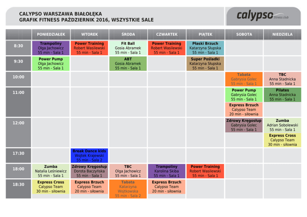 CALYPSO WARSZAWA BIAŁOŁĘKA GRAFIK FITNESS PAŹDZIERNIK 2016, WSZYSTKIE SALE 8:30 9:30 PONIEDZIAŁEK WTOREK ŚRODA CZWARTEK PIĄTEK Trampoliny Olga Jachowicz 55 min - Sala 1 Power Training Robert Wasilewski 55 min - Sala 1 Fit Ball Gosia Abramek 55 min - Sala 1 Power Training Robert Wasilewski 55 min - Sala 1 Płaski Brzuch Katarzyna Słupska 55 min - Sala 1 Power Pump Olga Jachowicz 55 min - Sala 1 ABT Gosia Abramek 55 min - Sala 1 SOBOTA NIEDZIELA Tabata Gabrysia Golec 55 min - Sala 1 TBC Anna Stadnicka 55 min - Sala 1 Power Pump Gabrysia Golec 55 min - Sala 1 Pilates Anna Stadnicka 55 min - Sala 1 Super Pośladki Katarzyna Słupska 55 min - Sala 1 10:00 11:00 Express Brzuch Calypso Team 20 min - siłownia Zdrowy Kręgosłup Gabrysia Golec 55 min - Sala 1 12:00 Zumba Adrian Sobolewski 55 min - Sala 1 Express Cross Calypso Team 30 min - siłownia Break Dance kids Wojtek Krajewski 55 min - Sala 2 17:30 18:00 18:30 Zumba Natalia Leśniewicz 55 min - Sala 1 Zdrowy Kręgosłup Dorota Baczyńska 55 min - Sala 1 TBC Olga Jachowicz 55 min - Sala 1 Trampoliny Karolina Skiba 55 min - Sala 1 Express Cross Calypso Team 30 min - siłownia Express Brzuch Calypso Team 20 min - siłownia Tabata Katarzyna Wojtkowska 55 min - Sala 2 Express Brzuch Calypso Team 20 min - siłownia Power Training Robert Wasilewski 55 min - Sala 1 19:00 19:30 TBC Ula Piątkowska 55 min - Sala 1 TBC Dorota Baczyńska 55 min - Sala 1 Power Bike Paweł Kwaśniewski 90 min - Sala 2 Power Bike Katarzyna Kantek 55 min - Sala 2 Express Brzuch Calypso Team 20 min - siłownia Express Cross Calypso Team 30 min - siłownia Trampoliny Olga Jachowicz 55 min - Sala 1 Pilates Karolina Skiba 55 min - Sala 1 Power Bike Katarzyna Kantek 55 min - Sala 2 Joga Marcelina Sankowska 90 min - Sala 2 Express Cross Calypso Team 30 min - siłownia Express Brzuch Calypso Team 20 min - siłownia 20:00 21:00 Zdrowy Kręgosłup Ula Piątkowska 55 min - Sala 1 Kick Boxing Andrzej Nastula 90 min - Sala 1 Trampoliny Dorota Baczyńska 55 min - Sala 1 Salsation Ola Nadaj 55 min - Sala 1 Stretching Olga Jachowicz 55 min - Sala 1 Kick Boxing Andrzej Nastula 90 min - Sala 1 Joga Marcelina Sankowska 90 min - Sala 2 Express Brzuch Calypso Team 20 min - siłownia TBC Karolina Skiba 55 min - Sala 1 Trampoliny Ola Nadaj 55 min - Sala 1 Pilates Anna Stadnicka 55 min - Sala 1