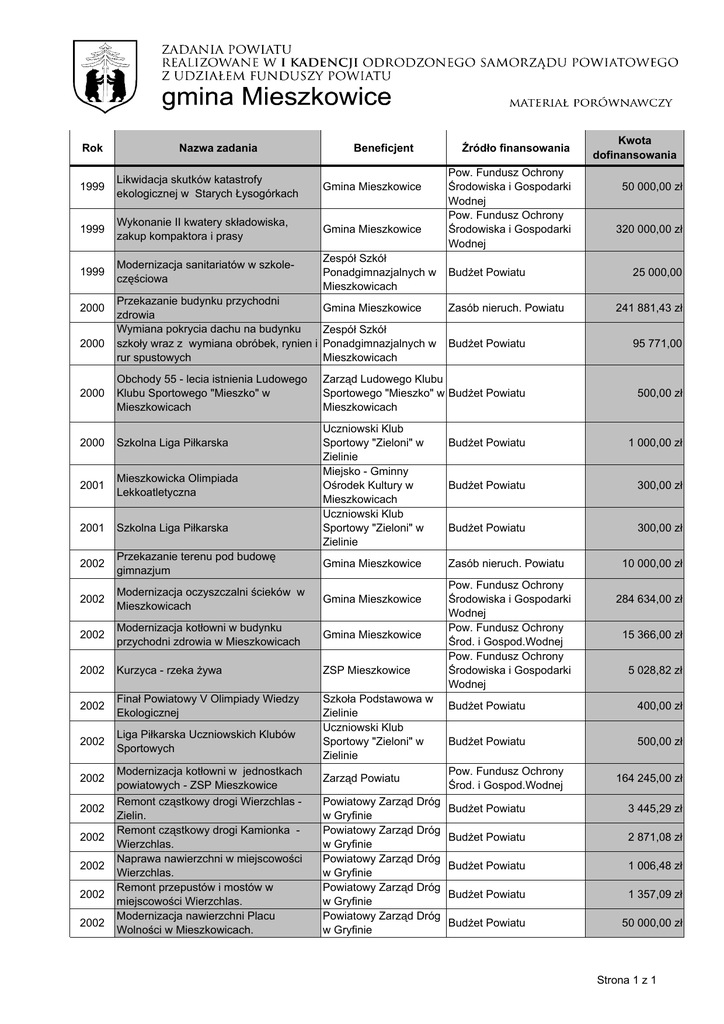 Rok Nazwa zadania Beneficjent Źródło finansowania Pow. Fundusz Ochrony Środowiska i Gospodarki Wodnej Pow. Fundusz Ochrony Środowiska i Gospodarki Wodnej Kwota dofinansowania 1999 Likwidacja skutków katastrofy ekologicznej w Starych Łysogórkach Gmina Mieszkowice 1999 Wykonanie II kwatery składowiska, zakup kompaktora i prasy Gmina Mieszkowice 1999 Modernizacja sanitariatów w szkoleczęściowa Zespół Szkół Ponadgimnazjalnych w Mieszkowicach Budżet Powiatu Gmina Mieszkowice Zasób nieruch. Powiatu Zespół Szkół Ponadgimnazjalnych w Mieszkowicach Budżet Powiatu 95 771,00 Zarząd Ludowego Klubu Sportowego "Mieszko" w Budżet Powiatu Mieszkowicach 500,00 zł 2000 2000 Przekazanie budynku przychodni zdrowia Wymiana pokrycia dachu na budynku szkoły wraz z wymiana obróbek, rynien i rur spustowych 2000 Obchody 55 - lecia istnienia Ludowego Klubu Sportowego "Mieszko" w Mieszkowicach 2000 Szkolna Liga Piłkarska 2001 Mieszkowicka Olimpiada Lekkoatletyczna 2001 Szkolna Liga Piłkarska 2002 50 000,00 zł 320 000,00 zł 25 000,00 241 881,43 zł Uczniowski Klub Sportowy "Zieloni" w Zielinie Miejsko - Gminny Ośrodek Kultury w Mieszkowicach Uczniowski Klub Sportowy "Zieloni" w Zielinie Budżet Powiatu 1 000,00 zł Budżet Powiatu 300,00 zł Budżet Powiatu 300,00 zł Przekazanie terenu pod budowę gimnazjum Gmina Mieszkowice Zasób nieruch. Powiatu 2002 Modernizacja oczyszczalni ścieków w Mieszkowicach Gmina Mieszkowice 2002 Modernizacja kotłowni w budynku przychodni zdrowia w Mieszkowicach Gmina Mieszkowice 2002 Kurzyca - rzeka żywa ZSP Mieszkowice 2002 Finał Powiatowy V Olimpiady Wiedzy Ekologicznej 2002 Liga Piłkarska Uczniowskich Klubów Sportowych Szkoła Podstawowa w Zielinie Uczniowski Klub Sportowy "Zieloni" w Zielinie 2002 2002 2002 2002 2002 2002 Modernizacja kotłowni w jednostkach powiatowych - ZSP Mieszkowice Remont cząstkowy drogi Wierzchlas Zielin. Remont cząstkowy drogi Kamionka Wierzchlas. Naprawa nawierzchni w miejscowości Wierzchlas. Remont przepustów i mostów w miejscowości Wierzchlas. Modernizacja nawierzchni Placu Wolności w Mieszkowicach. Zarząd Powiatu Powiatowy Zarząd Dróg w Gryfinie Powiatowy Zarząd Dróg w Gryfinie Powiatowy Zarząd Dróg w Gryfinie Powiatowy Zarząd Dróg w Gryfinie Powiatowy Zarząd Dróg w Gryfinie Pow. Fundusz Ochrony Środowiska i Gospodarki Wodnej Pow. Fundusz Ochrony Środ. i Gospod.Wodnej Pow. Fundusz Ochrony Środowiska i Gospodarki Wodnej 10 000,00 zł 284 634,00 zł 15 366,00 zł 5 028,82 zł Budżet Powiatu 400,00 zł Budżet Powiatu 500,00 zł Pow. Fundusz Ochrony Środ. i Gospod.Wodnej 164 245,00 zł Budżet Powiatu 3 445,29 zł Budżet Powiatu 2 871,08 zł Budżet Powiatu 1 006,48 zł Budżet Powiatu 1 357,09 zł Budżet Powiatu 50 000,00 zł Strona 1 z 1