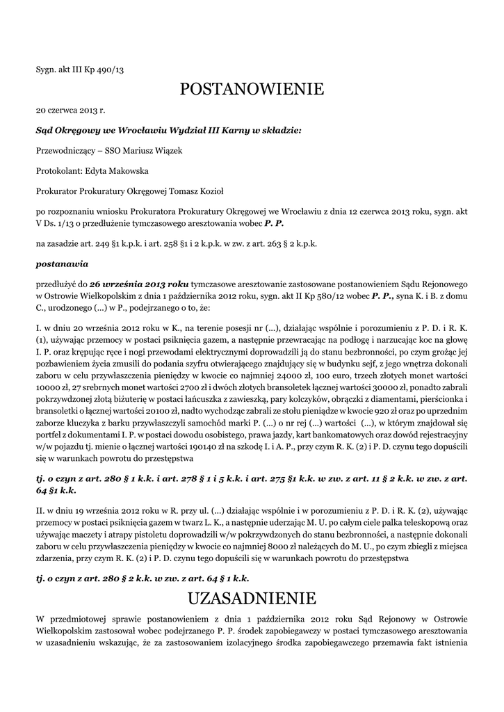 Sygn. akt III Kp 490/13 POSTANOWIENIE 20 czerwca 2013 r. Sąd Okręgowy we Wrocławiu Wydział III Karny w składzie: Przewodniczący – SSO Mariusz Wiązek Protokolant: Edyta Makowska Prokurator Prokuratury Okręgowej Tomasz Kozioł po rozpoznaniu wniosku Prokuratora Prokuratury Okręgowej we Wrocławiu z dnia 12 czerwca 2013 roku, sygn. akt V Ds. 1/13 o przedłużenie tymczasowego aresztowania wobec P. P. na zasadzie art. 249 §1 k.p.k. i art. 258 §1 i 2 k.p.k. w zw. z art. 263 § 2 k.p.k. postanawia przedłużyć do 26 września 2013 roku tymczasowe aresztowanie zastosowane postanowieniem Sądu Rejonowego w Ostrowie Wielkopolskim z dnia 1 października 2012 roku, sygn. akt II Kp 580/12 wobec P. P., syna K. i B. z domu C., urodzonego (...) w P., podejrzanego o to, że: I. w dniu 20 września 2012 roku w K., na terenie posesji nr (...), działając wspólnie i porozumieniu z P. D. i R. K. (1), używając przemocy w postaci psiknięcia gazem, a następnie przewracając na podłogę i narzucając koc na głowę I. P. oraz krępując ręce i nogi przewodami elektrycznymi doprowadzili ją do stanu bezbronności, po czym grożąc jej pozbawieniem życia zmusili do podania szyfru otwierającego znajdujący się w budynku sejf, z jego wnętrza dokonali zaboru w celu przywłaszczenia pieniędzy w kwocie co najmniej 24000 zł, 100 euro, trzech złotych monet wartości 10000 zł, 27 srebrnych monet wartości 2700 zł i dwóch złotych bransoletek łącznej wartości 30000 zł, ponadto zabrali pokrzywdzonej złotą biżuterię w postaci łańcuszka z zawieszką, pary kolczyków, obrączki z diamentami, pierścionka i bransoletki o łącznej wartości 20100 zł, nadto wychodząc zabrali ze stołu pieniądze w kwocie 920 zł oraz po uprzednim zaborze kluczyka z barku przywłaszczyli samochód marki P. (...) o nr rej (...) wartości (...), w którym znajdował się portfel z dokumentami I. P. w postaci dowodu osobistego, prawa jazdy, kart bankomatowych oraz dowód rejestracyjny w/w pojazdu tj. mienie o łącznej wartości 190140 zł na szkodę I. i A. P., przy czym R. K. (2) i P. D. czynu tego dopuścili się w warunkach powrotu do przestępstwa tj. o czyn z art. 280 § 1 k.k. i art. 278 § 1 i 5 k.k. i art. 275 §1 k.k. w zw. z art. 11 § 2 k.k. w zw. z art. 64 §1 k.k. II. w dniu 19 września 2012 roku w R. przy ul. (...) działając wspólnie i w porozumieniu z P. D. i R. K. (2), używając przemocy w postaci psiknięcia gazem w twarz L. K., a następnie uderzając M. U. po całym ciele palka teleskopową oraz używając maczety i atrapy pistoletu doprowadzili w/w pokrzywdzonych do stanu bezbronności, a następnie dokonali zaboru w celu przywłaszczenia pieniędzy w kwocie co najmniej 8000 zł należących do M. U., po czym zbiegli z miejsca zdarzenia, przy czym R. K. (2) i P. D. czynu tego dopuścili się w warunkach powrotu do przestępstwa tj. o czyn z art. 280 § 2 k.k. w zw. z art. 64 § 1 k.k. UZASADNIENIE W przedmiotowej sprawie postanowieniem z dnia 1 października 2012 roku Sąd Rejonowy w Ostrowie Wielkopolskim zastosował wobec podejrzanego P. P. środek zapobiegawczy w postaci tymczasowego aresztowania w uzasadnieniu wskazując, że za zastosowaniem izolacyjnego środka zapobiegawczego przemawia fakt istnienia dużego prawdopodobieństwa, że podejrzany dopuścił się zarzucanych mu czynów, jak również realna zarówno obawa ukrywania się podejrzanego jak i utrudniania przez niego prowadzonego postępowania. Nie dopatrzono się przy tym istnienia przesłanek określonych w art. 259 k.p.k., które uzasadniałyby odstąpienie od stosowania tego środka. Z uwagi na wielość czynności procesowych, które należy jeszcze w sprawie wykonać, śledztwa nie zdołano ukończyć przed upływem terminu zastosowanego środka zapobiegawczego. Sąd Okręgowy uznał, że fakt popełnienia przez podejrzanego zarzucanych mu przestępstw jest w znacznym stopniu uprawdopodobniony zebranym w sprawie materiałem dowodowym, w szczególności za jego sprawstwem przemawiają wyniki dotychczas przeprowadzonego postępowania dowodowego, w szczególności: wyniki przeszukań, oględzin, zabezpieczone dowody rzeczowe, zeznania świadków, wyjaśnienia współpodejrzanych, jak również częściowo wyjaśnienia samego podejrzanego. W ocenie Sądu ww. materiał dowodowy, zgodnie z brzmieniem art. 249 § 1 k.p.k. uzasadnia potrzebę stosowania środka zapobiegawczego w postaci tymczasowego aresztowania wobec podejrzanego. Za stosowaniem wobec P. P. najsurowszego ze środków zapobiegawczych przewidzianych przez k.p.k. przemawia fakt, iż realna jest obawa ucieczki bądź ukrycia się podejrzanego, w szczególności wziąwszy pod uwagę charakter i okoliczności popełnienia zarzucanych podejrzanemu czynów. W przypadku odstąpienia na obecnym etapie postępowania od stosowania izolacyjnego środka zapobiegawczego zachodzi również, w ocenie sądu, wysokie prawdopodobieństwo podjęcia przez podejrzanego działań zmierzających do utrudniania toczącego się postępowania, chociażby poprzez nakłanianie świadków do składania fałszywych zeznań. W terminie zakreślonym obecnie okresem tymczasowego aresztowania nie udało się zakończyć postępowania przygotowawczego. W dalszym toku postępowania niezbędne jest przeprowadzenie kolejnych czynności procesowych, w tym należy uzyskać opinię biegłych z zakresu serologii, badania broni i balistyki, informatyki oraz z zakresu fizykochemii. Ponadto konieczne przesłuchanie pozostałych świadków a zwłaszcza S. S. w celu sprawdzenia linii obrony P. P., a także przeprowadzenie konfrontacji pomiędzy P. P. w R. K. (2) i P. D.. W zależności od wyników wskazanych czynności niezbędne będzie przeprowadzenie kolejnych czynności śledztwa bądź przeprowadzenie czynności zaznajomienia się podejrzanych i ich obrońców z materiałami postępowania przygotowawczego. Nadto należy zauważyć, że podejrzanemu zarzuca się popełnienie przestępstw zagro