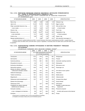 HOUSEHOLD BUDGETS 174 TABL. 4(108). PRZECIĘTNE MIESIĘCZNE SPOŻYCIE NIEKTÓRYCH ARTYKUŁÓW ŻYWNOŚCIOWYCH NA 1 OSOBĘ W GOSPODARSTWACH DOMOWYCH (dok.) AVERAGE MONTHLY PER CAPITA CONSUMPTION OF SELECTED FOODSTUFFS OF HOUSEHOLDS (cont.) WYSZCZEGÓLNIENIE 2000 2005 2008 2009 SPECIFICATION Sery w kg .......................................... 0,86 0,96 0,96 1,03 Jaja w szt .......................................... 14,24 14,76 12,06 11,87 Oleje i pozostałe tłuszcze w kg......... 1,60 1,61 1,44 1,41 w tym masło .................................. 0,23 0,29 0,27 0,26 Owoce w kg ..................................... 3,90 3,50 3,44 3,53 Fruit in kg Warzywa w kg .................................. 13,46 12,35 10,35 9,87 Vegetables in kg w tym ziemniaki.............................. 7,81 6,46 5,22 4,74 Cukier w kg ....................................... 1,64 1,42 1,25 1,20 Sugar in kg . 5,68 7,55 8,31 Non-alcoholic beverages in l Napoje bezalkoholowe w l............... a b Cheese in kg Eggs in pieces Oils and fats in kg of which butter of which potatoes a Łącznie z nasionami i pestkami jadalnymi (do 2004 r. w grupie Warzywa). b Bez nasion i pestek jadalnych (do 2004 r. w grupie Warzywa). a Including seeds and edible stones (until 2004 within a group of vegetables). b Excluding seeds and edible stones (until 2004 within a group of vegetables). TABL. 5(109). GOSPODARSTWA DOMOWE WYPOSAŻONE W NIEKTÓRE PRZEDMIOTY TRWAŁEGO a UŻYTKOWANIA HOUSEHOLDS FURNISHED WITH SELECTED DURABLE GOODS 2000 WYSZCZEGÓLNIENIE 2005 2008 a 2009 w % ogółu gospodarstw domowych in % of total households SPECIFICATION Chłodziarka ....................................... 97,0 97,5 97,9 98,1 Refrigerator Zamrażarka ....................................... 37,9 28,7 29,2 33,2 Freezer Automat pralniczy ............................. 77,8 86,1 88,3 92,4 Automatic washing machine Zmywarka do naczyń ........................ 2,9 5,1 11,8 15,9 Dishwasher Kuchenka mikrofalowa...................... 17,8 34,4 46,9 50,7 Microwave oven Samochód osobowy ......................... 42,0 41,2 48,7 55,6 Passenger car Zestaw do odbioru, rejestracji i odtwarzania dźwięku (wieża) ....... 37,8 44,7 43,1 43,7 Hi-fi stereo music system Odbiornik telewizyjny ........................ 98,3 97,0 97,4 98,1 Television Telefon komórkowy ........................... 15,7 62,3 81,3 85,5 Mobile phone Magnetowid....................................... 50,6 43,7 28,0 25,9 Videorecorder Odtwarzacz płyt kompaktowych ....... 10,7 10,7 14,9 15,2 Compact disc player Zestaw kina domowego .................... . . 15,2 17,8 Home theater Odtwarzacz DVD .............................. . 23,7 48,9 53,3 DVD player Urządzenie do odbioru telewizji satelitarnej lub kablowej ................. 46,5 46,6 55,8 59,4 Satellite or cable television equipment Komputer osobisty ............................ 16,4 38,8 55,4 59,8 Personal computer w tym z dostępem do Internetu ..... 5,6 22,7 46,4 53,6 Drukarka ........................................... 9,0 24,4 35,0 38,4 a Opracowano na podstawie stanu w końcu poszczególnych kwartałów. a Compiled on the basis of data at the end of individual quarters. of which with access to the Internet Printer