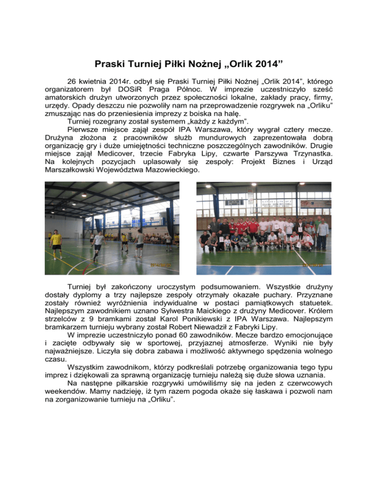 Praski Turniej Piłki Nożnej „Orlik 2014” 26 kwietnia 2014r. odbył się Praski Turniej Piłki Nożnej „Orlik 2014”, którego organizatorem był DOSiR Praga Północ. W imprezie uczestniczyło sześć amatorskich drużyn utworzonych przez społeczności lokalne, zakłady pracy, firmy, urzędy. Opady deszczu nie pozwoliły nam na przeprowadzenie rozgrywek na „Orliku” zmuszając nas do przeniesienia imprezy z boiska na halę. Turniej rozegrany został systemem „każdy z każdym”. Pierwsze miejsce zajął zespół IPA Warszawa, który wygrał cztery mecze. Drużyna złożona z pracowników służb mundurowych zaprezentowała dobrą organizację gry i duże umiejętności techniczne poszczególnych zawodników. Drugie miejsce zajął Medicover, trzecie Fabryka Lipy, czwarte Parszywa Trzynastka. Na kolejnych pozycjach uplasowały się zespoły: Projekt Biznes i Urząd Marszałkowski Województwa Mazowieckiego. Turniej był zakończony uroczystym podsumowaniem. Wszystkie drużyny dostały dyplomy a trzy najlepsze zespoły otrzymały okazałe puchary. Przyznane zostały również wyróżnienia indywidualne w postaci pamiątkowych statuetek. Najlepszym zawodnikiem uznano Sylwestra Maickiego z drużyny Medicover. Królem strzelców z 9 bramkami został Karol Ponikiewski z IPA Warszawa. Najlepszym bramkarzem turnieju wybrany został Robert Niewadził z Fabryki Lipy. W imprezie uczestniczyło ponad 60 zawodników. Mecze bardzo emocjonujące i zacięte odbywały się w sportowej, przyjaznej atmosferze. Wyniki nie były najważniejsze. Liczyła się dobra zabawa i możliwość aktywnego spędzenia wolnego czasu. Wszystkim zawodnikom, którzy podkreślali potrzebę organizowania tego typu imprez i dziękowali za sprawną organizację turnieju należą się duże słowa uznania. Na następne piłkarskie rozgrywki umówiliśmy się na jeden z czerwcowych weekendów. Mamy nadzieję, iż tym razem pogoda okaże się łaskawa i pozwoli nam na zorganizowanie turnieju na „Orliku”.