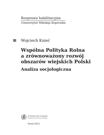 Rozprawa habilitacyjna Uniwersytet Mikołaja Kopernika Wojciech Knieć Wspólna Polityka Rolna a zrównoważony rozwój obszarów wiejskich Polski Analiza socjologiczna Toruń 2012 Spis treści Wstęp ........................................................................................................... 9 Uwagi metodologiczne ............................................................................ 15 Przegląd badań.......................................................................................... 23 Część 1. Rozwój zrównoważony. Konceptualizacja teoretyczna ...... 29 1.1. Konstruowanie koncepcji rozwoju zrównoważonego............ 30 1.2. Cechy i wymiary rozwoju zrównoważonego ........................... 36 1.3. Cele rozwoju zrównoważonego................................................. 40 1.4. Rozwój zrównoważony a ekorozwój ......................................... 42 1.5. Atrakcyjność poznawcza i krytyka koncepcji zrównoważonego rozwoju ......................................................... 43 1.6. Krytyka koncepcji zrównoważonego rozwoju ........................ 44 1.7. „Humanistyczny wymiar” zrównoważonego rozwoju ........... 45 1.8. Zrównoważony rozwój obszarów wiejskich ............................ 46 1.8.1. Koncepcje zrównoważonego rozwoju obszarów wiejskich ........................................................................... 47 1.8.2. Rolnictwo zrównoważone ............................................... 52 1.8.3. Koncepcja zrównoważonego rozwoju w dokumentach programowych absorpcji funduszy Wspólnej Polityki Rolnej w Polsce – deklaracje i realia ............................. 58 Część 2. Ewolucja Wspólnej Polityki Rolnej w kierunku zrównoważonego rozwoju obszarów wiejskich ................................... 65 2.1. Okres od połowy lat 50. do połowy lat 80. – paradygmat rolnictwa zależnego .................................................................... 69 2.2. Plan Mansholta ............................................................................ 73 2.3. Krytyka WPR z początków lat 90. – w tle czy u źródeł zmiany paradygmatu rozwoju obszarów wiejskich? .............. 77 2.4. Wielofunkcyjny rozwój wsi i rolnictwa – nowy paradygmat czy polityczny wybieg? ............................................................... 80 2.5. Reforma McSharry’ego – w stronę zrównoważonego rozwoju ......................................................................................... 82 6 Spis treści 2.6. Deklaracja z Cork........................................................................ 86 2.7. Nadkompensacja i nowa tożsamość rolników ........................ 87 2.8. Rozwój obszarów wiejskich jako realizacja interesów wsi i miasta – debata końca lat 90. i reforma Fischlera ................ 91 2.9. Health check z 2008 roku i poszukiwanie równowagi pomiędzy protekcjonizmem i agrocentryzmem a rozwojem obszarów wiejskich ..................................................................... 96 2.10. Nowe, nieznane wyzwania – unijna polityka rolna a zmiany klimatyczne.................................................................................. 99 2.11. Od presji industrializacyjnej po rozwój zrównoważony – podsumowanie .......................................................................... 103 Część 3. Od SAPARD-u do PROW-u. Wdrażanie mechanizmów Wspólnej Polityki Rolnej w Polsce – procesy i struktura ................. 107 3.1. Program SAPARD – efekt demonstracyjny ........................... 108 3.2. Programy poakcesyjne ............................................................. 118 3.2.1. Sektorowy Program Operacyjny „Restrukturyzacja i modernizacja sektora żywnościowego oraz rozwój obszarów wiejskich” i Plan Rozwoju Obszarów Wiejskich na lata 2004–2006........................................ 118 3.2.2. Dwoisty charakter wsparcia unijnego dla wsi i rolnictwa w Polsce oferowanego w latach 2004–2006 źródłem dysfunkcji.................................... 124 3.2.3. Program Rozwoju Obszarów Wiejskich na lata 2007–2013....................................................................... 126 3.2.4. Realizacja Wspólnej Polityki Rolnej – Polska na tle innych krajów Wspólnoty ............................................ 137 Część 4. Przegląd wybranych instrumentów Wspólnej Polityki Rolnej z perspektywy zrównoważonego rozwoju obszarów wiejskich .................................................................................................. 153 4.1. Program „Modernizacji gospodarstw rolnych” – w stronę zrównoważonego rolnictwa? ................................................... 153 4.1.1. „Zrównoważona” modernizacja gospodarstw ............ 157 4.1.2. „Kreatywne” aplikowanie o środki unijne i „pozorna synchronizacja strategii gospodarstw indywidualnych z założeniami WPR” ...................................................... 159 4.2. Niekorzystna struktura demograficzna i agrarna jako podłoże stosowania zachęt dla młodych rolników i rent strukturalnych ........................................................................... 170 4.2.1. Program zachęt finansowych dla młodych rolników ... 176 4.2.2. „Dziurawy płot” i dochodzenie do szczelności systemu ........................................................................... 177 4.2.3. Program rent strukturalnych ........................................ 184 7 Spis treści Renty strukturalne dla rolników – rozwiązania w Unii Europejskiej ................................................. 184 Zasady programu ............................................................ 187 4.3. Programy rolno-środowiskowe – w stronę zrównoważonej produkcji rolnej. Zrównoważone gospodarowanie w rolnictwie ............................................................................... 199 4.3.1. Dobra Praktyka Rolnicza – manifest zrównowa