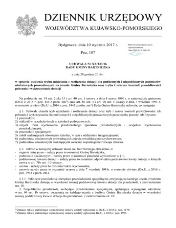 DZIENNIK URZĘDOWY WOJEWÓDZTWA KUJAWSKO-POMORSKIEGO Bydgoszcz, dnia 10 stycznia 2017 r. Elektronicznie podpisany przez: Agnieszka Makara Poz. 187 Data: 2017-01-10 10:03:10 UCHWAŁA Nr XX/133/16 RADY GMINY BARTNICZKA z dnia 29 grudnia 2016 r. w sprawie ustalenia trybu udzielania i rozliczania dotacji dla publicznych i niepublicznych podmiotów oświatowych prowadzonych na terenie Gminy Bartniczka oraz trybu i zakresu kontroli prawidłowości pobrania i wykorzystania dotacji Na podstawie art. 18 ust. 2 pkt 15 i art. 40 ust. 1 ustawy z dnia 8 marca 1990 r. o samorządzie gminnym (Dz.U z 2016 r. poz. 446 z późn. zm1)) oraz art. 80 ust. 4 i art. 90 ust. 4 ustawy z dnia 7 września 1991 r. o systemie oświaty (Dz.U. z 2016 r. poz. 1943 z późn. zm2)) Rada Gminy Bartniczka uchwala, co następuje: § 1. Uchwała określa tryb udzielania i rozliczania dotacji oraz tryb i zakres kontroli prawidłowości ich pobrania i wykorzystania dla publicznych i niepublicznych prowadzonych przez osoby prawny lub fizyczne: 1) przedszkoli; 2) oddziałów przedszkolnych w szkołach podstawowych; 3) innych form wychowania przedszkolnego (punktów przedszkolnych i zespołów wychowania przedszkolnego); 4) przedszkoli specjalnych; 5) szkół realizujących obowiązek szkolny, w tym z oddziałami integracyjnymi; 6) podmiotów oświatowych prowadzących zajęcia rewalidacyjno-wychowawcze; 7) podmiotów oświatowych realizujących wczesne wspomaganie rozwoju dziecka. § 2. Ilekroć w niniejszej uchwale mówi się, bez bliższego określenia, o: - organie dotującym – należy przez to rozumieć Gminę Bartniczka, - podmiocie oświatowym – należy przez to rozumieć placówki wymienione w § 1, - podstawowej kwocie dotacji – należy przez to rozumieć odpowiednio podstawowe kwoty dotacji, o których mowa w art. 78b ust. 1-3 ustawy, - uczniu – należy przez to rozumieć także wychowanka, - ustawie należy przez to rozumieć ustawę z dnia 7 września 1991r. o systemie oświaty (Dz.U. z 2016 r. poz. 1943 z późń. zm.). § 3.1. Publiczne przedszkola, niebędące przedszkolami specjalnymi, otrzymują na każdego ucznia z budżetu Gminy Bartniczka dotację w wysokości równej podstawowej kwocie dotacji dla przedszkoli, z zastrzeżeniem ust. 10. 2. Niepubliczne przedszkola, niebędące przedszkolami specjalnymi, spełniające wymagania określone w art. 90 ust. 1b ustawy, otrzymują na każdego ucznia z budżetu Gminy Bartniczka dotację w wysokości równej podstawowej kwocie dotacji dla przedszkoli, z zastrzeżeniem ust. 10. 1) 2) Zmiany tekstu jednolitego wymienionej ustawy zostały ogłoszone w Dz.U. z 2016 r. poz. 1579. Zmiany tekstu jednolitego wymienionej ustawy zostały ogłoszone Dz.U. z 2016 r. poz. 1985. Dziennik Urzędowy Województwa Kujawsko-Pomorskiego –2– Poz. 187 3. Niepubliczne przedszkola, niebędące przedszkolami specjalnymi, które nie spełniają warunków określonych w art. 90 ust. 1b ustawy, otrzymują na każdego ucznia z budżetu Gminy Bartniczka dotację w wysokości równej 75% podstawowej kwoty dotacji dla przedszkoli, z zastrzeżeniem ust. 10. 4. Publiczne szkoły podstawowe, w których zorganizowano oddział przedszkolny, niebędące szkołami podstawowymi specjalnymi, otrzymują na każdego ucznia tego oddziału przedszkolnego z budżetu Gminy Bartniczka dotację w wysokości równej podstawowej kwocie dotacji dla szkół podstawowych, w których zorganizowano oddział przedszkolny, z zastrzeżeniem ust. 10. 5. Niepubliczne szkoły podstawowe, w których zorganizowano oddział przedszkolny, niebędące szkołami podstawowymi specjalnymi, spełniające wymagania określone w art. 90 ust. 1b ustawy, otrzymują na każdego ucznia tego oddziału przedszkolnego z budżetu Gminy Bartniczka dotację w wysokości równej podstawowej kwocie dotacji dla szkół podstawowych, w których zorganizowano oddział przedszkolny, z zastrzeżeniem ust. 10. 6. Niepubliczne szkoły podstawowe, w których zorganizowano oddział przedszkolny, niebędące szkołami podstawowymi specjalnymi, niespełniające warunków, o których mowa w art. 90 ust. 1ba ustawy, otrzymują na każdego ucznia oddziału przedszkolnego z budżetu Gminy Bartniczka dotację w wysokości równej 75% podstawowej kwoty dotacji dla szkół podstawowych, w których zorganizowano oddział przedszkolny, z zastrzeżeniem ust. 10. 7. Osoba prawna niebędąca jednostką samorządu terytorialnego lub osoba fizyczna prowadząca wychowanie przedszkolne w publicznej innej formie wychowania przedszkolnego, otrzymuje na każdego ucznia dotację z budżetu Gminy Bartniczka w wysokości równej 50% podstawowej kwoty dotacji dla przedszkoli, z zastrzeżeniem ust. 10. 8. Osoba prawna lub osoba fizyczna prowadząca wychowanie przedszkolne w niepublicznej innej formie wychowania przedszkolnego, spełniającej wymagania określone w art. 90 ust. 1c ustawy, otrzymuje na każdego ucznia z budżetu Gminy Bartniczka dotację w wysokości równej 50% podstawowej kwoty dotacji dla przedszkoli, z zastrzeżeniem ust. 10. 9. Osoba prowadząca wychowanie przedszkolne w niepublicznej innej formie wychowania przedszkolnego, niespełniającej warunków, o których mowa w art. 90 ust. 1c ustawy, otrzymuje na każdego ucznia dotację z budżetu Gminy Bartniczka w wysokości równej 40% podstawowej kwoty dotacji dla przedszkoli, z zastrzeżeniem ust. 10. 10. Dotacja na niepełnosprawnego ucznia przedszkola, oddziału przedszkolnego w szkole podstawowej i innej formy wychowania przedszkolnego, o których mowa w ust, 1-9, otrzymywana z budżetu Gminy Bartniczka, nie może być niższa niż kwota przewidziana na takiego ucznia niepełnosprawnego, odpowiednio przedszkola, oddziału przedszkolnego w szkole podstawowej i innej formy wychowania przedszkolnego w części oświatowej subwencji ogólnej dla Gminy Bartniczka. 11. Publiczne przedszkola specjalne otrzymują na każdego ucznia z budżetu Gminy Bartniczka dotację w wysokości równej kwocie przewidzianej n