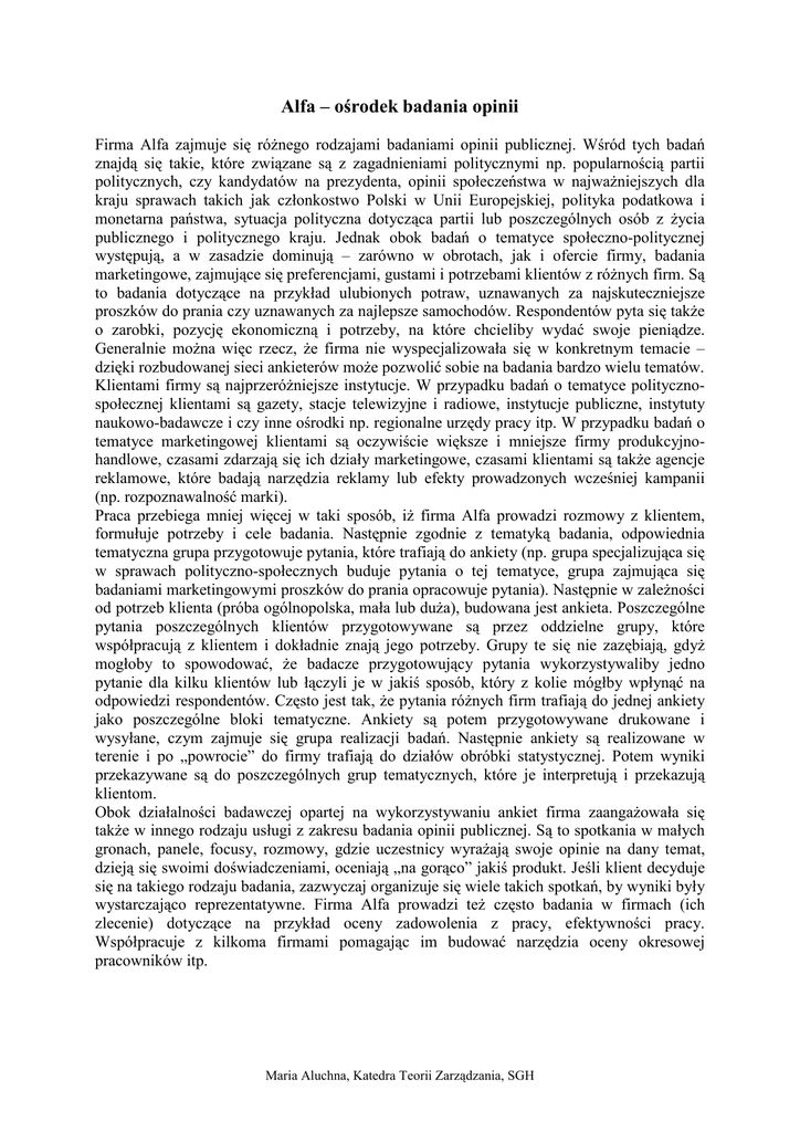 Alfa – ośrodek badania opinii Firma Alfa zajmuje się różnego rodzajami badaniami opinii publicznej. Wśród tych badań znajdą się takie, które związane są z zagadnieniami politycznymi np. popularnością partii politycznych, czy kandydatów na prezydenta, opinii społeczeństwa w najważniejszych dla kraju sprawach takich jak członkostwo Polski w Unii Europejskiej, polityka podatkowa i monetarna państwa, sytuacja polityczna dotycząca partii lub poszczególnych osób z życia publicznego i politycznego kraju. Jednak obok badań o tematyce społeczno-politycznej występują, a w zasadzie dominują – zarówno w obrotach, jak i ofercie firmy, badania marketingowe, zajmujące się preferencjami, gustami i potrzebami klientów z różnych firm. Są to badania dotyczące na przykład ulubionych potraw, uznawanych za najskuteczniejsze proszków do prania czy uznawanych za najlepsze samochodów. Respondentów pyta się także o zarobki, pozycję ekonomiczną i potrzeby, na które chcieliby wydać swoje pieniądze. Generalnie można więc rzecz, że firma nie wyspecjalizowała się w konkretnym temacie – dzięki rozbudowanej sieci ankieterów może pozwolić sobie na badania bardzo wielu tematów. Klientami firmy są najprzeróżniejsze instytucje. W przypadku badań o tematyce politycznospołecznej klientami są gazety, stacje telewizyjne i radiowe, instytucje publiczne, instytuty naukowo-badawcze i czy inne ośrodki np. regionalne urzędy pracy itp. W przypadku badań o tematyce marketingowej klientami są oczywiście większe i mniejsze firmy produkcyjnohandlowe, czasami zdarzają się ich działy marketingowe, czasami klientami są także agencje reklamowe, które badają narzędzia reklamy lub efekty prowadzonych wcześniej kampanii (np. rozpoznawalność marki). Praca przebiega mniej więcej w taki sposób, iż firma Alfa prowadzi rozmowy z klientem, formułuje potrzeby i cele badania. Następnie zgodnie z tematyką badania, odpowiednia tematyczna grupa przygotowuje pytania, które trafiają do ankiety (np. grupa specjalizująca się w sprawach polityczno-społecznych buduje pytania o tej tematyce, grupa zajmująca się badaniami marketingowymi proszków do prania opracowuje pytania). Następnie w zależności od potrzeb klienta (próba ogólnopolska, mała lub duża), budowana jest ankieta. Poszczególne pytania poszczególnych klientów przygotowywane są przez oddzielne grupy, które współpracują z klientem i dokładnie znają jego potrzeby. Grupy te się nie zazębiają, gdyż mogłoby to spowodować, że badacze przygotowujący pytania wykorzystywaliby jedno pytanie dla kilku klientów lub łączyli je w jakiś sposób, który z kolie mógłby wpłynąć na odpowiedzi respondentów. Często jest tak, że pytania różnych firm trafiają do jednej ankiety jako poszczególne bloki tematyczne. Ankiety są potem przygotowywane drukowane i wysyłane, czym zajmuje się grupa realizacji badań. Następnie ankiety są realizowane w terenie i po „powrocie” do firmy trafiają do działów obróbki statystycznej. Potem wyniki przekazywane są do poszczególnych grup tematycznych, które je interpretują i przekazują klientom. Obok działalności badawczej opartej na wykorzystywaniu ankiet firma zaangażowała się także w innego rodzaju usługi z zakresu badania opinii publicznej. Są to spotkania w małych gronach, panele, focusy, rozmowy, gdzie uczestnicy wyrażają swoje opinie na dany temat, dzieją się swoimi doświadczeniami, oceniają „na gorąco” jakiś produkt. Jeśli klient decyduje się na takiego rodzaju badania, zazwyczaj organizuje się wiele takich spotkań, by wyniki były wystarczająco reprezentatywne. Firma Alfa prowadzi też często badania w firmach (ich zlecenie) dotyczące na przykład oceny zadowolenia z pracy, efektywności pracy. Współpracuje z kilkoma firmami pomagając im budować narzędzia oceny okresowej pracowników itp. Maria Aluchna, Katedra Teorii Zarządzania, SGH