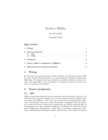 Trochę o LATEXu Jan Kowalski 9 grudnia 2014 Spis treści 1 Wstęp 1 2 Nazwa programu 2.1 TEX . . . . . . . . . . . . . . . . . . . . . . . . . . . . . . . . . . 2.2 LATEX . . . . . . . . . . . . . . . . . . . . . . . . . . . . . . . . . 1 1 2 3 Podstawy 2 4 Nazwy plików związanych z LATEXem 3 5 Kilka gotowych oznaczeń napisów 3 1 Wstęp W pierwszej części przedstawimy krótko filozofię oraz historię systemu TEX. W części drugiej skoncentrujemy się na podstawowych elementach dokumentu TEXowego. Po przeczytaniu tego rozdziału czytelnik powinien z grubsza wiedzieć, jak działa TEX, co jest niezbędne do rozumienia materiału prezentowanego w następnych rozdziałach. 2 2.1 Nazwa programu TEX TEXjest programem komputerowym stworzonym przez Donalda E. Knutha. Jest przeznaczony do składu tekstów oraz wzorów matematycznych. Knuth rozpoczął pracę nad TEXem w 1977 roku, aby wykorzystać potencjał składu cyfrowego, stosowanego wówczas na coraz szerszą skalę w poligrafii. Miał też nadzieję, że uda się odwrócić tendencję do pogarszania się jakości typograficznej, co uwidaczniało się w jego własnych książkach i artykułach. W używanej obecnie postaci TEXzostał udostępniony w roku 1982, a niewielkie rozszerzenie, dotyczące ośmiobitowego kodowania znaków, pojawiło się w roku 1989. ma renomę 1 programu nadzwyczaj stabilnego, pracującego na różnego rodzaju sprzęcie oraz praktycznie wolnego od błędów. Numery wersji TEXa zbiegają do liczby ?, a obecny wynosi 3,14159. Słowo TEXnależy wymawiać „tech”. Zgłoska „ch” ma związek z tym, że znak X przypomina grecką literę „chi”. TEXjest też pierwszą sylabą greckiego słowa texnologia (technologia). W sytuacjach, w których nie można zapisywać nazwy TEXz charakterystycznym obniżeniem litery E, należy zamiennie używać wersji TeX. 2.2 LATEX LATEXjest zestawem instrukcji (poleceń, makrodefinicji, makr) umożliwiających autorom złożenie i wydrukowanie ich prac na najwyższym poziomie typograficznym. Pierwszą wersję LATEXa opracował Leslie Lamport. Do formatowania dokumentu LATEXużywa programu TEX. Pielęgnacją dzisiejszych wersji LATEXa zajmuje się Frank Mittelbach. Kilka lat temu pakiet LATEXzostał rozszerzony przez zespół o nazwie LATEX3 (LATEX3 team), kierowany przez Franka Mittelbacha. Celem tego rozszerzenia było wprowadzenie kilku od dawna postulowanych ulepszeń oraz unifikacja rozmaitych odmian LATEXa, które rozpowszechniły się od chwili powstania kilkanaście lat wcześniej LATEXa w wersji 2.09. Nową wersję pakietu nazwanoLATEX2, w celu odróżnienia jej od wersji poprzednich. Niniejszy dokument opisuje właśnie LATEX2. Słowo LATEXnależy wymawiać „lej-tech” albo „la-tech.” Jeżeli nie można zapisać symbolu LATEX, to zamiennie należy użyć zapisu LaTeX. LATEX2 wymawiamy „la-tech dwa i”, a zamienną wersją zapisu jest LaTeX2e. 3 Podstawy Praca z LATEXem zdecydowanie różni się od podejścia stosowanego w procesorach tekstu typu wysiwyg 1 , takich jak MS Word albo OpenOffice. Pierwszy sposób można określić „formatowaniem logicznym” drugi – „for matowaniem wizualnym”. Używając programów typu wysiwyg, autor decyduje interakcyjnie o wyglądzie graficznym dokumentu, w miarę dopisywania tekstu. Przez cały czas widzi na ekranie, jak tekst będzie wyglądał po wydrukowaniu. Używając LATEXa, nie można na ogół oglądać dokumentu w jego ostatecznej postaci i jednocześnie dopisywać tekstu. Można natomiast obejrzeć dokument na ekranie po przetworzeniu go LATEXem2 . Gdy jest już gotowy, można dokument wysłać na drukarkę. 1 ang. What you see is what you get (dostaniesz to, co widzisz) szybkim komputerze przetworzenie trwa często zaledwie kilka sekund. Dysponując dużym ekranem, można jednocześnie wyświetlić okno z plikiem źródłowym oraz okno podglądu, otrzymując w ten sposób system prawie wysiwyg. 2 Na 2 4 Nazwy plików związanych z LATEXem Pracując z LATEXem, szybko zauważysz, że na dysku pojawia się mnóstwo plików o różnych rozszerzeniach nazwy, a ty nie wiesz, co to za jedne. W poniższym wykazie objaśniono rozmaite typy plików, z którymi możesz się zetknąć. Wykaz ten nie pretenduje do kompletnego, dlatego napisz do nas, gdy napotkasz jakieś nowe rozszerzenie, które uznasz za warte opisania. 1. .tex - Plik źródłowy z dokumentem w notacji LATEXa bądź zwykłego TEXa. Można go kompilować programem latex bądź, odpowiednio, tex. 2. .sty - Pakiet makr LATEXowych. Plik tego typu można dołączać do dokumentu LATEXowego, używając do tego celu instrukcji . 3. .dtx - Udokumentowany TEX. Jest to podstawowy format, w jakim dystrybuowane są style LATEXa. Skutkiem kompilacji pliku tego typu jest broszurka z udokumentowanymi makrami. 4. .ins - Instalator dla plików .dtx. Ściągając z sieci pakiet LATEXowy, otrzymasz na ogół pliki.dtx i .ins. Uruchomienie LATEXa na pliku .ins powoduje rozpakowanie pliku .dtx. 5. .cls Plik z klasą LATEXa definiującą wygląd składanych w LATEXu dokumentów. Właśnie do tych plików odnosi się występująca na początku dokumentu instrukcja documentclass 6. .fd - Definicja niektórych właściwości fontów LATEXa. 5 Kilka gotowych oznaczeń napisów Instrukcja \today \TeX \LaTeX Przykład 15 stycznia 2014 TEX LATEX Opis Bieżąca data Twój ulubiony system składu Nazwa tej gry 3