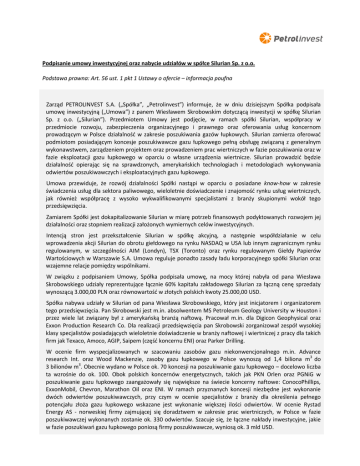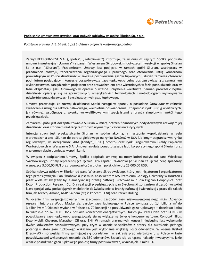 Podpisanie umowy inwestycyjnej oraz nabycie udziałów w spółce Silurian Sp. z o.o. Podstawa prawna: Art. 56 ust. 1 pkt 1 Ustawy o ofercie – informacja poufna Zarząd PETROLINVEST S.A. („Spółka”, „Petrolinvest”) informuje, że w dniu dzisiejszym Spółka podpisała umowę inwestycyjną („Umowa”) z panem Wiesławem Skrobowskim dotyczącą inwestycji w spółkę Silurian Sp. z o.o. („Silurian”). Przedmiotem Umowy jest podjęcie, w ramach spółki Silurian, współpracy w przedmiocie rozwoju, zabezpieczenia organizacyjnego i prawnego oraz oferowania usług koncernom prowadzącym w Polsce działalnośd w zakresie poszukiwania gazów łupkowych. Silurian zamierza oferowad podmiotom posiadającym koncesje poszukiwawcze gazu łupkowego pełną obsługę związaną z generalnym wykonawstwem, zarządzeniem projektem oraz prowadzeniem prac wiertniczych w fazie poszukiwania oraz w fazie eksploatacji gazu łupkowego w oparciu o własne urządzenia wiertnicze. Silurian prowadzid będzie działalnośd opierając się na sprawdzonych, amerykaoskich technologiach i metodologiach wykonywania odwiertów poszukiwawczych i eksploatacyjnych gazu łupkowego. Umowa przewiduje, że rozwój działalności Spółki nastąpi w oparciu o posiadane know-how w zakresie świadczenia usług dla sektora paliwowego, wieloletnie doświadczenie i znajomośd rynku usług wiertniczych, jak również współpracę z wysoko wykwalifikowanymi specjalistami z branży skupionymi wokół tego przedsięwzięcia. Zamiarem Spółki jest dokapitalizowanie Silurian w miarę potrzeb finansowych podyktowanych rozwojem jej działalności oraz stopniem realizacji założonych wymiernych celów inwestycyjnych. Intencją stron jest przekształcenie Silurian w spółkę akcyjną, a następnie współdziałanie w celu wprowadzenia akcji Silurian do obrotu giełdowego na rynku NASDAQ w USA lub innym zagranicznym rynku regulowanym, w szczególności AIM (Londyn), TSX (Toronto) oraz rynku regulowanym Giełdy Papierów Wartościowych w Warszawie S.A. Umowa reguluje ponadto zasady ładu korporacyjnego spółki Silurian oraz wzajemne relacje pomiędzy wspólnikami. W związku z podpisaniem Umowy, Spółka podpisała umowę, na mocy której nabyła od pana Wiesława Skrobowskiego udziały reprezentujące łącznie 60% kapitału zakładowego Silurian za łączną cenę sprzedaży wynoszącą 3.000,00 PLN oraz równowartośd w złotych polskich kwoty 25.000,00 USD. Spółka nabywa udziały w Silurian od pana Wiesława Skrobowskiego, który jest inicjatorem i organizatorem tego przedsięwzięcia. Pan Skrobowski jest m.in. absolwentem MS Petroleum Geology University w Houston i przez wiele lat związany był z amerykaoską branżą naftową. Pracował m.in. dla Digicon Geophysical oraz Exxon Production Research Co. Dla realizacji przedsięwzięcia pan Skrobowski zorganizował zespół wysokiej klasy specjalistów posiadających wieloletnie doświadczenie w branży naftowej i wiertniczej z pracy dla takich firm jak Texaco, Amoco, AGIP, Saipem (częśd koncernu ENI) oraz Parker Drilling. W ocenie firm wyspecjalizowanych w szacowaniu zasobów gazu niekonwencjonalnego m.in. Advance research Int. oraz Wood Mackenzie, zasoby gazu łupkowego w Polsce wynoszą od 1,4 biliona m3 do 3 bilionów m3. Obecnie wydano w Polsce ok. 70 koncesji na poszukiwanie gazu łupkowego – docelowo liczba ta wzrośnie do ok. 100. Obok polskich koncernów energetycznych, takich jak PKN Orlen oraz PGNiG w poszukiwanie gazu łupkowego zaangażowały się największe na świecie koncerny naftowe: ConocoPhillips, ExxonMobil, Chevron, Marathon Oil oraz ENI. W ramach przyznanych koncesji niezbędne jest wykonanie dwóch odwiertów poszukiwawczych, przy czym w ocenie specjalistów z branży dla określenia pełnego potencjału złoża gazu łupkowego wskazane jest wykonanie większej ilości odwiertów. W ocenie Rystad Energy AS - norweskiej firmy zajmującej się doradztwem w zakresie prac wiertniczych, w Polsce w fazie poszukiwawczej wykonanych zostanie ok. 330 odwiertów. Szacuje się, że łączne nakłady inwestycyjne, jakie w fazie poszukiwao gazu łupkowego poniosą firmy poszukiwawcze, wyniosą ok. 3 mld USD. Inwestycja w spółkę Silurian umożliwi wejście Petrolinvest w nowy segment działalności w zakresie oferowania usług dla podmiotów zajmujących się poszukiwaniem i eksploatacją gazu łupkowego w Polsce. Jest to jeden z obszarów działalności Spółki określony w nowej strategii Petrolinvestu, w ramach której Spółka będzie – oprócz głównej działalności polegającej na poszukiwaniu i wydobyciu ropy (w szczególności w oparciu o koncesję OTG) – rozwijad swoją działalnośd w segmentach biznesowych, które mogą przynieśd Spółce stabilne i przewidywalne przychody oraz istotne dodatnie przepływy gotówkowe. 16 grudnia 2010 r. /-/ Bertrand Le Guern – Prezes Zarządu /-/ Marek Pietruszewski – Wiceprezes Zarządu 2