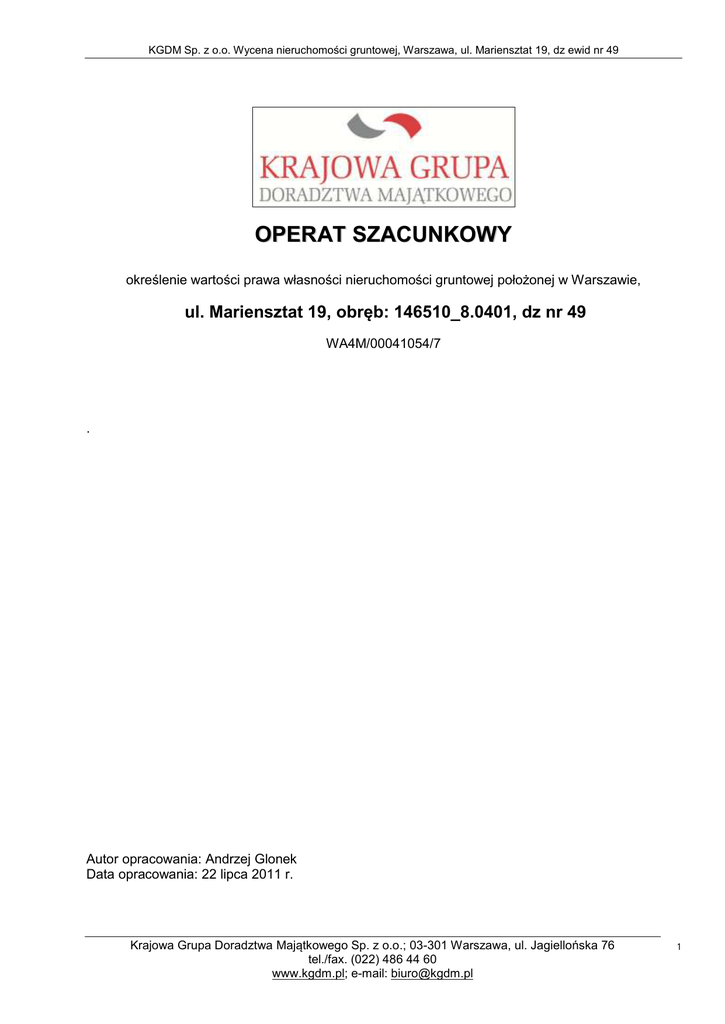 KGDM Sp. z o.o. Wycena nieruchomości gruntowej, Warszawa, ul. Mariensztat 19, dz ewid nr 49 OPERAT SZACUNKOWY określenie wartości prawa własności nieruchomości gruntowej położonej w Warszawie, ul. Mariensztat 19, obręb: 146510_8.0401, dz nr 49 WA4M/00041054/7 . Autor opracowania: Andrzej Glonek Data opracowania: 22 lipca 2011 r. Krajowa Grupa Doradztwa Majątkowego Sp. z o.o.; 03-301 Warszawa, ul. Jagiellońska 76 tel./fax. (022) 486 44 60 www.kgdm.pl; e-mail: [email protected] 1 KGDM Sp. z o.o. Wycena nieruchomości gruntowej, Warszawa, ul. Mariensztat 19, dz ewid nr 49 WYCIĄG Z OPERATU SZACUNKOWEGO Opis nieruchomości Cel wyceny Metoda wyceny Właściciel praw do nieruchomości Wartość rynkowa prawa własności nieruchomości gruntowej Adres: ul. Mariensztat 19 Dzielnica: Śródmieście Działka: nr 49 Obręb: 146510_8.0401 2 Powierzchnia działki: 135 m Kw: WA4M/00041054/7 Określenie wartości prawa własności w celu ustalenia i naliczenia opłaty rocznej z tytułu użytkowania wieczystego gruntu oraz dla potrzeb aktualizacji opłat z tytułu użytkowania wieczystego. Grunt zabudowany budynkiem, w którym nie będzie prowadzona sprzedaż lokali. Podejście porównawcze, metoda korygowania ceny średniej Właściciel: Miasto st. Warszawa 754 202,00 z 2 Wartość rynkowa 1 m prawa własności Daty istotne dla operatu Autor operatu szacunkowego 5 586,68 zł Data sporządzenia wyceny: 22 lipca 2011 r. Data, na którą określono wartość przedmiotu wyceny: 18 lipca 2011 r. Data, na którą określono i uwzględniono w wycenie stan przedmiotu wyceny: 18 lipca 2011 r. Data oględzin: 18 lipca 2011 r. Andrzej Glonek Uprawnienia nr 5005 Pieczęć i podpis rzeczoznawcy majątkowego Krajowa Grupa Doradztwa Majątkowego Sp. z o.o.; 03-301 Warszawa, ul. Jagiellońska 76 tel./fax. (022) 486 44 60 www.kgdm.pl; e-mail: [email protected] 2 KGDM Sp. z o.o. Wycena nieruchomości gruntowej, Warszawa, ul. Mariensztat 19, dz ewid nr 49 Spis Treści 1. PRZEDMIOT I ZAKRES WYCENY ................................................................................................................. 4 1.1. 1.2. PRZEDMIOT I ZAKRES WYCENY ............................................................................................................... 4 ZAKRES WYCENY ................................................................................................................................... 4 2. CEL WYCENY ................................................................................................................................................. 4 3. PODSTAWY OPRACOWANIA OPERATU SZACUNKOWEGO .................................................................... 4 3.1. 3.2. 3.3. 3.4. PODSTAWA FORMALNA WYCENY ............................................................................................................. 4 PODSTAWY PRAWNE WYCENY ................................................................................................................ 4 PODSTAWY METODOLOGICZNE ............................................................................................................... 5 ŹRÓDŁA DANYCH MERYTORYCZNYCH ...................................................................................................... 5 4. DATY ISTOTNE DLA OPERATU SZACUNKOWEGO ................................................................................... 6 5. OPIS I OKREŚLENIE STANU NIERUCHOMOŚCI ........................................................................................ 6 5.1. 5.2. 5.3. STAN PRAWNY ....................................................................................................................................... 6 STAN TECHNICZNO-UŻYTKOWY ............................................................................................................... 6 STAN OTOCZENIA................................................................................................................................... 8 6. PRZEZNACZENIE NIERUCHOMOŚCI W PLANIE MIEJSCOWYM ............................................................ 10 7. OKREŚLENIE SPOSOBU WYCENY............................................................................................................ 11 7.1. 7.2. W SKAZANIE RODZAJU OKREŚLANEJ WARTOŚCI ...................................................................................... 11 W YBÓR PODEJŚCIA, METODY I TECHNIKI WYCENY .................................................................................. 11 8. ANALIZA I CHARAKTERYSTYKA RYNKU NIERUCHOMOŚCI .................................................................. 13 8.1. 8.2. SPECYFIKACJA BADANEGO RYNKU LOKALNEGO ..................................................................................... 13 ANALIZA, CHARAKTERYSTYKA I UWARUNKOWANIA BADANEGO RYNKU ..................................................... 13 9. OKREŚLENIE CECH RYNKOWYCH DLA WYCENIANEJ NIERUCHOMOŚCI .......................................... 15 10. WYZNACZENIE WAG POSZCZEGÓLNYCH CECH I OKREŚLENIE CECH DLA NIERUCHOMOŚCI BĘDĄCEJ PRZEDMIOTEM WYCENY .............................................................................................................. 16 11. OKREŚLENIE WARTOŚCI RYNKOWEJ PRZEDMIOTU WYCENY............................................................ 17 11.1. OKREŚLENIE BAZY NIERUCHOMOŚCI PODOBNYCH PRZYJĘTYCH DO PORÓWNAŃ....................................... 17 11.2. OKREŚLENIE WARTOŚCI RYNKOWEJ WYCENIANEJ NIERUCHOMOŚCI ........................................................ 17 11.2.1. Określenie zakresu współczynników korygujących .................................................................. 17 11.2.2. Charakterystyka nieruchomości wycenianej i nieruchomości o cenach minimalnej i maksymalnej w aspekcie cech rynkowych ................................................................................................ 18 11.2.3. Obliczenie wartości rynkowej nieruchomości gruntowej niezabudowane