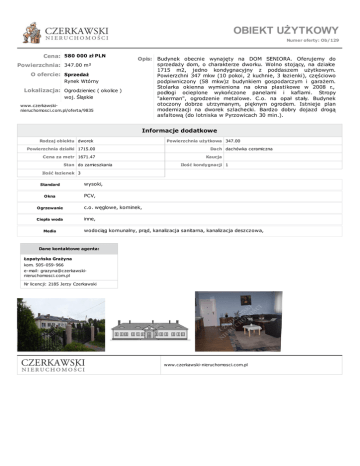 OBIEKT UŻYTKOWY Numer oferty: Ob/129 Cena: 580 000 zł PLN Powierzchnia: 347.00 m² O ofercie: Sprzedaż Rynek Wtórny Lokalizacja: Ogrodzieniec ( okolice ) woj. Śląskie www.czerkawskinieruchomosci.com.pl/oferta/9835 Opis: Budynek obecnie wynajęty na DOM SENIORA. Oferujemy do sprzedaży dom, o charakterze dworku. Wolno stojący, na działce 1715 m2, jedno kondygnacyjny z poddaszem użytkowym. Powierzchni 347 mkw (10 pokoi, 2 kuchnie, 3 łazienki), częściowo podpiwniczony (58 mkw)z budynkiem gospodarczym i garażem. Stolarka okienna wymieniona na okna plastikowe w 2008 r., podłogi ocieplone wykończone panelami i kaflami. Stropy "akerman", ogrodzenie metalowe. C.o. na opał stały. Budynek otoczony dobrze utrzymanym, pięknym ogrodem. Istnieje plan modernizacji na dworek szlachecki. Bardzo dobry dojazd drogą asfaltową (do lotniska w Pyrzowicach 30 min.). Informacje dodatkowe Rodzaj obiektu dworek Powierzchnia działki 1715.00 Cena za metr 1671.47 Stan do zamieszkania Powierzchnia użytkowa 347.00 Dach dachówka ceramiczna Kaucja Ilość kondygnacji 1 Ilość łazienek 3 Standard Okna wysoki, PCV, Ogrzewanie c.o. węglowe, kominek, Ciepła woda inne, Media wodociąg komunalny, prąd, kanalizacja sanitarna, kanalizacja deszczowa, Dane kontaktowe agenta: Łopatyńska Grażyna kom. 505-059-966 e-mail: [email protected] Nr licencji: 2185 Jerzy Czerkawski www.czerkawski-nieruchomosci.com.pl