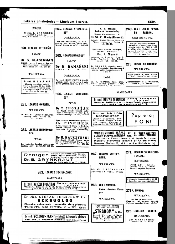 Lekarze ginekolodzy — Linoleum I cerata. LUBLIN. D r m e d . S. B R O M B E R O . Akuszer I g i n e k o l o g . Lublin, K o ś c i u s z k i 1 , t e l . 1 6 - 1 7 . 264. LEKARZE STOMATOLO DZY. WARSZAWA. Wl. OSTASZEWSKI, D r . med. c h i r u r g , z e b . s z c z ę k , Jamy u s t h . , W - w a , Krucza 44 m . 2, t . 8-75-88 260. LEKARZE INTERNIŚCI. LWÓW. Dr S. GLASERMAN LWÓW. Dr M. D A M A Ń S R 1 Fredry 7, I p . , WARSZAWA. Dr med. N. SZYLAJNER 261. LEKARZE OKULIŚCI. WARSZAWA. Dr. med. B . TURKUS-STERLINO, c h o r o b y o c z u . Sienna 2 9 , tel. 6-24-42. 262. LEKARZE RENTGENOLO DZY. St. Asyst. Kliniki Chorób skór n y c h I wenerycznych U n i w . J. K. K o c h a n o w s k i e g o 26. T e l . 260-90 skórno-wenerycznych F I S C H E R D r . L u d w i k a Landes L e l n e r o w a , Łozińskiego 9, parter, t e l . 265-60. St. A s y s t . K l i n i k i C h o r ó b s k ó r nych i wenerycznych U n i w . J. K., al. Jagiellońska 8, t e l . 249-66. o r d y n u j e o d 8 — 12 2 — 6, L w o w , Asnyka 1 , R ó g Piłsud skiego, t e l . 248-01. D r . S C H E E R, c h o r o b y w e n e r . , skórne. Kosmetyka. Skarbkowska 4 drugie wejść. Łukasińskiego 4, t . 275-65. G R Y N K R A U T W t n t a w s , K r ó l e w s k a SI a*. 7. t W - 3 1 263. LEKARZE SEKSUOLODZY. D r . H . R ó ż A N E R , Spec. c h o r . w e n e r . Niemoc p ł c i o w a , Łódź, N a r u t o w i c z a 9 , t e l . 128-98. WARSZAWA. „ T e r e b e n t h e n " , S. A . W a r s z a w a , Złota 62, t e l . 263-90. WARSZAWA. Dr med. MARCELI N I U T l S I l t * k t 9 ł \ t t l ? " " W a r s z a w a , F i e r a c K l . g o N r 15. d a w n a F o k s a l , t e l e f o n 690-93 ^^^^god»^a^O^J^5^^^w^r»i<Mj*iel^^^^9^^2^^^^^ D-rzy m e d . Zofia I Feliks KOSTKO WSCY Popieraj Choroby weneryczne, płcio w e , s k ó r n e , w ł o s ó w . Kosme tyka. Analizy. Warszawa, u l . Mokotowska 6 1 . T e l . 8-99-29. F O N ! WENERYCZNE Or GABINET ELEKTR0-LECZN1CZY med. * Ł « " " " " " » u " » 25. od 8 r. do 9 w. Niedziela do 1-sL 267. LEKARZE WETERY NARII. 271. LICZNIKI ENERGII ELEK TRYCZNEJ. KATOWICE. WARSZAWA. Lek. W e t . Z. Z O O R Z B L S K I Z a b k o w i k . 3, t . 10-33-13. Wyjazdy .POMIAR* Katowic., Gliwicka 10 m. l , t . 343-04. Sprzedaż.napraw., l e g . l i z a ć ) . WARSZAWA, J S z w e d e , K o p e r n i k . 14, t 33041. Sprzedał, naprawa, legalizacja- Ir med. MIKU DOBRZYHSIU " " V ; . T f : : 7 " " W a r . z a w a , P i e r a c k i e g o N r 15. d a w n a F o k s a l , t e l e f o n 690-93 JERMUŁOWICZ SEKSUOLOG Choroby, z a b u r z e n i a I anomalie sfory płciowej WARSZAWA. Ś-TO KRZYSKA 16 — T E L . 528-58 Specjalność: g ^ÜRfiKOWSKI B b . l a k . k l i n i . i w Wiedniu i f .ryżu 1 b . l a k . Szpitala Sw. Łaaarsa. K o b i e t y przyjmuje lekarka d r Aniela Rataj WARSZAWA. Dr med. S C H O E N M A N 270. LEPNIK DO DACHÓW. B-cia B A L I C C Y , f a b r . w y r ó b . I Z O L A C , Dobra. 26, t e l . 513-31 ŁÓDŹ. Warszawa. Chmielna n zdjęcia I prześwietlenia, s a l w i e I I , t l a a i a , • • • r a t przenośny, leczenia krótkimi f a l a m i , analizy lekarskie Dr. Mod. S T E F A N Fabryka w y r o b ó w lnianych „ L E W L E N " , C z ę s t o c h o w . , Prze chodnio 11-15, tel. 24-81li 15-00 wyrąbie: płótna lniane i jutowe surowe i sztywne tośmy tapi cer i . lniane, jutowe, konopne oroz bawełniane. b . lek. (ssystent) K l i n i k w Berlinie, Pradze i Wiedniu. O r d . Kilińskiego 3 (naprzeciw Kawiarni W i . d e d s k i . i ) , tel. 351-68. Dr K. H A U C Z Y Ń S K I LWÓW. B. Dr. I. Mund CZĘSTOCHOWA. Dr T . C H O R Ą Ż A K Dr. a Adiunkt Kliniki Chorób Skórnych i Wenerycznych, u l . Fredry 7, tel. 274-10. WENER010- LWÓW. Spec. chorób Dr. t e l . 249-41. D r m e d . JERZY F R Y S Z M A N , u r o l o g , c h o r . n e r e k , pach. 1 d r ó g m o c z . Jerozolimska 4 1 , t . 9 8 6 - 3 3 . 266. LEKARZE DZY. a n ł n XS I I I y D o c e n t U n i w e r s y t e t u J. K . 269. LEN I LNIANE WYRO BY — FABRYKI. Dr St. Ł. Kwiatkowski WARSZAWA. Choroby przemiany materii. Świder, Zaciszna 22, t e l . 55-88. W Warszawie przyjmuje: przy ul. Nowogrodzkiej 6-a, t e l . 8-92-96, od 5-tej — do 7-mej p p . R d. c. branży: Lekarze wenerolodzy. Specjalista c h o r ó b s k ó r n y c h , wener. i kosmetyki. 265. LEKARZE UROLODZY. Choroby serca I n a c z y ń k r w i o n . Elektrokardiograf przenośny. Akademicka 2 6 , t e l . 2 4 7 - 8 0 . XXIV. Zaburzenia płciowe WARSZAWA I . u l . WOJCIECHA G Ó R S K I E G O 0 (kolo Główno) Poczty) 268. LEN I KONOPIE. Patii również: Kono pi*. 271«. LIGNINA. WARSZAWA. WARSZAWA. Dr. l a ł . H . Glńck.berg, D ł u g . 46, t . l . 11-96-67, l i - ł l - S ł . Wyłączna sprzedaż ligniny „ C . l w . " Częstochowskie Zakłady Wyrobów Włókiennych „STR AD OM " s p akt. Zarząd: Warszawa, p l . Napo leona 9 . T e l : 296-68, 6 8 4 - 0 6 , 2 0 4 - 9 1 , 6 1 9 - 3 6 , 669-2S. 631-74. 272. LINOLEUM I CERATA. BYDGOSZCZ. ZB. W A L I G Ó R S K I O d a ń s k a 1 2 , t e l . 12-23.