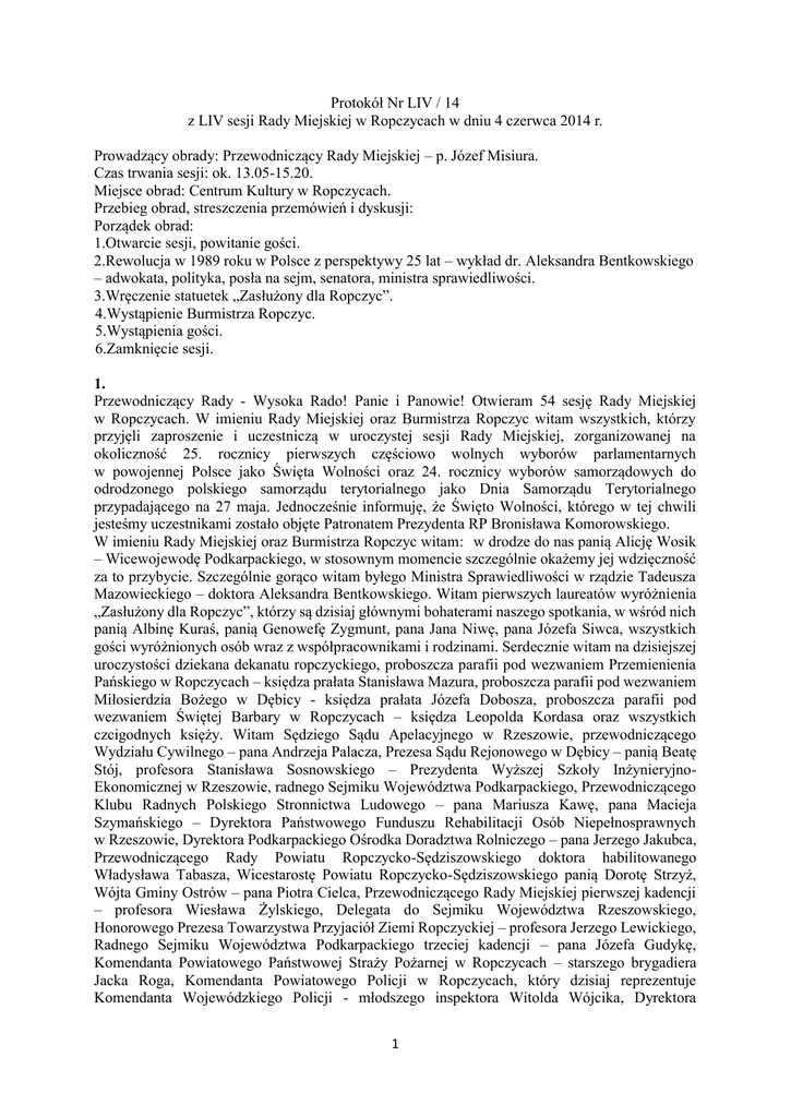 Protokół Nr LIV / 14 z LIV sesji Rady Miejskiej w Ropczycach w dniu 4 czerwca 2014 r. Prowadzący obrady: Przewodniczący Rady Miejskiej – p. Józef Misiura. Czas trwania sesji: ok. 13.05-15.20. Miejsce obrad: Centrum Kultury w Ropczycach. Przebieg obrad, streszczenia przemówień i dyskusji: Porządek obrad: 1.Otwarcie sesji, powitanie gości. 2.Rewolucja w 1989 roku w Polsce z perspektywy 25 lat – wykład dr. Aleksandra Bentkowskiego – adwokata, polityka, posła na sejm, senatora, ministra sprawiedliwości. 3.Wręczenie statuetek „Zasłużony dla Ropczyc”. 4.Wystąpienie Burmistrza Ropczyc. 5.Wystąpienia gości. 6.Zamknięcie sesji. 1. Przewodniczący Rady - Wysoka Rado! Panie i Panowie! Otwieram 54 sesję Rady Miejskiej w Ropczycach. W imieniu Rady Miejskiej oraz Burmistrza Ropczyc witam wszystkich, którzy przyjęli zaproszenie i uczestniczą w uroczystej sesji Rady Miejskiej, zorganizowanej na okoliczność 25. rocznicy pierwszych częściowo wolnych wyborów parlamentarnych w powojennej Polsce jako Święta Wolności oraz 24. rocznicy wyborów samorządowych do odrodzonego polskiego samorządu terytorialnego jako Dnia Samorządu Terytorialnego przypadającego na 27 maja. Jednocześnie informuję, że Święto Wolności, którego w tej chwili jesteśmy uczestnikami zostało objęte Patronatem Prezydenta RP Bronisława Komorowskiego. W imieniu Rady Miejskiej oraz Burmistrza Ropczyc witam: w drodze do nas panią Alicję Wosik – Wicewojewodę Podkarpackiego, w stosownym momencie szczególnie okażemy jej wdzięczność za to przybycie. Szczególnie gorąco witam byłego Ministra Sprawiedliwości w rządzie Tadeusza Mazowieckiego – doktora Aleksandra Bentkowskiego. Witam pierwszych laureatów wyróżnienia „Zasłużony dla Ropczyc”, którzy są dzisiaj głównymi bohaterami naszego spotkania, w wśród nich panią Albinę Kuraś, panią Genowefę Zygmunt, pana Jana Niwę, pana Józefa Siwca, wszystkich gości wyróżnionych osób wraz z współpracownikami i rodzinami. Serdecznie witam na dzisiejszej uroczystości dziekana dekanatu ropczyckiego, proboszcza parafii pod wezwaniem Przemienienia Pańskiego w Ropczycach – księdza prałata Stanisława Mazura, proboszcza parafii pod wezwaniem Miłosierdzia Bożego w Dębicy - księdza prałata Józefa Dobosza, proboszcza parafii pod wezwaniem Świętej Barbary w Ropczycach – księdza Leopolda Kordasa oraz wszystkich czcigodnych księży. Witam Sędziego Sądu Apelacyjnego w Rzeszowie, przewodniczącego Wydziału Cywilnego – pana Andrzeja Palacza, Prezesa Sądu Rejonowego w Dębicy – panią Beatę Stój, profesora Stanisława Sosnowskiego – Prezydenta Wyższej Szkoły InżynieryjnoEkonomicznej w Rzeszowie, radnego Sejmiku Województwa Podkarpackiego, Przewodniczącego Klubu Radnych Polskiego Stronnictwa Ludowego – pana Mariusza Kawę, pana Macieja Szymańskiego – Dyrektora Państwowego Funduszu Rehabilitacji Osób Niepełnosprawnych w Rzeszowie, Dyrektora Podkarpackiego Ośrodka Doradztwa Rolniczego – pana Jerzego Jakubca, Przewodniczącego Rady Powiatu Ropczycko-Sędziszowskiego doktora habilitowanego Władysława Tabasza, Wicestarostę Powiatu Ropczycko-Sędziszowskiego panią Dorotę Strzyż, Wójta Gminy Ostrów – pana Piotra Cielca, Przewodniczącego Rady Miejskiej pierwszej kadencji – profesora Wiesława Żylskiego, Delegata do Sejmiku Województwa Rzeszowskiego, Honorowego Prezesa Towarzystwa Przyjaciół Ziemi Ropczyckiej – profesora Jerzego Lewickiego, Radnego Sejmiku Województwa Podkarpackiego trzeciej kadencji – pana Józefa Gudykę, Komendanta Powiatowego Państwowej Straży Pożarnej w Ropczycach – starszego brygadiera Jacka Roga, Komendanta Powiatowego Policji w Ropczycach, który dzisiaj reprezentuje Komendanta Wojewódzkiego Policji - młodszego inspektora Witolda Wójcika, Dyrektora 1 Powiatowego Urzędu Pracy w Ropczycach – pana Wiesława Rygla, Dyrektor Biura Posła Kazimierza Moskala – panią Dorotę Znamirowską, dyrektora Biura Senatora Zdzisława Pupy – pana Marka Pająka, Prezesa Zarządu, jednocześnie Dyrektora Miejskiego Przedsiębiorstwa Dróg i Mostów w Rzeszowie – pana Franciszka Kosiorowskiego, Prezesa Zarządu firmy Weldon – pana Kazimierza Mikruta, pana Stanisława Czaję - właściciela BBC Company z Dębicy, Kierownika Biura Powiatowego Agencji Restrukturyzacji i Modernizacji Rolnictwa w Ropczycach – pana Tadeusza Sowę, zaprzyjaźnionego z Ropczycami artystę – rzeźbiarza – pana Kazimierza Malskiego, Prezesa Towarzystwa Przyjaciół Ziemi Ropczyckiej wraz z całym zarządem Towarzystwa - pana Adama Sypla, Prezesa Zarządu Gminnego OSP - pana Władysława Malinowskiego. Bardzo serdecznie witam wszystkich obecnych na dzisiejszej uroczystości. Wysoka Rado! Panie i Panowie! 4 czerwca 1989 roku, odbyły się wybory parlamentarne, choć ułomne, wynikające z kontraktu politycznego tzw. Okrągłego Stołu, ale pierwsze w PRL bez przymusu i fałszerstw. Solidarność zdobyła 35% miejsc w Sejmie czyli wszystkie przeznaczone dla opozycji i 99% miejsc w Senacie. Solidarność była nie tylko związkiem zawodowym ale również wielomilionowym ruchem społecznym reprezentującym prawie cały świat pracy, ruchem uosabiającym dążenia większości Polaków – do niepodległości, do uzyskania praw do godności i wolności, w tym wolności indywidualnej, narodowej i religijnej. Wybory 4 czerwca 1989 roku to duży krok w stronę demokracji, zwycięstwo rozsądku po obu stronach ówczesnej sceny politycznej, nowy układ parlamentarny i rządowy, tworzenie się III Rzeczpospolitej. Wybrany 4 czerwca 1989 roku, Sejm, już 8 marca 1990 roku uchwalił ustawy dotyczące samorządu terytorialnego gminnego, a 27 maja odbyły się pierwsze w pełni demokratyczne i wolne wybory samorządowe do rad gmin i miast. Biorąc udział w dzisiejszym spotkaniu wyrażamy podziękowanie i szacunek dla wszystkich osób biorących udział w ówczesnych przełomowych wydarzenia
