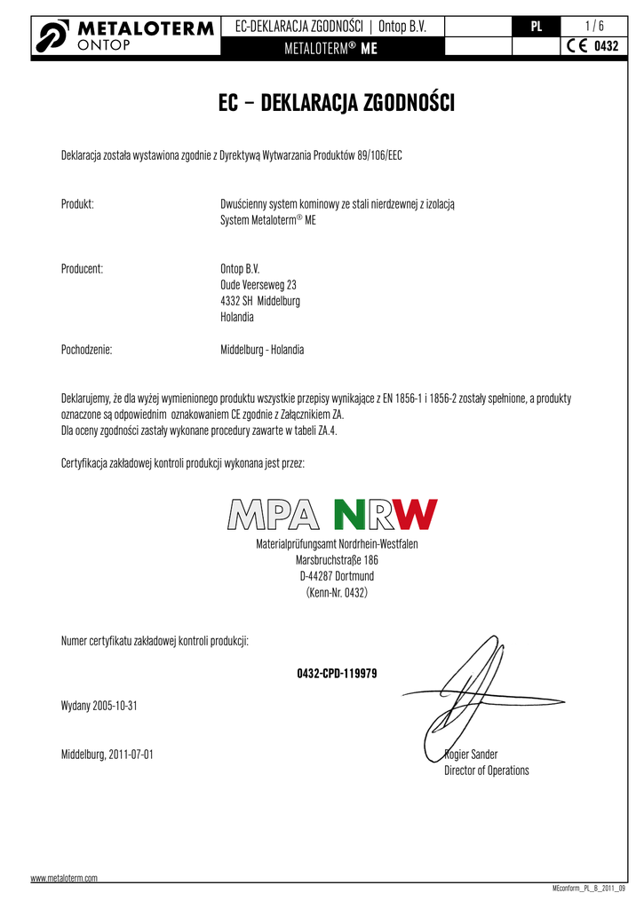 EC-DEKLARACJA ZGODNOŚCI | Ontop B.V. Metaloterm® ME PL 1/6 0432 EC – DEKLARACJA ZGODNOŚCI Deklaracja została wystawiona zgodnie z Dyrektywą Wytwarzania Produktów 89/106/EEC Produkt:Dwuścienny system kominowy ze stali nierdzewnej z izolacją System Metaloterm® ME Producent: Ontop B.V. Oude Veerseweg 23 4332 SH Middelburg Holandia Pochodzenie: Middelburg - Holandia Deklarujemy, że dla wyżej wymienionego produktu wszystkie przepisy wynikające z EN 1856-1 i 1856-2 zostały spełnione, a produkty oznaczone są odpowiednim oznakowaniem CE zgodnie z Załącznikiem ZA. Dla oceny zgodności zastały wykonane procedury zawarte w tabeli ZA.4. Certyfikacja zakładowej kontroli produkcji wykonana jest przez: MPA NRW Materialprüfungsamt Nordrhein-Westfalen Marsbruchstraße 186 D-44287 Dortmund (Kenn-Nr. 0432) Numer certyfikatu zakładowej kontroli produkcji: 0432-CPD-119979 Wydany 2005-10-31 Middelburg, 2011-07-01 www.metaloterm.com Rogier Sander Director of Operations MEconform_PL_B_2011_09 EC-DEKLARACJA ZGODNOŚCI | Ontop B.V. Metaloterm® ME PL 2/6 Oznaczenie dokumentów wg EN 1856 – 1, załącznik ZA tabela ZA 2 System metalowy Odcinek komina EN 1856-1T200 EN 1856-2T200 EN 1856-2T200 EN 1856-1T400 EN 1856-2T400 EN 1856-2T450 EN 1856-2T450 P1 P1 P1 N1 N1 N1 N1 W W W W W D D V2 L50050 V2 L50050 V2 L50050 V2-L50050 V2-L50050 V2-L50050 V2-L50050 O30 O30 O O70 O100 G G400 Jednościenny system kominowy Oznaczenie produktu Numer normy Poziom temperatury Klasa ciśnienia (N: podciśnienie, P: nadciśnienie, H: wysokie nadciśnienie) Odporność na kondensat (W: mokre lub D: suche) Klasa odporności na korozję i materiał elementu komina Opory przepływu Średnia chropowatość: 1 mm Odporność na pożar sadzy (G: tak/ O: nie) i odległość od palnych materiałów (w mm) Odległość od materiałów palnych dotyczy kominów o nominalnej średnicy nie większej niż 300mm. Dla kominów o większej średnicy odległość ta musi być pomnożona przez współczynnik, patrz nr 11 w deklaracji. Opór cieplny 0,08 m2K/W Wytrzymałość na zginanie Wytrzymałość na rozciąganie: 5 m Instalacje ukośne: patrz internetowa strona Ontop Obciążenie wiatrem: wysokość wolnostojącego odcinka powyżej ostatniego mocowania: patrz internetowa strona Ontop Maksymalny odstęp od poprzecznych mocowań: patrz internetowa strona Ontop Odporność na zamrażanie-odmrażanie: Tak www.metaloterm.com MEconform_PL_B_2011_09 EC-DEKLARACJA ZGODNOŚCI | Ontop B.V. Metaloterm® ME L.p. Nr Charakterystyki i cechy wg Wartości / Klasy paragrafu EN 1856-1 1.0 Par. 5.2 Wymiary nominalne (mm): 2.0 Par. 4 i 5, Par. 6.7.2 Materiał płaszcza wewnętrznego: Jakość: Grubość nominalna (grubość minimalna) 3.0 4.0 5.0 6.0 Par. 4 i 5, Par. 6.7.2 Par. 4 i 5 Par. 6.7.4 Par. 6.2.1 Materiał płaszcza zewnętrznego: Izolacja: Uszczelnienie Wytrzymałość na ściskanie 7.0 Par. 6.2.2 Wytrzymałość na rozciąganie 8.0 Par. 6.2.3.2 Obciążenia wiatrem 9.0 Par. 6.2.3.1 Maksymalne wychylenie: Maksymalna długość skosu: www.metaloterm.com Dokument 80, 100, 113, 130, 150, 180, 200, Deklaracja producenta 250, 300, 350, 400, 450, 500, 600, 700, 800 mm L50050 Deklaracja producenta 1.4404 (316L) ø80–250 mm: 0,50 mm (0,45 mm) L50060 ø300–600 mm: 0,60 mm (0,55 mm) ø700–800 mm: 0,80 mm (0,72 mm) Tolerancje NEN-EN-10259 T200 P1 W: Shore 55 Wysokość komina, wymiary i podpory: patrz website Tüv: A-1472-00/05 Deklaracja producenta 06-D01-020206 06-D02-020206 10 m Deklaracja producenta 06-D03-020206 Wysokość komina, wymiary i dane Deklaracja producenta obciążenia: patrz website 06-D05-060206 90° Deklaracja producenta 1,5 m 06-D04-011204 PL 3/6 Dodatkowe informacje Wymiary patrz katalog produktu patrz website Dane w katalogu produktu i website patrz website MEconform_PL_B_2011_09 EC-DEKLARACJA ZGODNOŚCI | Ontop B.V. Metaloterm® ME L.p. Nr Charakterystyki i cechy wg Wartości / Klasy paragrafu EN 1856-1 10.0 Par. 6.5 4/6 Dodatkowe informacje Tüv: P1: A 1382-00/05 MPA: N1: 310002246 T200 (O)T400 (O)T400 (O)T450 (G) T200: A 1382-00/05 (Tüv) V 11.0 Par. 6.3 i Odległość od materiałów EN 1856-1 Hor./Vert. Vert. Hor. Hor./Vert. 6.4 palnych, klasa T 600 T400: 31 00 2246 (MPA) V ø80-300 30 70 100 400 ø350-450 45 105 150 600 T400: 07-N34-090707 (Ontop) H ø500-600 60 140 200 800 T450: 07-N34-300707 (Ontop) H/V ø 700-800120280400 1600 T200: 06-N34-210806 (Ontop) H 12.0 Par. 6.6.2 Przypadkowe dotknięcie Zamontować zabezpieczenie T200: A 1382-00/05 (Tüv) przed przypadkowym dotknięciem T400: 31 00 2246 (MPA) przez człowieka w miejscach T400: 07-N34-090707 (Ontop) publicznych, dla temperatury T450: 07-N34-300707 (Ontop) ściany zewnętrznej > 70° T200: 06-N34-210806 (Ontop) Deklaracja producenta 13.0 Par. 6.6.3 Opór termiczny 0,08 m2K/W 06-D01-020206 14.0 Par. 6.6.5 i Odporność na kondensat Tak, jeżeli W Tüv: 6.6.4 A 1382-00/05 1.4.2015.09 15.0 Par. 6.6.6 Odporność na penetrację przez Tüv: deszcz A 1382-00/05 1.4.2015.09 16.0 Par. 6.6.7.1 Średnia wartość R = 1 mm EN 13384-1 chropowatości (tabela 4) 17.0 Par. 6.6.7.2 Opór kształtek kominowych EN 13384-1 (tabela 8) 18.0 Par. 6.7.1 Odporność korozyjna V2 Tüv: A 1382-00/05 141.2280 1.4.2015.8 19.0 Par. 6.7.3 Odporność na zamarzanie i Tak EN 1856-1 odmarzanie www.metaloterm.com Szczelność gazowa Dokument PL P1 N1 MEconform_PL_B_2011_09 EC-DEKLARACJA ZGODNOŚCI | Ontop B.V. Metaloterm® ME L.p. Nr Charakterystyki i cechy wg Wartości / Klasy paragrafu EN 1856-1 20.0 21.0 22.0 23.0 24.0 25.0 26.0 27.0 28.0 29.0 30.0 31.0 www.metaloterm.com Rysunki z typowymi instalacjami Sposób łączenia elementów Sposób montażu odcinków lub kształtek oraz wsporników i akcesoriów Kierunek przepływu spalin Instrukcja przechowywania Niekorozyjne otoczenie Metoda montażu potrzebnych Nie usuwać żadnych uszczelek z uszczelek wyjątkiem zastosowań do paliw stałych Minimalna odległość od zewnętrznej powierzchni komina do wewnętrznej powierzchni szachtu Po
