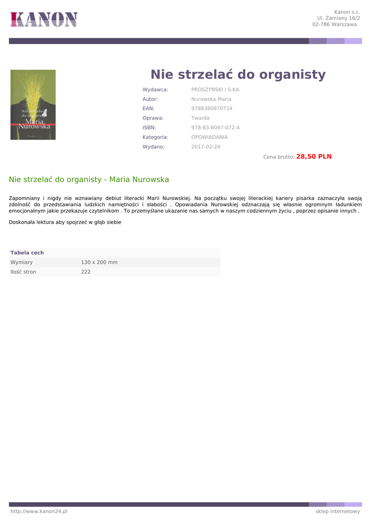 Kanon s.c. Ul. Zamiany 16/2 02-786 Warszawa Nie strzelać do organisty Wydawca: PRÓSZYŃSKI I S-KA Autor: Nurowska Maria EAN: 9788380970724 Oprawa: Twarda ISBN: 978-83-8097-072-4 Kategoria: OPOWIADANIA Wydano: 2017-02-24 Cena brutto: 28,50 PLN Nie strzelać do organisty - Maria Nurowska Zapomniany i nigdy nie wznawiany debiut literacki Marii Nurowskiej. Na początku swojej literackiej kariery pisarka zaznaczyła swoją zdolność do przedstawiania ludzkich namiętności i słabości . Opowiadania Nurowskiej odznaczają się własnie ogromnym ładunkiem emocjonalnym jakie przekazuje czytelnikom . To przemyślane ukazanie nas samych w naszym codziennym życiu , poprzez opisanie innych . Doskonała lektura aby spojrzeć w głąb siebie Tabela cech Wymiary 130 x 200 mm Ilość stron 222 http://www.kanon24.pl sklep internetowy