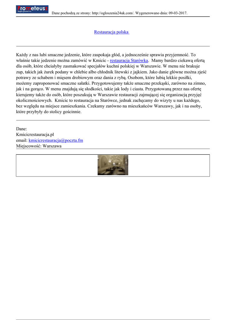 Dane pochodzą ze strony: http://ogloszenia24uk.com/. Wygenerowano dnia: 09-03-2017. Restauracja polska Każdy z nas lubi smaczne jedzenie, które zaspokaja głód, a jednocześnie sprawia przyjemność. To właśnie takie jedzenie można zamówić w Kmicic - restauracja Starówka. Mamy bardzo ciekawą ofertą dla osób, które chciałyby zasmakować specjałów kuchni polskiej w Warszawie. W menu nie brakuje zup, takich jak żurek podany w chlebie albo chłodnik litewski z jajkiem. Jako danie główne można zjeść potrawy ze schabem i mięsem drobiowym oraz dania z rybą. Osobom, które lubią lekkie posiłki, możemy zaproponować smaczne sałatki. Przygotowujemy także smaczne przekąski, zarówno na zimno, jak i na gorąco. W menu znajdują się słodkości, takie jak lody i ciasta. Przygotowaną przez nas ofertę kierujemy także do osób, które poszukują w Warszawie restauracji zajmującej się organizacją przyjęć okolicznościowych. Kmicic to restauracja na Starówce, jednak zachęcamy do wizyty u nas każdego, bez względu na miejsce zamieszkania. Czekamy zarówno na mieszkańców Warszawy, jak i na osoby, które przybyły do stolicy gościnnie. Dane: Kmicicrestauracja.pl email: [email protected] Miejscowość: Warszawa