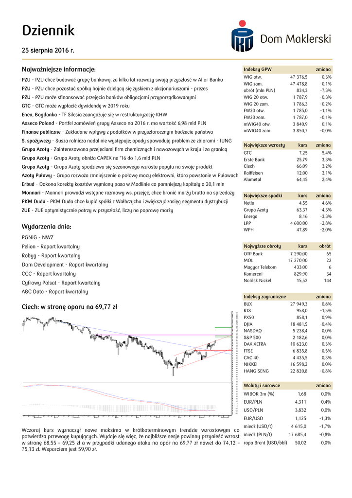 Dziennik 25 sierpnia 2016 r. Najważniejsze informacje: Indeksy GPW WIG otw. WIG zam. obrót (mln PLN) WIG 20 otw. WIG 20 zam. FW20 otw. FW20 zam. mWIG40 otw. mWIG40 zam. PZU - PZU chce budować grupę bankową, za kilka lat rozważy swoją przyszłość w Alior Banku PZU - PZU chce pozostać spółką hojnie dzielącą się zyskiem z akcjonariuszami - prezes PZU - PZU może sfinansować przejęcia banków obligacjami przyporządkowanymi GTC - GTC może wypłacić dywidendę w 2019 roku Enea, Bogdanka - TF Silesia zaangażuje się w restrukturyzację KHW Asseco Poland - Portfel zamówień grupy Asseco na 2016 r. ma wartość 6,98 mld PLN Finanse publiczne - Zakładane wpływy z podatków w przyszłorocznym budżecie państwa S. spożywczy - Susza rolnicza nadal nie występuje; opady spowodują problem ze zbiorami - IUNG Największe wzrosty Grupa Azoty - Zainteresowana przejęciami firm chemicznych i nawozowych w kraju i za granicą Grupa Azoty - Grupa Azoty obniża CAPEX na '16 do 1,6 mld PLN Grupa Azoty - Grupa Azoty spodziewa się sezonowego wzrostu popytu na swoje produkt Azoty Puławy - Grupa rozważa zmniejszenie o połowę mocy elektrowni, która powstanie w Puławach Erbud - Dokona korekty kosztów wymiany pasa w Modlinie co pomniejszy kapitały o 20,1 mln Monnari - Monnari prowadzi wstępne rozmowy ws. przejęć, chce bronić marży brutto na sprzedaży GTC Erste Bank Ciech Raiffeisen Alumetal Największe spadki PKM Duda - PKM Duda chce kupić spółki z Wałbrzycha i zwiększyć zasięg segmentu dystrybucji Netia Grupa Azoty Energa LPP WPH ZUE - ZUE optymistycznie patrzy w przyszłość, liczy na poprawę marży Wydarzenia dnia: zmiana 47 376,5 47 478,8 834,3 1 787,9 1 786,3 1 785,0 1 787,0 3 840,9 3 850,7 -0,3% -0,1% -7,3% -0,3% -0,2% -1,1% -0,1% 0,1% -0,0% kurs zmiana 7,25 25,79 66,09 12,00 64,45 5,4% 3,3% 3,2% 3,1% 2,4% kurs zmiana 4,55 63,37 8,16 4 600,00 47,89 -4,6% -4,3% -3,3% -2,8% -2,0% kurs obrót 7 290,00 17 270,00 433,00 829,90 15,52 65 22 6 34 144 PGNiG - NWZ Pelion - Raport kwartalny Najwyższe obroty Robyg - Raport kwartalny OTP Bank MOL Magyar Telekom Komercni Norilsk Nickel Dom Development - Raport kwartalny CCC - Raport kwartalny Cyfrowy Polsat - Raport kwartalny ABC Data - Raport kwartalny Indeksy zagraniczne Ciech: w stronę oporu na 69,77 zł 87 86 85 84 83 82 81 80 79 78 77 76 75 74 73 72 71 70 69 68 67 66 65 64 63 62 61 60 59 58 57 56 55 54 53 52 51 50 49 48 BUX RTS PX50 DJIA NASDAQ S&P 500 DAX XETRA FTSE CAC 40 NIKKEI HANG SENG zmiana 27 949,3 958,0 858,1 18 481,5 5 238,4 2 182,6 10 623,0 6 835,8 4 435,5 16 598,2 22 820,8 0,8% -1,5% 0,9% -0,4% 0,0% 0,0% 0,3% -0,5% 0,3% 0,0% -0,8% 47 46 45 44 65 60 55 50 Waluty i surowce zmiana 45 40 35 30 25 WIBOR 3m (%) 1,68 0,0% EUR/PLN 4,311 -0,4% USD/PLN 3,832 0,0% EUR/USD 1,125 -1,3% 4 615,0 -1,7% 20 15 10 5 0 -5 -10 -15 -20 -25 16 23 30 7 D ec em ber 14 21 28 4 11 2016 18 25 1 8 February 15 22 29 7 Marc h 14 21 29 4 April 11 18 25 2 9 May 16 23 30 6 J une 13 20 27 4 J uly 11 18 25 1 8 Augus t 16 22 29 5 12 Septem ber miedź (USD/t) Wczoraj kurs wyznaczył nowe maksima w krótkoterminowym trendzie wzrostowym co 17 685,4 potwierdza przewagę kupujących. Wydaje się więc, że najbliższe sesje powinny przynieść wzrost miedź (PLN/t) ropa Brent (USD/bbl) 50,02 w stronę 68,55 – 69,25 zł a w przypadki udanego ataku na opór na 69,77 zł nawet do 74,12 – 75,13 zł. Wsparciem jest 59,90 zł. -0,8% 0,0% Dziennik 25 sierpnia 2016 r. Najważniejsze informacje: PZU PZU chce budować grupę bankową, za kilka lat rozważy swoją przyszłość w Alior Banku PZU chce budować grupę bankową i ocenia, że inwestycje w ten sektor to najlepszy sposób na spożytkowanie kapitału nadwyżkowego. W ciągu kilku lat spółka może podejmować decyzje właścicielskie dotyczące swojego zaangażowania w Alior Bank - poinformował Michał Krupiński, prezes PZU. (PAP) PZU PZU chce pozostać spółką hojnie dzielącą się zyskiem z akcjonariuszami - prezes PZU ocenia, że planowane inicjatywny wzrostowe nie oznaczają obniżenia poziomu dywidendy i PZU pozostanie spółką hojnie dzielącą się zyskiem z akcjonariuszami - poinformował Michał Krupiński, prezes PZU. PZU chce w ciągu kilku tygodni przedstawić nową politykę dywidendową. (PAP) PZU PZU może sfinansować przejęcia banków obligacjami przyporządkowanymi Jak podaje „Parkiet”, jednym ze sposobów sfinansowania planowanych przez PZU akwizycji mają być obligacje podporządkowane. W razie emisji, część obligacji może zostać skierowana do inwestorów detalicznych – poinformował Krzysztof Bachta, dyrektor biura strategii i projektów w PZU. (Parkiet) GTC GTC może wypłacić dywidendę w 2019 roku GTC myśli o wypłacie dywidendy. Najwcześniej mogłoby do niej dojść w 2019 roku – powiedział Erez Boniel, dyrektor finansowy spółki. (PAP) Enea, Bogdanka TF Silesia zaangażuje się w restrukturyzację KHW Towarzystwo Finansowe Silesia będzie trzecim - obok spółek Enea i Węglokoks - podmiotem zaangażowanym finansowo w restrukturyzację Katowickiego Holdingu Węglowego (KHW) – poinformował minister energii Krzysztof Tchórzewski. Inwestorzy mają wnieść do nowego podmiotu w sumie ok. 700 mln PLN, z czego 200 mln PLN – TF Silesia. Enea ma zainwestować 350 mln PLN, a Węglokoks – 150 mln PLN. (PAP) Asseco Poland Portfel zamówień grupy Asseco na 2016 r. ma wartość 6,98 mld PLN Portfel zamówień grupy Asseco Poland na 2016 r. ma wartość 6,98 mln PLN. Przed rokiem Asseco informowało, że portfel zamówień grupy na 2015 r. na koniec czerwca miał wartość 6.069 mln PLN. (PAP) Finanse publiczne Zakładane wpływy z podatków w przyszłorocznym budżecie państwa Rząd założył w projekcie przyszłorocznego budżetu, że z podatku od instytucji finansowych pozyska 3,9 mld PLN. Z kolei przychody z tytułu podatku handlowego, według założeń rządu, mają wynieść 1,6 mld PLN. W planie uwzględniony jest też podatek od kopalin,