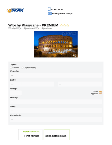 61 852 45 72 [email protected] Włochy Klasyczne - PREMIUM Włochy / Wyc. objazdowe / Wyc. objazdowe Dojazd: Autobus Dojazd własny Wyjazd z: Osoby: Noclegi: Dzień wyjazdu Terminy: Pokój: Wyżywienie: Najtańsza oferta First Minute cena katalogowa do 12 marca 2017: 839,40 zł do 12 marca 2017: 839,40 zł do 14 września 2017: 1958,60 zł do 14 września 2017: 1958,60 zł Suma: 2798,00 Suma: zł 2798,00 zł Opis oferty Miejscowość Przejazd autokarem PREMIUM autokar-premium-oskar-tablet-gniazdko-usb-wygodne-fotele Opinie Realizacja imprezy autokarami PREMIUM to gwarancja: transportu autokarami z roczników 2015 i 2016 produkcji Irizar i VDL Rozkład jazdy indywidualnego, multimedialnego systemu rozrywki - tablet z dotykowym ekranem w każdym zagłówku (filmy, gry, muzyka itp.). Możliwość podłączenia własnego nośnika danych poprzez wejście AUX lub USB. najwyższej klasy skórzanych lub półskórzanych foteli z możliwością regulacji oparcia lub/i zagłówka największej w Polsce przestrzeni między siedzeniami małej półki przed każdym siedzeniem + siateczki na czasopisma, książki czy telefon bezpłatnego dostępu do sieci WiFi na terenie Polski* gniazdek elektrycznych 230V wydajnej klimatyzacji sterowanej indywidualnie bogato wyposażonego barku udostępnionego w czasie jazdy WC na pokładzie autokaru Idealna i komfortowa podróż… ZAWSZE! Na ternie Polski GWARANTUJEMY, że wszystkie przejazdy realizowane są autobusem, busem lub samochodem osobowym. Zapewnimy komfortowy transport na każdym etapie podróży. Ważne: Autokar Premium jest autokarem docelowym. *jakość usług internetowych może różnić się w zależności od jakości sygnału TOUR GUIDE oprowadzanie z indywidualnym systemem nagłośnieniowym Mobilny zestaw audio: indywidulany zestaw słuchawkowy połączony bezprzewodowo z mikrofonem pilota/przewodnika. Pakiet KOMFORT gwarancja wyboru miejsca w autokarze napoje w autokarze w cenie (6 x do wyboru: kawa, herbata, zimny napój 0,2l) cena: 50 zł/os Pakiet PRESTIGE gwarancja wyboru miejsca w autokarze napoje w autokarze w cenie (6 x do wyboru: kawa, herbata, zimny napój 0,2l) pierwszeństwo wejścia na pokład autokaru nadbagaż 5 kg w cenie napoje do obiadokolacji (0,2l) cena: 100 zł/os Zakwaterowanie Hotele *** położone na trasach pomiędzy odwiedzanymi miastami. Pokoje z łazienkami, urządzone w klasycznym stylu, z klimatyzacją lub/i dostęp do Internetu Wi-Fi. W hotelach znajdują się restauracje, dodatkowo niektóre z nich mogą posiadać basen. Przykładowe zakwaterowanie, które może różnić się w poszczególnych terminach: Boara Pisani (1) - Hotel Petrarca, Montecatini Terme (1) - Hotel Santa Barbara, Bracciano (3) Montecatini Terme (1) Hotel Brasile Dostępne opcje zakwaterowania: pokój 2 - osobowy pokój 3 - osobowy dokwaterowanie (bez dopłat*) lub pokój 1 - osobowy (dopłata) Dostępne opcje wyżywienia wyżywienie BB: 6 śniadań wyżywienie HB: 6 śniadań + 6 obiadokolacji; możliwość dokonania rezerwacji w wersji HB lub obowiązkowa dopłata do obiadokolacji 50 €/os. (płatne u pilota w autokarze) śniadania serwowane: pieczywo, ser, szynka, dżem, napoje: kawa, herbata, sok obiadokolacje serwowane: zupa/przystawka, danie główne, sałatka/deser/owoc; napoje do obiadokolacji dodatkowo płatne Ubezpieczenie Warunki ubezpieczenia Bezpieczne Podróże Signal Iduna dokument do pobrania www.oskar.com.pl/zalaczniki/owu Warunki ubezpieczenia Kosztów Imprezy Turystycznej Signal Iduna dokument do pobrania www.oskar.com.pl/zalaczniki/owurg Karta Dużej Rodziny www.oskar.com.pl/zalaczniki/karta_duzej_rodziny Warunki promocji FIRST MINUTE www.oskar.com.pl/zalaczniki/warunki_promocji Turystyczny Fundusz Gwarancyjny W związku z powołaniem do życia w dniu 26.11.2016 Turystycznego Funduszu Gwarancyjnego każdy klient Biura Podróży Oskar zobowiązany jest do zapłaty kwoty w wysokości 10zł/os. przy każdorazowej rezerwacji imprezy turystycznej (obowiązuje od dnia 26.11.2016). Kwota przeznaczona na Turystyczny Fundusz Gwarancyjny zostanie automatycznie doliczona do wartości rezerwacji (w momencie jej dokonania). Wyjątkiem są imprezy turystyczne odbywające się w krajach posiadających granicę z Rzeczpospolitą Polską. Składka nie jest przychodem biura. Udogodnienia Klimatyzacja Regulowane fotele Tacki Multimedia Nowoczesna flota Zawodowy kierowca Pasy bezpieczeństwa Toaleta w autokarze Podnóżki Dla rodzin z dziećmi Wi-Fi Bez paszportu Premium Elite Restauracja hotelowa Tour guide Program ramowy DZIEŃ 1 (sobota) Wyjazd z Polski zgodnie z rozkładem jazdy autokarów. Przejazd przez Czechy, Austrię. (Trasa od granicy ok. 920 km) DZIEŃ 2 (niedziela) Przyjazd do Punta Sabbioni w godzinach przedpołudniowych, następnie rejs statkiem do Wenecji. Jest to niezwykłe miasto znajdujące się na liście UNESCO, położone na stu wyspach oplecionych labiryntem kanałów, którego ulice są pełne wody o kolorach lazuru i zieleni. Zwiedzanie Placu św. Marka - zwanego najpiękniejszym salonem Europy. Brzegi kanałów łączy ok. 400 mostów. Podczas wycieczki odwiedzimy najwspanialsze z nich - Most Westchnień i Most Rialto. Przejazd do hotelu w okolicy Bolonii. Obiadokolacja. Nocleg. (Trasa ok. 210 km) DZIEŃ 3 (poniedziałek) Śniadanie. Przyjazd do Florencji - perły Toskanii. Florencja to muzeum pod gołym niebem. Tu oddycha się sztuką. W mieście, gdzie znajduje się ponad 50% wszystkich włoskich zabytków zwiedzimy m.in. Katedrę Santa Maria del Fiore ze słynną czerwoną kopułą, która dominuje nad dachami Florencji, kompleks architektoniczny San Lorenzo, Bazylikę Santa Croce, Piazza Della Signoria, dom Dantego, Most Złotników. Przejazd do hotelu. Obiadokolacja. Nocleg. (Trasa ok. 100 km) DZIEŃ 4 (wtorek) Śniadanie. Przejazd do Sieny. Atrakcją okolonego średniowiecznymi murami miasta jest piękno jego zabudowań - majestatyczny, gotycki zespół, którym można się zachwycać, nie wchodząc do żadnego muz