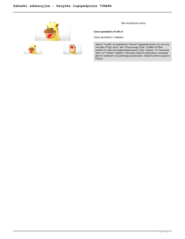 Zabawki edukacyjne : Pacynka logopedyczna ?YRAFA Nie ma jeszcze oceny Cena sprzeda?y 41,00 z? Cena sprzeda?y z rabatem Zapro? ?yrafk? do wspólnych ?wicze? logopedycznych, bo ma ona nie tylko d?ug? szyj?, ale i d?uuuuuugi j?zyk. ?yrafka ch?tnie poka?e Ci, jaki ma wygimnastykowany j?zyk i sprawi, ?e ?wiczenia stan? si? ?wietn? zabaw?. Pacynka zosta?a wykonana z wysokiej jako?ci materia?u od polskiego producenta. Zosta?a tak?e uszyta w Polsce 1 / 1 Powered by TCPDF (www.tcpdf.org)