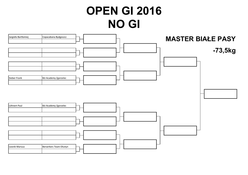 OPEN GI 2016 NO GI Jargieło Bartłomiej Copacabana Bydgoszcz MASTER BIAŁE PASY -73,5kg Sieber Frank BJJ Academy Zgorzelec Löhnert Paul BJJ Academy Zgorzelec Leonik Mariusz Berserkers Team Olsztyn OPEN GI 2016 NO GI MASTER BIAŁE PASY -79,5kg Szałek Krzysztof Darek Kunikowski Zenith Vera Fight Club Gracie Barra Zamorski Adrian Wroxgym OPEN GI 2016 NO GI Gabryluk Dawid Marga Radom MASTER BIAŁE PASY -85,5kg Karkosa Paweł Copacabana Bydgoszcz OPEN GI 2016 NO GI Wojtanowski Michał Gold Team Świdwin MASTER BIAŁE PASY -91,5kg Wojciech Hess Next Level BJJ Opole OPEN GI 2016 NO GI MASTER BIAŁE PASY Krajewski Maciej Ołów Przemek Grappler Grudziądz Dragons Den Lembowicz Wojciech Gold Team -97,5kg