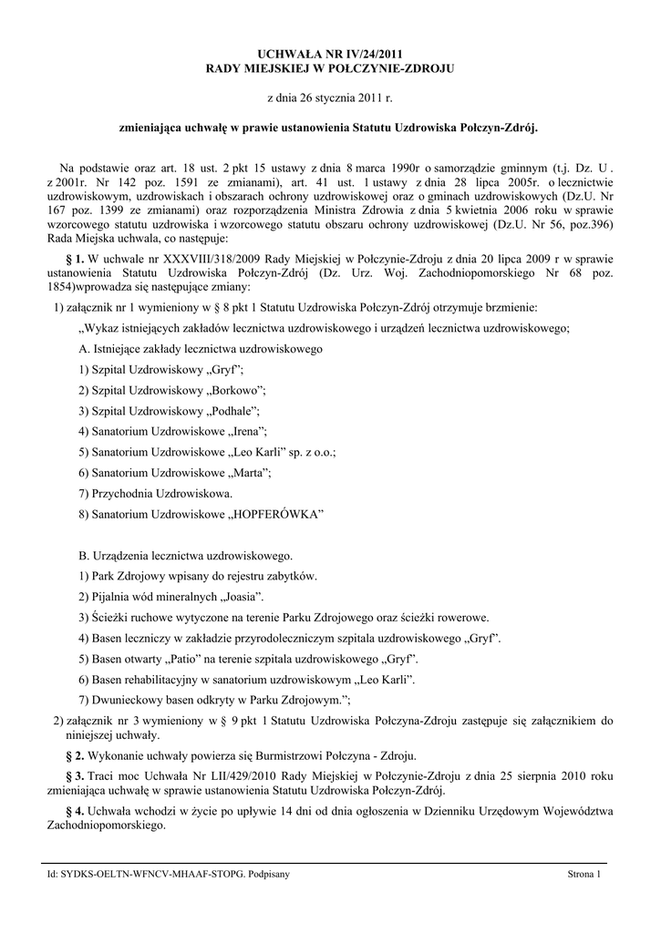 UCHWAŁA NR IV/24/2011 RADY MIEJSKIEJ W POŁCZYNIE-ZDROJU z dnia 26 stycznia 2011 r. zmieniająca uchwałę w prawie ustanowienia Statutu Uzdrowiska Połczyn-Zdrój. Na podstawie oraz art. 18 ust. 2 pkt 15 ustawy z dnia 8 marca 1990r o samorządzie gminnym (t.j. Dz. U . z 2001r. Nr 142 poz. 1591 ze zmianami), art. 41 ust. 1 ustawy z dnia 28 lipca 2005r. o lecznictwie uzdrowiskowym, uzdrowiskach i obszarach ochrony uzdrowiskowej oraz o gminach uzdrowiskowych (Dz.U. Nr 167 poz. 1399 ze zmianami) oraz rozporządzenia Ministra Zdrowia z dnia 5 kwietnia 2006 roku w sprawie wzorcowego statutu uzdrowiska i wzorcowego statutu obszaru ochrony uzdrowiskowej (Dz.U. Nr 56, poz.396) Rada Miejska uchwala, co następuje: § 1. W uchwale nr XXXVIII/318/2009 Rady Miejskiej w Połczynie-Zdroju z dnia 20 lipca 2009 r w sprawie ustanowienia Statutu Uzdrowiska Połczyn-Zdrój (Dz. Urz. Woj. Zachodniopomorskiego Nr 68 poz. 1854)wprowadza się następujące zmiany: 1) załącznik nr 1 wymieniony w § 8 pkt 1 Statutu Uzdrowiska Połczyn-Zdrój otrzymuje brzmienie: „Wykaz istniejących zakładów lecznictwa uzdrowiskowego i urządzeń lecznictwa uzdrowiskowego; A. Istniejące zakłady lecznictwa uzdrowiskowego 1) Szpital Uzdrowiskowy „Gryf”; 2) Szpital Uzdrowiskowy „Borkowo”; 3) Szpital Uzdrowiskowy „Podhale”; 4) Sanatorium Uzdrowiskowe „Irena”; 5) Sanatorium Uzdrowiskowe „Leo Karli” sp. z o.o.; 6) Sanatorium Uzdrowiskowe „Marta”; 7) Przychodnia Uzdrowiskowa. 8) Sanatorium Uzdrowiskowe „HOPFERÓWKA” B. Urządzenia lecznictwa uzdrowiskowego. 1) Park Zdrojowy wpisany do rejestru zabytków. 2) Pijalnia wód mineralnych „Joasia”. 3) Ścieżki ruchowe wytyczone na terenie Parku Zdrojowego oraz ścieżki rowerowe. 4) Basen leczniczy w zakładzie przyrodoleczniczym szpitala uzdrowiskowego „Gryf”. 5) Basen otwarty „Patio” na terenie szpitala uzdrowiskowego „Gryf”. 6) Basen rehabilitacyjny w sanatorium uzdrowiskowym „Leo Karli”. 7) Dwunieckowy basen odkryty w Parku Zdrojowym.”; 2) załącznik nr 3 wymieniony w § 9 pkt 1 Statutu Uzdrowiska Połczyna-Zdroju zastępuje się załącznikiem do niniejszej uchwały. § 2. Wykonanie uchwały powierza się Burmistrzowi Połczyna - Zdroju. § 3. Traci moc Uchwała Nr LII/429/2010 Rady Miejskiej w Połczynie-Zdroju z dnia 25 sierpnia 2010 roku zmieniająca uchwałę w sprawie ustanowienia Statutu Uzdrowiska Połczyn-Zdrój. § 4. Uchwała wchodzi w życie po upływie 14 dni od dnia ogłoszenia w Dzienniku Urzędowym Województwa Zachodniopomorskiego. Id: SYDKS-OELTN-WFNCV-MHAAF-STOPG. Podpisany Strona 1 Załącznik do Uchwały Nr IV/24/2011 Rady Miejskiej w Połczynie-Zdroju z dnia 26 stycznia 2011 r. Zalacznik.pdf Id: SYDKS-OELTN-WFNCV-MHAAF-STOPG. Podpisany Strona 2
