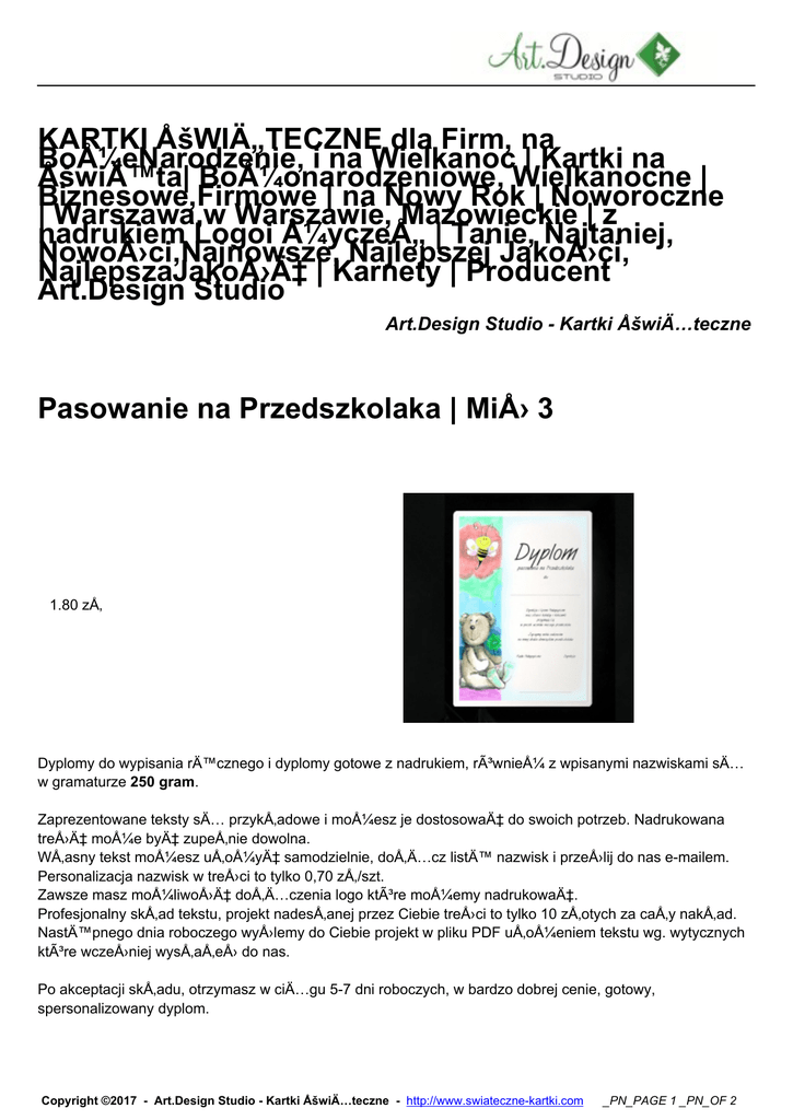 KARTKI ÅšWIÄ„TECZNE dla Firm, na BożeNarodzenie, i na Wielkanoc | Kartki na ÅšwiÄ™ta| Bożonarodzeniowe, Wielkanocne | Biznesowe,Firmowe | na Nowy Rok | Noworoczne | Warszawa,w Warszawie, Mazowieckie | z nadrukiem Logoi życzeÅ„ | Tanie, Najtaniej, NowoÅ›ci,Najnowsze, Najlepszej JakoÅ›ci, NajlepszaJakość | Karnety | Producent Art.Design Studio Art.Design Studio - Kartki ÅšwiÄ…teczne Pasowanie na Przedszkolaka | MiÅ› 3 1.80 zÅ‚ Dyplomy do wypisania rÄ™cznego i dyplomy gotowe z nadrukiem, również z wpisanymi nazwiskami sÄ… w gramaturze 250 gram. Zaprezentowane teksty sÄ… przykÅ‚adowe i możesz je dostosować do swoich potrzeb. Nadrukowana treść może być zupeÅ‚nie dowolna. WÅ‚asny tekst możesz uÅ‚ożyć samodzielnie, dołącz listÄ™ nazwisk i przeÅ›lij do nas e-mailem. Personalizacja nazwisk w treÅ›ci to tylko 0,70 zÅ‚/szt. Zawsze masz możliwość dołączenia logo które możemy nadrukować. Profesjonalny skÅ‚ad tekstu, projekt nadesÅ‚anej przez Ciebie treÅ›ci to tylko 10 zÅ‚otych za caÅ‚y nakÅ‚ad. NastÄ™pnego dnia roboczego wyÅ›lemy do Ciebie projekt w pliku PDF uÅ‚ożeniem tekstu wg. wytycznych które wczeÅ›niej wysÅ‚aÅ‚eÅ› do nas. Po akceptacji skÅ‚adu, otrzymasz w ciÄ…gu 5-7 dni roboczych, w bardzo dobrej cenie, gotowy, spersonalizowany dyplom. Copyright ©2017 - Art.Design Studio - Kartki ÅšwiÄ…teczne - http://www.swiateczne-kartki.com _PN_PAGE 1 _PN_OF 2 Pasowanie na przedszkolaka to bardzo ważne wydarzenie w życiu dziecka i jego rodziców. DziÄ™ki naszym dyplomom bÄ™dziecie mogli na dÅ‚ugo pozostawić we wspomnieniach te wspaniaÅ‚e chwile, kiedy dziecko wstÄ™powaÅ‚o w poczet grupy przedszkolnej... Informacja o sprzedawcy Copyright ©2017 - Art.Design Studio - Kartki ÅšwiÄ…teczne - http://www.swiateczne-kartki.com _PN_PAGE 2 _PN_OF 2