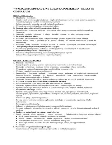 WYMAGANIA EDUKACYJNE Z JĘZYKA POLSKIEGO – KLASA III GIMNAZJUM OCENA CELUJĄCA 1. Słuchanie i mówienie  Uczeń potrafi w trakcie zajęć zbudować i wygłosić kilkuminutową wypowiedź poprawną językowo. i charakteryzującą się wysokim poziomem merytorycznym.  Celnie argumentuje, wykazując się erudycją interdyscyplinarną.  Wykazuje się umiejętnością głosowej interpretacji tekstu. 2. Czytanie tekstów literackich i innych tekstów kultury  Samodzielnie i krytycznie analizuje i interpretuje teksty pozaprogramowe, dzieła ikonograficzne i muzyczne.  Odczytuje symbole kulturowe i aluzje literackie wpisane w teksty pozaprogramowe. 3. Tworzenie własnego tekstu  Podejmuje próby tworzenia wyżej zorganizowanego gatunku wypowiedzi - eseju, recenzji.  Tworzy własne teksty i publikuje je w gazetce szkolnej, na stronach internetowych, pismach dla młodzieży itp.  Podejmuje próby tworzenia własnych tekstów w ramach ogłaszanych konkursów zewnętrznych. 4. Praktyczne posługiwanie się wiedzą z nauki o języku  Współtworzy gazetkę szkolną, dokonując korekty językowej zamieszczanych w niej artykułów. 5. Poprawność ortograficzna i interpunkcyjna  Zna zasady ortografii i interpunkcji, i dokumentuje je bezbłędnym zapisem.  Samodzielnie przygotowuje ćwiczenia, krzyżówki, diagramy. OCENA BARDZO DOBRA 1. Słuchanie i mówienie  Buduje logiczne, spójne i poprawne merytorycznie wypowiedzi na określony temat.  Dyskutuje, polemizuje, przytacza trafne argumenty, uzasadniając własne stanowisko.  Wykazuje się bardzo dobrą znajomością wszystkich lektur programowych.  Wygłasza z pamięci fragmenty prozy lub poezji.  Samodzielnie i krytycznie analizuje i interpretuje teksty, posługując się terminologią z zakresu teorii literatury. Sprawnie posługuje się formami wypowiedzi: opis, opowiadanie, charakterystyka, streszczenie, sprawozdanie, głos w dyskusji.  Stosownie do sytuacji buduje wypowiedzenia mające charakter: perswazji, parafrazy, komentarza. 2. Czytanie tekstów literackich i innych tekstów kultury  Płynnie i bezbłędnie czyta, interpretuje tekst poprzez właściwą intonację  Zna środki wyrazu typowe dla różnych dziedzin sztuki i umie odczytać ich funkcje.  Sprawnie odczytuje informacje zawarte w aktach normatywnych, mapach, tabelach, wykresach. 3. Tworzenie wła snego t ekst u  Sprawnie redaguje pisemne formy wypowiedzi: notatka, opis, opis przeżyć wewnętrznych, charakterystyka, opowiadanie, opowiadanie z dialogiem, list, dziennik, pamiętnik, streszczenie, rozprawka, wywiad.  Wprowadza cytaty i poprawnie je zapisuje.  Tworzy wzorcowe teksty użytkowe: ogłoszenia, instrukcje, zawiadomienia, regulaminy, CV, list motywacyjny  Tworzy przypisy i bibliografię.  Dokonuje oryginalnego przekładu intersemiotycznego dzieła literackiego.  Sprawnie dokonuje różnorodnych operacji na tekście: streszcza, rozwija, dokonuje adaptacji, stylizacji, parafrazy. 4. Praktyczne posługiwanie się wiedzą z nauki o języku  Uczeń, tworząc teksty mówione i pisane, sprawnie i funkcjonalnie wykorzystuje wiedzę z zakresu:  fleksji /zna części mowy i ich funkcje, osobliwości w odmianie/  składni /zdania, równoważniki, zdania pojedyncze, złożone, wielokrotnie złożone/  słowotwórstwa /budowa wyrazu, złożenia, zestawienia, neologizmy/  frazeologii /rozumie znaczenie związku frazeologicznego, stosuje jew wypowiedziach/  fonetyki 5. Poprawność ortograficzna i interpunkcyjna  Uczeń zna zasady ortografii i interpunkcji i potwierdza to bezbłędnym zapisem. OCENA DOBRA 1. Słuchanie i mówienie  Słucha uważnie wypowiedzi i potrafi dokonać selekcji przekazywanych informacji.  Tworzy poprawne składniowo i merytorycznie wypowiedzi wielozdaniowe.  Bierze udział w dyskusji, popierając własne zdanie trafnie dobranymi argumentami.  Poprawnie posługuje się wymaganymi programowo formami wypowiedzi.  Dobrze zna treści lektur, wykorzystuje konteksty niezbędne do ich interpretacji.  Bezbłędnie wygłasza z pamięci wiersze lub/i fragmenty prozy. 2. Czytanie tekstów literackich i innych tekstów kultury  Uczeń czyta płynnie i bezbłędnie, ze zrozumieniem.  Zna środki wyrazu literatury, teatru, filmu, mediów i umie odczytać ich funkcje.  Czyta teksty kultury na poziomie dosłownym, symbolicznym i przenośnym.  Dostrzega konteksty niezbędne do interpretacji tekstów kultury.  Dostrzega wartości wpisane w teksty kultury. 3. Tworzenie własnego tekstu  Poprawnie redaguje pisemne formy wypowiedzi: opis, opowiadanie, streszczenie, rozprawka, sprawozdanie, charakterystyka, pamiętnik, wywiad.  Tworzy teksty użytkowe: regulamin, list motywacyjny, list otwarty.  Umiejętnie dokonuje operacji przekształcenia tekstu: streszcza, rozwija, dokonuje adaptacji i stylizacji Dokonuje przekładu intersemiotycznego dzieła literackiego, plastycznego, muzycznego.  Świadomie i sprawnie posługuje się groteską, absurdem, komizmem i patosem, tworząc własne teksty. 4. Praktyczne posługiwanie się wiedzą z nauki o języku  Uczeń, tworząc własne teksty, sprawnie posługuje się widza z zakresu:  fleksji /zna części mowy i ich funkcje w zdaniu/ składni /stosuje różne rodzaje wypowiedzeń i umie je nazwać/  słowotwórstwa /złożenia, zrosty, zestawienia, neologizmy, zapożyczenia/  frazeologii / zna znaczenie powszechnie przyjętych frazeologizmów i umie je zastosować/ 5. Poprawność ortograficzna i interpunkcyjna  Zna reguły ortograficzne i interpunkcyjne, dopuszcza się 1 błąd ortograficzny w tekście dyktanda.  Zna mechanizmy procesów fonetycznych /upodobnienia, uproszczenia, utrata dźwięczności w wygłosie/ i dokumentuje to bezbłędnym zapisem. OCENA DOSTATECZNA 1. Słuchanie i mówienie  Słucha uważnie wypowiedzi i dokumentuje to, wskazując główną myśl i odpowiadając na pytania.  Zna treść lektur, umie odtworzyć najważniejsze wydarzenia.  Buduje krótkie, logiczne wypowiedzi na temat lektury, filmu, różnych problemów codz