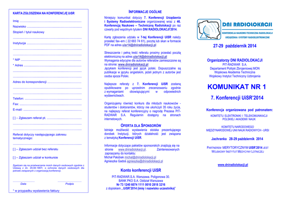 KARTA ZGŁOSZENIA NA KONFERENCJĘ UISR Imię ......................................................................... Nazwisko ................................................................. Stopień / tytuł naukowy ................................................................................. Instytucja ................................................................. INFORMACJE OGÓLNE Niniejszy komunikat dotyczy 7. Konferencji Urządzenia i Systemy Radioelektroniczne organizowanej wraz z 46. Konferencją Naukowo – Techniczną Radiolokacji po raz czwarty pod wspólnym tytułem DNI RADIOLOKACJI’2014. Kartę zgłoszenia udziału w 7-tej Konferencji UiSR należy przesłać fax–em ( 22 683 74 61), pocztą lub skan w formacie PDF na adres [email protected] ................................................................................. ................................................................................. * NIP ....................................................................... * Adres .................................................................... ................................................................................. ................................................................................. Adres do korespondencji ........................................ ................................................................................. ................................................................................. Streszczenie i pełną treść referatu prosimy przesłać pocztą elektroniczną na adres [email protected] Wymagania edycyjne dla autorów referatów zamieszczone są na stronie: www.dniradiolokacji.pl Językiem konferencji jest język polski. Dopuszczalne są publikacje w języku angielskim, jeżeli jednym z autorów jest osoba spoza Polski. Najlepsze referaty z 7. Konferencji UiSR zostaną opublikowane po uprzednim zrecenzowaniu zgodnie z wymaganiami obowiązującymi w odpowiednich wydawnictwach. Telefon: ................................................................... Fax: ......................................................................... E-mail: ..................................................................... [ ] – Zgłaszam referat pt. ......................................... ................................................................................. ................................................................................. Referat dotyczy następującego zakresu tematycznego: ................................................................................. [ ] – Zgłaszam udział bez referatu [ ] – Zgłaszam udział w konkursie Zgadzam się na przetwarzanie moich danych osobowych zgodnie z Ustawą z dn. 29.08.1997r. o ochronie danych osobowych dla potrzeb związanych z organizacją konferencji. ................................. .................................... Data Podpis * w przypadku wystawienia faktury Organizujemy również konkurs dla młodych naukowców studentów i doktorantów, którzy nie ukończyli 35 roku życia, na najlepszy referat konferencyjny o nagrodę Prezesa PITRADWAR S.A. Regulamin dostępny na stronach internetowych. OFERTA DLA SPONSORÓW Istnieje możliwość wystawienia stoiska prezentującego dorobek Instytucji, których działalność jest związana z tematyką Konferencji UiSR. Informacje dotyczące pakietów sponsorskich znajdują się na stronie www.dniradiolokacji.pl. Zainteresowanych zapraszamy do kontaktu: Michał Pałubiak [email protected] Agnieszka Gadoś [email protected] 27-29 październik 2014 Organizatorzy DNI RADIOLOKACJI PIT-RADWAR S.A. Departament Polityki Zbrojeniowej MON Wojskowa Akademia Techniczna Wojskowy Instytut Techniczny Uzbrojenia KOMUNIKAT NR 1 7. Konferencji UiSR’2014 Konferencja organizowana pod patronatem: KOMITETU ELEKTRONIKI I TELEKOMUNIKACJI POLSKIEJ AKADEMII NAUK KOMITETU NARODOWEGO MIĘDZYNARODOWEJ UNII NAUK RADIOWYCH - URSI Jachranka 28-29 październik 2014 PARTNEREM MERYTORYCZNYM UISR’2014 JEST WOJSKOWY INSTYTUT MEDYCYNY LOTNICZEJ www.dniradiolokacji.pl Konto konferencji UiSR PIT-RADWAR.S.A. Warszawa. Poligonowa 30. BANK PKO S.A. Oddział Warszawa Nr 73 1240 6074 1111 0010 2818 3216 z dopiskiem „.UiSR’2014 (imię i nazwisko uczestnika)” Komitet Programowy 7. Konferencji UiSR Marek AMANOWICZ Zbigniew BIELECKI Witold CZARNECKI Andrzej DOBROWOLSKI Piotr GAJEWSKI Adam KAWALEC - przewodniczący Piotr KANIEWSKI Jerzy KAPELEWSKI Krzysztof KULPA –w-ce przew. Mariusz ŁAPIŃSKI Józef MODELSKI Jerzy MIŁOSZ Marek NAŁĘCZ Zenon SZCZEPANIAK – w-ce przew. Bogusław SMÓLSKI Bronisław STEC Cezary SPECHT Stanisław ROSŁONIEC Olaf TRUSZCZYŃSKI Andrzej WITCZAK - sekretarz Marian WNUK Komitet Organizacyjny DNI RADIOLOKACJI Agnieszka GADOŚ Mariusz ŁUSZCZYK Andrzej WITCZAK Lech SZUGAJEW Grzegorz ADAMSKI Michal PAŁUBIAK Justyna JAŃCZUK Jan MATUSZEWSKI Dariusz RODZIK Roman OSTROWSKI Zakres Tematyczny 7. Konferencji UiSR • • • • • • • • • Akustyka i akustoelektronika Anteny Elektronika biomedyczna Kompatybilność elektromagnetyczna Mikrofale Optoelektronika Radiolokacja Radionawigacja Urządzenia i systemy specjalne Terminarz 7. Konferencji UiSR 04.09.2014 22.09.2014 5.10.2014 18.10.2014 Adres do korespondencji: Sekretariat Konferencji UISR’2014 Instytut Radioelektroniki Wydział Elektroniki Wojskowa Akademia Techniczna ul. Gen. S. Kaliskiego 2 00-908 Warszawa Kontakt: tel.: 22 683 9646; email: [email protected] Kontakt w sprawach logistycznych oraz pakietów sponsorskich: przesłanie karty zgłoszenia oraz streszczenia referatu. przesłanie pełnego tekstu referatu PIT-RADWAR S.A. dokonanie opłaty konferencyjnej publikacja na stronach www szczegółowego programu konferencji Michał Pałubiak tel. 22 540 27 89 kom. 695 351 429 email: [email protected] Opłata konferencyjna wynosi 1000 zł i obejmuje: • udział w obradach konferencji UiSR’2014 • materiały konferencyjne UiSR’2014 • zakwate