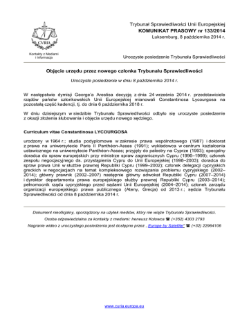 Trybunał Sprawiedliwości Unii Europejskiej KOMUNIKAT PRASOWY nr 133/2014 Luksemburg, 8 października 2014 r. Kontakty z Mediami i Informacja Uroczyste posiedzenie Trybunału Sprawiedliwości Objęcie urzędu przez nowego członka Trybunału Sprawiedliwości Uroczyste posiedzenie w dniu 8 października 2014 r. W następstwie dymisji George’a Arestisa decyzją z dnia 24 września 2014 r. przedstawiciele rządów państw członkowskich Unii Europejskiej mianowali Constantinosa Lycourgosa na pozostałą część kadencji, tj. do dnia 6 października 2018 r. W dniu dzisiejszym w siedzibie Trybunału Sprawiedliwości odbyło się uroczyste posiedzenie z okazji złożenia ślubowania i objęcia urzędu nowego sędziego. Curriculum vitae Constantinosa LYCOURGOSA urodzony w 1964 r.; studia podyplomowe w zakresie prawa wspólnotowego (1987) i doktorat z prawa na uniwersytecie Paris II Panthéon-Assas (1991); wykładowca w centrum kształcenia ustawicznego na uniwersytecie Panthéon-Assas; przyjęty do palestry na Cyprze (1993); specjalny doradca do spraw europejskich przy ministrze spraw zagranicznych Cypru (1996–1999); członek zespołu negocjacyjnego ds. przystąpienia Cypru do Unii Europejskiej (1998–2003); doradca do spraw prawa Unii w służbie prawnej Republiki Cypru (1999–2002); członek delegacji cypryjskich greckich w negocjacjach na temat kompleksowego rozwiązania problemu cypryjskiego (2002– 2014); główny prawnik (2002–2007) następnie główny adwokat Republiki Cypru (2007–2014) i dyrektor departamentu prawa europejskiego służby prawnej Republiki Cypru (2003–2014); pełnomocnik rządu cypryjskiego przed sądami Unii Europejskiej (2004–2014); członek zarządu organizacji europejskiego prawa publicznego (Ateny, Grecja) od 2013 r.; sędzia Trybunału Sprawiedliwości od dnia 8 października 2014 r. Dokument nieoficjalny, sporządzony na użytek mediów, który nie wiąże Trybunału Sprawiedliwości. Osoba odpowiedzialna za kontakty z mediami: Ireneusz Kolowca (+352) 4303 2793 Nagranie wideo z uroczystego posiedzenia jest dostępne przez „Europe by Satellite" (+32) 22964106 www.curia.europa.eu
