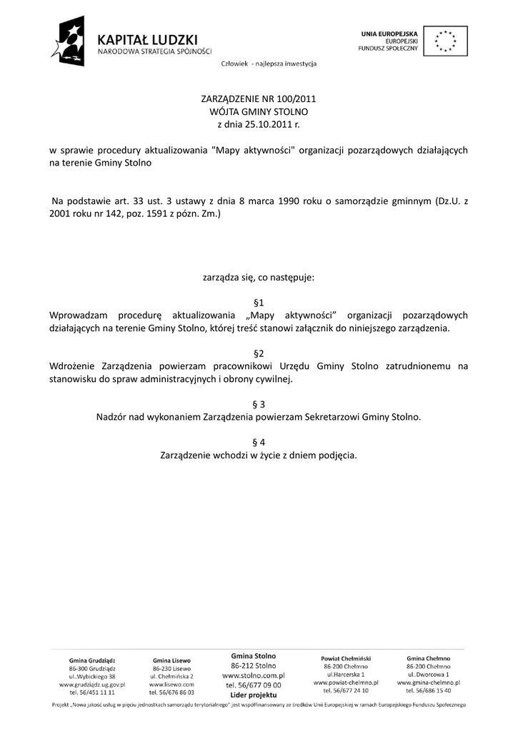 ZARZĄDZENIE NR 100/2011 WÓJTA GMINY STOLNO z dnia 25.10
