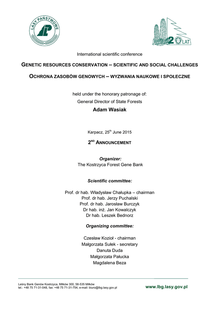 International scientific conference GENETIC RESOURCES CONSERVATION – SCIENTIFIC AND SOCIAL CHALLENGES OCHRONA ZASOBÓW GENOWYCH – WYZWANIA NAUKOWE I SPOŁECZNE held under the honorary patronage of: General Director of State Forests Adam Wasiak Karpacz, 25th June 2015 2ND ANNOUNCEMENT Organizer: The Kostrzyca Forest Gene Bank Scientific committee: Prof. dr hab. Władysław Chałupka – chairman Prof. dr hab. Jerzy Puchalski Prof. dr hab. Jarosław Burczyk Dr hab. inż. Jan Kowalczyk Dr hab. Leszek Bednorz Organizing committee: Czesław Kozioł - chairman Małgorzata Sułek - secretary Danuta Duda Małgorzata Pałucka Magdalena Beza Leśny Bank Genów Kostrzyca, Miłków 300, 58-535 Miłków tel.: +48 75 71-31-048, fax: +48 75 71-31-754, e-mail: [email protected] www.lbg.lasy.gov.pl Dear Sirs! We would like to thank you cordially for registration for the conference: Genetic resources conservation – scientific and social challenges Meeting will start on Thursday, 25th July 2015 at 9:00, in accordance with programme, which will be posted on The Kostrzyca Forest Gene Bank website: http://www.lbg.lasy.gov.pl/aktualnosci//asset_publisher/1M8a/content/konferencja-zaproszenie We look forward to your arrival to Karpacz and to register in Hotel "Artus" (ul. Wilcza 9 Karpacz), where you will receive information about accommodation. All the participants who are at the conference venue on Wednesday, 24th June 2015 are invited to gala dinner at 20:00. Conference programme: 08:00 – 09:00 Registration and Welcome Reception 09:00 – 09:15 Official Opening 09:30 – 13:00 Session I: Ex situ conservation of genetic resources 14:00 – 16:15 Session II: Application of molecular biology in ex situ genetic diversity conservation 16:30 – 17:45 Session III: Restitution of species and forest ecosystems restoration 17:45 – 18:00 Session IV: Poster session 18:00 – 18:30 Discussion and summary of the Conference Coffee breaks: 11:20 – 11:45, 16:15 – 16:30 Lunch: 13:00 – 14:00 Conference languages The official languages of the Conference are English and Polish. Leśny Bank Genów Kostrzyca, Miłków 300, 58-535 Miłków tel.: +48 75 71-31-048, fax: +48 75 71-31-754, e-mail: [email protected] www.lbg.lasy.gov.pl Simultaneous interpretation into the official languages of the conference will be provided during the plenary sessions. Due to necessity of having the reference materials provided to translators., please send full version of your presentations in PDF format to e-mail address: [email protected] till Monday, 15th June 2015. Information for authors: Till 9:00 on the conference day you may: deliver files with your presentations in PPT or PDF format, install poster in snap frazes of 97x67 cm or easels. Abstracts of papers and posters will be printed in a book and provided to participants on the conference day. The time for oral presentation should not exceed 15 minutes (exept for opening speeches - 20 minutes). To display a presentation on the conference day we assure the IT equipment supported in Windows operating system (Microsoft Office 2003). Please note the possibility of printing posters by organizers. For this purpose, please report such a need and send poster in PDF format to e-mail address: [email protected] till Thursday, 18th June 2015. Furthermore, the possibility exists to print the full content of: speeches, reports presented in posters in the post-conference materials. Therefore authors should provide the organizers with editable study till Thursday, 25th June 2015. Specific details on formats will be provided on our website. Venue Hotel „Artus” Wilcza 9, Karpacz http://www.hotelartus.pl Geographical coordinates: N 50°46'3", E 15°45'51" Travel planning We kindly request all guests who will travel by public transport for detailed information till Saturday, 30th May about: date of arrival / departure (date, time), place of arrival /departure, means of transport. On the basis of the information received organizers are likely to help you with planning the trip Specific details on formats will be provided with the 3rd announcement (in the first ten days of June). Leśny Bank Genów Kostrzyca, Miłków 300, 58-535 Miłków tel.: +48 75 71-31-048, fax: +48 75 71-31-754, e-mail: [email protected] www.lbg.lasy.gov.pl Additional information All interested persons may visit The Kostrzyca Forest Gene Bank on Friday, 25th June 2015 (at 7:00 a.m. to 15:00 p.m.). We cordially invite all participants! Registration fee Participants are requested for payment of the registration charge at a rate: 450 PLN. For participants who are giving a lecture the charge is reduced to 50%, i.e.: 225 PLN. Registration fee includes: participation in the conference, conference materials, lunch during the conference, coffee service. Accommodation is not included in the registration fee. The fee for participation in the conference shall be paid into the bank account: 78 2030 0045 1110 0000 0082 5820 with a note: „Conference 25.06.2015, first name, surname” Please pay the registration fee till Wensday, 20th May 2015. The VAT invoice for registration fee shall be issued after receiving the payment and passing the details of the recipient. If this information is not already filled in the application form, we will contact with the request to supplement. If you have any questions, please do not hesitate to ask. On behalf of Organizing Committee, Magdalena Beza, Małgorzata Pałucka Leśny Bank Genów Kostrzyca, Miłków 300, 58-535 Miłków tel.: +48 75 71-31-048, fax: +48 75 71-31-754, e-mail: [email protected] www.lbg.lasy.gov.pl