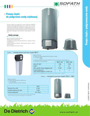 Pompa ciepła z podgrzewaczem wody Pompy ciepła do podgrzewu wody użytkowej Pompy ciepła do podgrzewu wody użytkowej SOFATH dostarczają ciepłą wodę zarówno w zimie, jak i w lecie, całkowicie niezależnie. Urządzenia mogą wytwarzać ciepłą wodę dzięki energii pobranej z powietrza lub gruntu wykorzystując wysoką temperaturę płynu chłodniczego (R134A) krążącego w przewodach otaczających zasobnik. Zalety szeregu Bardzo szybkie podgrzewanie Nowoczesne wzornictwo Urządzenie „gotowe do zainstalowania”: szybkie i łatwe instalowanie Zoptymalizowany dostęp: zdejmowana osłona i pokrywa rewizyjna Bardzo szybki zwrot termiczny c.w.u. – zintegrowana pompa ciepła BECT Zalety produktu Zwarta budowa podgrzewacza (jedna częœć) 2 modele: 200 l 270 l Zintegrowane sterowanie elektroniczne z czytelnym wyœwietlaczem Ochrona przed legionellą BECT 200 BECT 300 Moc PC (W)* 1700 1700 3,7 3,7 Moc grzałki wspomagającej (W) 2 400 2 400 Czas podgrzewu (bez wspomagania) 15-60°C (h) 5 7 COP* * Zgodnie z normą PN-EN 255-3; dla: woda 15°C-51°C, powietrze 15°C – 70% RH c.w.u. – niezależna pompa ciepła 300 L GEO Zalety produktu Pojemnoœć zasobnika: 300 litrów 1 model: GEO (poziomy kolektor geotermiczny) GEO Średnia Pcalo (W) 2 000 Grzałka elektryczna (W) 3 000 Czas podgrzewu* 6h 15min * Przy wzroœcie temperatury od 15°C do 50°C przy pracy pompy ciepła. Warunki od strony zimnego źródła zgodne z normą EN14511. w w w. s o f a t h . p l Pompa ciepła do c.w.u. – powietrze/woda Typoszereg kompaktowych, powietrznych PC do c.w.u. – BECT jest oferowany w dwóch wersjach: 200l i 270l i składa się z trzech głównych elementów: Powietrzny wymiennik ciepła Jego zadaniem jest odzyskanie energii cieplnej zgromadzonej w powietrzu, która po transformacji do wyższej temperatury jest oddawana do c.w.u. celem jej podgrzania. Wymiennik jest zainstalowany w górnej czeœci urządzenia. Czynnik R134A przepływa w obiegu zamkniętym przez wymiennik wykonany z miedzianych kanałów z aluminiowymi lamelami absorbując ciepło. Pompa ciepła Pompa ciepła o mocy 1700 W jest instalowana, podobnie jak wymiennik ciepła, w górnej częœci urządzenia. Podstawowym elementem PC jest rotacyjny kompresor pracujący z czynnikiem R134A. Możliwe są dwa typy instalacji: korzystając z powietrza zewnętrznego (PC zainstalowana w pomieszczeniu technicznym pobiera powietrze kanałem, przez œcianę budynku) lub korzystając z powietrza wewnątrz budynku, z pomieszczenia nieogrzewanego (piwnica, garaż). Zasobnik c.w.u. o pojemnoœci 200 lub 270l Zasobnik wykonany ze stali pokrytej opatentowaną emalią kwarcową jest wyposażony w anodę magnezową (ACI) gwarantującą wieloletnią ochronę przed korozją. Niezależna pompa ciepła do c.w.u.– 300 L GEO Kolektor poziomy Kolektor poziomy składa się z pojedynczego zwoju miedzianego o długoœci 80 m, zakopanego w gruncie na głębokoœci od 80 do 100 cm. Jest on wykorzystywany do poboru ciepła z gruntu, przenoszeniu go przy pomocy płynu chłodniczego i oddawaniu do podgrzewacza. Pompa ciepła Pompa ciepła jest umieszczona obok podgrzewacza. Dostępny jest jeden model geotermiczny (2000W). Zawiera sprężarkę tłokową pracującą z płynem chłodniczym R134A. Zasobnik 300 litrów Stalowy zasobnik pokryty emalią jest wyposażony w anodę magnezową dla zapewnienia długotrwałej ochrony antykorozyjnej. De Dietrich Technika Grzewcza Sp. z o.o. – ul. Mydlana 1, 51-502 Wrocław, tel.: +48 71 345 00 51, fax: +48 71 345 00 64 e-mail: [email protected] • www.dedietrich.pl Dział SOFATH: ul. Braci Gierymskich 76, 51-640 Wrocław, sekretariat: tel.: +48 71 345 00 77, dział techniczny: +48 71 345 00 78 e-mail: [email protected] • www.sofath.pl