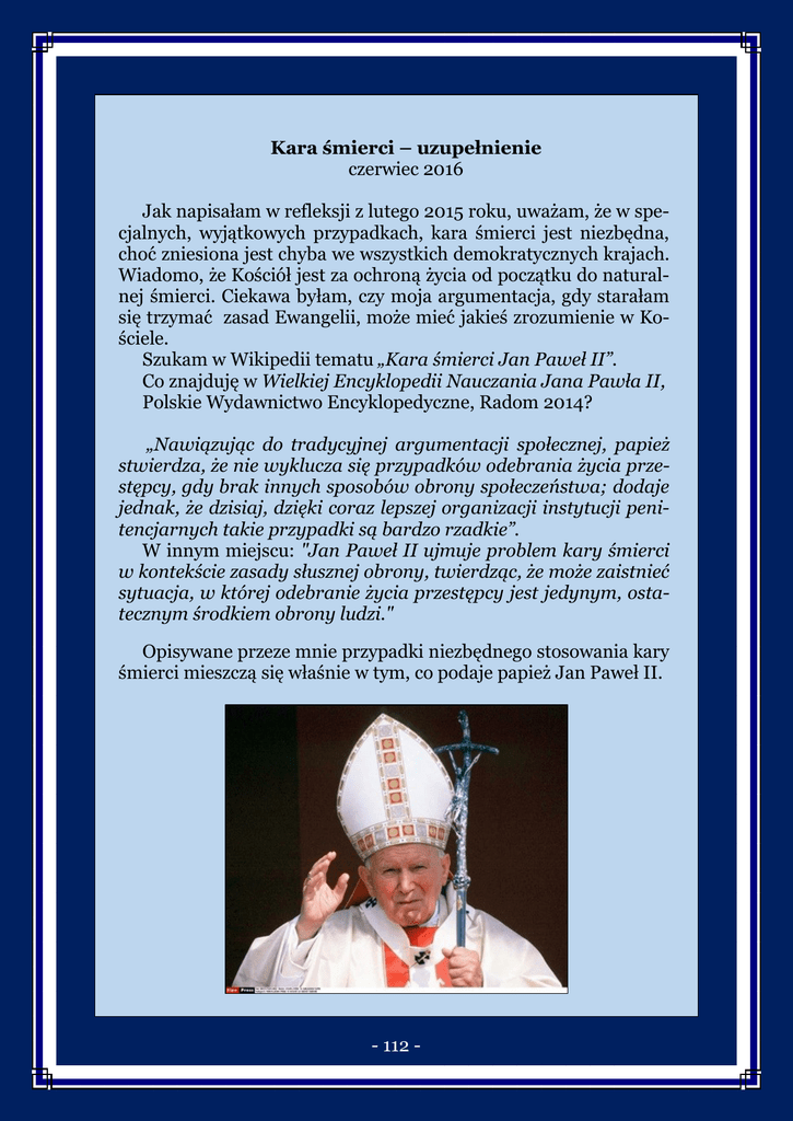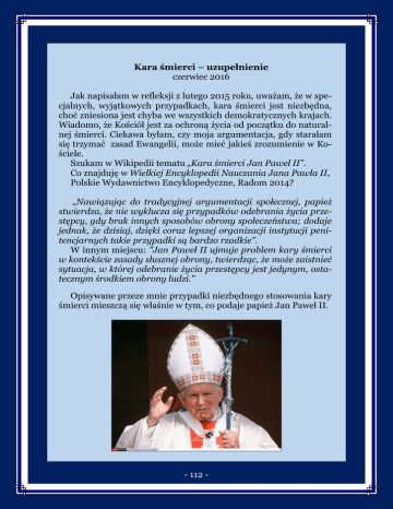 Kara śmierci – uzupełnienie czerwiec 2016 Jak napisałam w refleksji z lutego 2015 roku, uważam, że w specjalnych, wyjątkowych przypadkach, kara śmierci jest niezbędna, choć zniesiona jest chyba we wszystkich demokratycznych krajach. Wiadomo, że Kościół jest za ochroną życia od początku do naturalnej śmierci. Ciekawa byłam, czy moja argumentacja, gdy starałam się trzymać zasad Ewangelii, może mieć jakieś zrozumienie w Kościele. Szukam w Wikipedii tematu „Kara śmierci Jan Paweł II”. Co znajduję w Wielkiej Encyklopedii Nauczania Jana Pawła II, Polskie Wydawnictwo Encyklopedyczne, Radom 2014? „Nawiązując do tradycyjnej argumentacji społecznej, papież stwierdza, że nie wyklucza się przypadków odebrania życia przestępcy, gdy brak innych sposobów obrony społeczeństwa; dodaje jednak, że dzisiaj, dzięki coraz lepszej organizacji instytucji penitencjarnych takie przypadki są bardzo rzadkie”. W innym miejscu: "Jan Paweł II ujmuje problem kary śmierci w kontekście zasady słusznej obrony, twierdząc, że może zaistnieć sytuacja, w której odebranie życia przestępcy jest jedynym, ostatecznym środkiem obrony ludzi." Opisywane przeze mnie przypadki niezbędnego stosowania kary śmierci mieszczą się właśnie w tym, co podaje papież Jan Paweł II. - 112 -