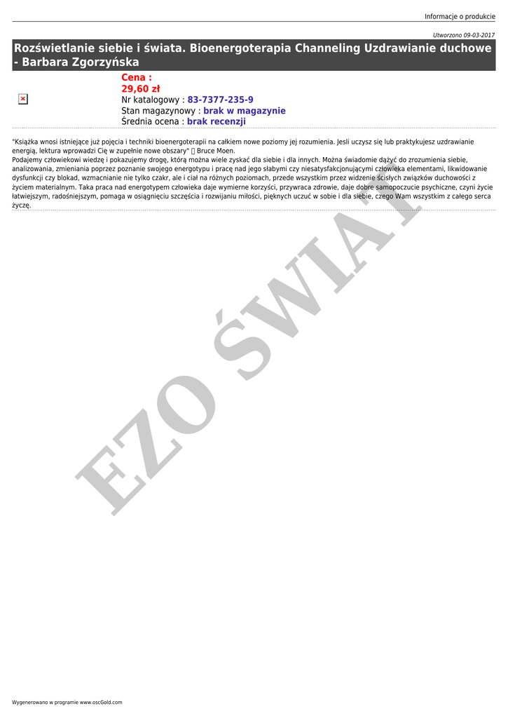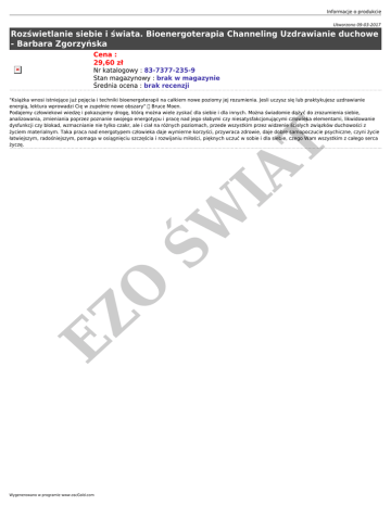 Informacje o produkcie Utworzono 09-03-2017 Rozświetlanie siebie i świata. Bioenergoterapia Channeling Uzdrawianie duchowe - Barbara Zgorzyńska Cena : 29,60 zł Nr katalogowy : 83-7377-235-9 Stan magazynowy : brak w magazynie Średnia ocena : brak recenzji EZ O ŚW IA T "Książka wnosi istniejące już pojęcia i techniki bioenergoterapii na całkiem nowe poziomy jej rozumienia. Jesli uczysz się lub praktykujesz uzdrawianie energią, lektura wprowadzi Cię w zupełnie nowe obszary" Bruce Moen. Podajemy człowiekowi wiedzę i pokazujemy drogę, którą można wiele zyskać dla siebie i dla innych. Można świadomie dążyć do zrozumienia siebie, analizowania, zmieniania poprzez poznanie swojego energotypu i pracę nad jego słabymi czy niesatysfakcjonującymi człowieka elementami, likwidowanie dysfunkcji czy blokad, wzmacnianie nie tylko czakr, ale i ciał na różnych poziomach, przede wszystkim przez widzenie ścisłych związków duchowości z życiem materialnym. Taka praca nad energotypem człowieka daje wymierne korzyści, przywraca zdrowie, daje dobre samopoczucie psychiczne, czyni życie łatwiejszym, radośniejszym, pomaga w osiągnięciu szczęścia i rozwijaniu miłości, pięknych uczuć w sobie i dla siebie, czego Wam wszystkim z całego serca życzę. Wygenerowano w programie www.oscGold.com