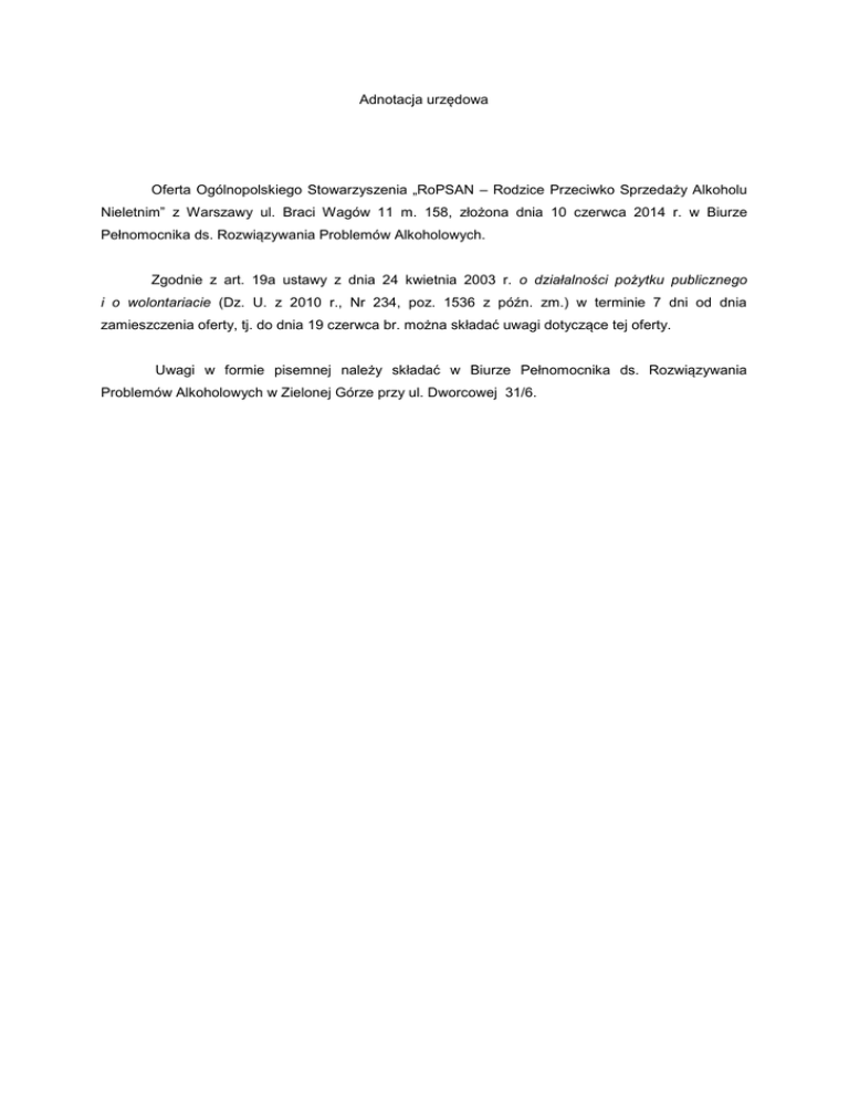 Adnotacja urzędowa Oferta Ogólnopolskiego Stowarzyszenia „RoPSAN – Rodzice Przeciwko Sprzedaży Alkoholu Nieletnim” z Warszawy ul. Braci Wagów 11 m. 158, złożona dnia 10 czerwca 2014 r. w Biurze Pełnomocnika ds. Rozwiązywania Problemów Alkoholowych. Zgodnie z art. 19a ustawy z dnia 24 kwietnia 2003 r. o działalności pożytku publicznego i o wolontariacie (Dz. U. z 2010 r., Nr 234, poz. 1536 z późn. zm.) w terminie 7 dni od dnia zamieszczenia oferty, tj. do dnia 19 czerwca br. można składać uwagi dotyczące tej oferty. Uwagi w formie pisemnej należy składać w Biurze Pełnomocnika ds. Rozwiązywania Problemów Alkoholowych w Zielonej Górze przy ul. Dworcowej 31/6.