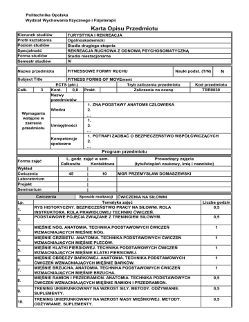 Politechnika Opolska Wydział Wychowania fizycznego i Fizjoterapii Karta Opisu Przedmiotu Kierunek studiów Profil kształcenia Poziom studiów Specjalność Forma studiów Semestr studiów TURYSTYKA I REKREACJA Ogólnoakademicki Studia drugiego stopnia REKREACJA RUCHOWA Z ODNOWĄ PSYCHOSOMATYCZNĄ Studia niestacjonarne IV Nazwa przedmiotu FITNESSOWE FORMY RUCHU Subject Title Całk. 3 Wymagania wstępne w zakresie przedmiotu Nauki podst. (T/N) N FITNESS FORMS OF MOVEment ECTS (pkt.) Tryb zaliczenia przedmiotu Kod przedmiotu Kont. 0,8 Prakt. Zaliczenie na ocenę TRR0030 Nazwy przedmiotów 1. ZNA PODSTAWY ANATOMII CZŁOWIEKA Wiedza 2. … 1. Umiejętności 2. … 1. POTRAFI ZADBAĆ O BEZPIECZEŃSTWO WSPÓŁĆWICZĄCYCH Kompetencje 2. społeczne … Program przedmiotu Forma zajęć Wykład Ćwiczenia Laboratorium Projekt Seminarium L. godz. zajęć w sem. Prowadzący zajęcia Całkowita Kontaktowa (tytuł/stopień naukowy, imię i nazwisko) | 45 10 MGR PRZEMYSŁAW DOMASZEWSKI | | | | Ćwiczenia Lp. 1. 2. 3. 4. 5. 6. 7. 8. Sposób realizacji ĆWICZENIA NA SIŁOWNI Tematyka zajęć RYS HISTORYCZNY. BEZPIECZEŃSTWO PRACY NA SIŁOWNI. ROLA INSTRUKTORA. ROLA PRAWIDŁOWEJ TECHNIKI ĆWICZEŃ. PODSTAWOWE POJĘCIA ZWIĄZANE Z TRENINGIEM SIŁOWYM. MIĘŚNIE NÓG. ANATOMIA. TECHNIKA PODSTAWOWYCH ĆWICZEŃ WZMACNIAJĄCYCH MIĘŚNIE NÓG. MIĘŚNIE GRZBIETU. ANATOMIA. TECHNIKA PODSTAWOWYCH ĆWICZEŃ WZMACNIAJĄCYCH MIĘŚNIE PLECÓW. MIĘŚNIE KLATKI PIERSIOWEJ. TECHNIKA PODSTAWOWYCH ĆWICZEŃ WZMACNIAJĄCYCH MIĘŚNIE KLATKI PIERSIOWEJ. MIĘŚNIE OBRĘCZY BARKOWEJ. ANATOMIA. TECHNIKA PODSTAWOWYCH ĆWICZEŃ WZMACNIAJĄCYCH MIĘŚNIE BARKÓW. MIĘŚNIE BRZUCHA. ANATOMIA. TECHNIKA PODSTAWOWYCH ĆWICZEŃ WZMACNIAJĄCYCH MIĘŚNIE BRZUCHA. MIĘŚNIE RAMION I PRZEDRAMION. ANATOMIA. TECHNIKA PODSTAWOWYCH ĆWICZEŃ WZMACNIAJĄCYCH MIĘŚNIE RAMION I PRZEDRAMION. Liczba godzin 0,5 0,5 1 1 1 1 1 0,5 9. TRENING UKIERUNKOWANY NA WZROST SIŁY. METODY. ODŻYWIANIE. SUPLEMENTY. 0,5 10. TRENING UKIERUNKOWANY NA WZROST MASY MIĘŚNIOWEJ. METODY. ODŻYWIANIE. SUPLEMENTY. 0,5 11. 12. 13. 14. 15. TRENING UKIERUNKOWANY NA WZROST WYTRZYMAŁOŚCI. METODY. ODŻYWIANIE. SUPLEMENTY. TRENING UKIERUNKOWANY NA WZROST POPRAWĘ RZEŻBY MIĘŚNI. METODY. ODŻYWIANIE. SUPLEMENTY. PRACA W PARACH. PRZYGOTOWANIE TRENINGU, WYTYCZNYCH ŻYWIENIOWYCH ORAZ SUPLEMENTÓW DIETY DLA PARTNERA Z UWZGLĘDNIENIEM PRZEBYTYCH URAZÓW, TYPU BUDOWY ORAZ ZAMIERZONYCH CELÓW TRENINGOWYCH. TEORETYCZNY SPRAWDZIAN WIEDZY Z ZAKRESU TRENINGU SIŁOWEGO. PRAKTYCZNY SPRAWDZIAN WIEDZY Z ZAKRESU FITNESSOWYCH FORM RUCHU. 0,5 0,5 0,5 0,5 0,5 L. godz. pracy własnej studenta 35 L. godz. kontaktowych w sem. 10 SPRAWDZIAN WIEDZY TEORETYCZNY - KOLOKWIUM, OCENA Sposoby sprawdzenia zamierzonych POPRAWNOŚCI PRZYGOTOWANYCH TRENINGÓW ORAZ efektów kształcenia SPRAWDZIAN PRAKTYCZNY. DEMONSTRUJE TECHNIKĘ PODSTAWOWYCH ĆWICZEŃ 1. STOSOWANYCH W TRENINGU NA SIŁOWNI( K_W05). Wiedza 2. UKŁADA CELOWY TRENING SIŁOWY(K_W05). 3. … KONSTRUUJE PRAWIDŁOWY, CELOWY PLAN TRENINGOWY 1. (K_U08). Efekty kształcenia dla OPISUJE ĆWICZENIA WZACNIAJĄCE UKŁAD WIĘZADŁOWOprzedmiotu - po 2. Umiejętności STAWOWO-MIĘŚNIOWY (K_U05). zakończonym cyklu 3. kształcenia … 1. POMAGA PODCZAS TRUDNYCH ĆWICZEŃ (K_K01). WYJAŚNIA PROZDROWOTNE WŁAŚCIWOŚCI TRENINGU Kompetencje 2. SIŁOWEGO (K_K01). społeczne 3. … Metody dydaktyczne: POGADANKA, POKAZ, KRYTYCZNA ANALIZA, PREZENTACJA. Forma i warunki zaliczenia przedmiotu: OTRZYMANIE POZYTWNEJ OCENY ZE SPRAWDZIANU WIEDZY TEORETYCZNEJ I PRAKTYCZNEJ. Literatura podstawowa: [1] A. Everett. Trening siłowy. Wyd. JK. Łódź. 2009. [2] U. Edgar. Trening siłowy. Wyd. Marszałek- PPUH. Wrocław 2002. ______________ * niewłaściwe przekreślić ………………………………………………….. ………………………………………………………. (kierownik jednostki organizacyjnej/bezpośredni przełożony: pieczęć/podpis (Dziekan Wydziału pieczęć/podpis)