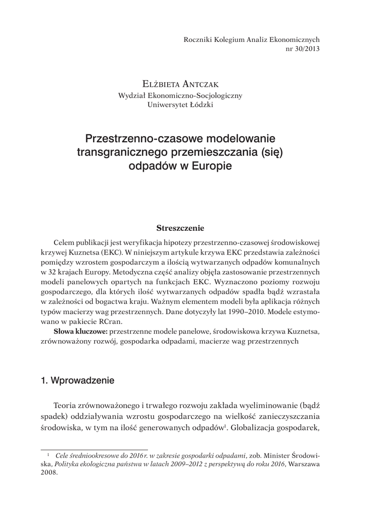 Roczniki Kolegium Analiz Ekonomicznych nr 30/2013 Elżbieta Antczak Wydział Ekonomiczno-Socjologiczny Uniwersytet Łódzki Przestrzenno-czasowe modelowanie transgranicznego przemieszczania (się) odpadów w Europie Streszczenie Celem publikacji jest weryfikacja hipotezy przestrzenno-czasowej środowiskowej krzywej Kuznetsa (EKC). W niniejszym artykule krzywa EKC przedstawia zależności pomiędzy wzrostem gospodarczym a ilością wytwarzanych odpadów komunalnych w 32 krajach Europy. Metodyczna część analizy objęła zastosowanie przestrzennych modeli panelowych opartych na funkcjach EKC. Wyznaczono poziomy rozwoju gospodarczego, dla których ilość wytwarzanych odpadów spadła bądź wzrastała w zależności od bogactwa kraju. Ważnym elementem modeli była aplikacja różnych typów macierzy wag przestrzennych. Dane dotyczyły lat 1990–2010. Modele estymowano w pakiecie RCran. Słowa kluczowe: przestrzenne modele panelowe, środowiskowa krzywa Kuznetsa, zrównoważony rozwój, gospodarka odpadami, macierze wag przestrzennych 1. Wprowadzenie Teoria zrównoważonego i trwałego rozwoju zakłada wyeliminowanie (bądź spadek) oddziaływania wzrostu gospodarczego na wielkość zanieczyszczania środowiska, w tym na ilość generowanych odpadów1. Globalizacja gospodarek, 1 Cele średniookresowe do 2016 r. w zakresie gospodarki odpadami, zob. Minister Środowiska, Polityka ekologiczna państwa w latach 2009–2012 z perspektywą do roku 2016, Warszawa 2008. 10 Elżbieta Antczak podnoszenie materialnej jakości życia, rosnąca produkcja dóbr konsumpcyjnych oraz dynamizacja postępu technologicznego powodują coraz krótszą „żywotność” produktów powszechnego użytku, a tym samym przyczyniają się do nadprodukcji odpadów2. Dlatego też realizowanie założeń zrównoważonego rozwoju do lokalnych i globalnych polityk regionów3 stało się zarówno obowiązkiem (wynikającym z prawa europejskiego, międzynarodowego)4, jak i koniecznością. Obecnie, obok problemu globalnej degradacji powietrza, poważnym zagrożeniem stała się produkcja i międzyregionalne przemieszczanie (się) odpadów5. W przeciwieństwie do ochrony atmosfery przed zanieczyszczeniem, postępy w racjonalizacji gospodarki odpadami są bardzo powolne. Nie został skonstruowany dotąd skuteczny mechanizm segregacji i odzysku odpadów oraz obrotu nimi6, w wyniku tego większość z nich trafia na składowiska bądź zostaje wyeksportowana do krajów wyposażonych w technologie służące do ich recyklingu. Transgraniczne przemieszczanie (się) odpadów oznacza ich eksport, import, tranzyt7 oraz występowanie interakcji (autokorelacji) przestrzennych w kształtowaniu się ich ilości. Z kolei autokorelacja przestrzenna w przypadku prezentowanego zjawiska to sytuacja, w której wielkość odpadów wytwarzanych w danym regionie ma wpływ na poziom tego zjawiska w regionach sąsiednich. Monitoring zmian poziomu generowanych odpadów w zależności od bogactwa regionu jest jednym z założeń idei zrównoważonego rozwoju. Natomiast kwantyfikacja i uchwycenie ekonomiczno-ekologiczno-przestrzennych relacji są możliwe m.in. poprzez zastosowanie odpowiednich metod pomiaru, np. przestrzennych modeli panelowych opartych na założeniach środowiskowej krzywej Kuznetsa (Environmental Kuznets Curve – EKC). Celem niniejszej publikacji jest weryfikacja hipotezy przestrzenno-czasowej EKC, w której krzywa ta przedstawia zależności pomiędzy poziomem 2 R. Holger, Ekonomia zrównoważonego rozwoju. Teoria i praktyka, Zysk, Poznań 2010, s. 501–511. 3 W niniejszym opracowaniu przez termin „region” rozumie się jednostkę administracyjną (kraj, województwo, powiat itd.), tj. jednostkę zlokalizowaną w przestrzeni geograficznej. 4 Rada UE, Odnowiona strategia UE dotycząca trwałego rozwoju, Bruksela 2006. 5 EEA, Movements of waste across the EU’s internal and external borders, Copenhagen 2012, s. 5. 6 Rozporządzenie WE nr 1013/2006 Parlamentu Europejskiego i Rady z 14.06.2006 r. w sprawie przemieszczania odpadów. W Polsce ustawa z 30.06.2007 r. o międzynarodowym przemieszczaniu odpadów unormowała kwestie pozostające do rozstrzygnięcia państwom członkowskim. 7 Konwencja Bazylejska, z 22.03.1989 r., ratyfikowana przez Polskę 10.01.1992 r.; Główny Inspektorat Ochrony Środowiska, Transgraniczne przemieszczanie odpadów – nadzór i kontrola Inspekcji Ochrony Środowiska, „Aura” 2012, nr 9, s. 19–22. Przestrzenno-czasowe modelowanie transgranicznego przemieszczania (się) odpadów w Europie 11 rozwoju gospodarczego (PKB per capita) a stanem środowiska przyrodniczego (tu: ilością wytwarzanych odpadów komunalnych) w latach 1990–2010 w wybranych krajach Europy: Austria (AT), Belgia (BE), Bułgaria (BG), Szwajcaria (CH), Cypr (CY), Czechy (CZ), Niemcy (DE), Dania (DK), Estonia (EE), Hiszpania (ES), Finlandia (FI), Francja (FR), Wielka Brytania (GB), Grecja (GR), Chorwacja (HR), Węgry (HU), Irlandia (IE), Włochy (IT), Litwa (LV), Lichtenstein (LI), Łotwa (LT), Luksemburg (LU), Malta (MT), Holandia (NL), Norwegia (NO), Polska (PL), Portugalia (PT), Rumunia (RO), Szwecja (SE), Słowenia (SI), Słowacja (SK), Turcja (TR). Realizacja celu badań wymagała sformułowania pytań badawczych dotyczących: 1) skali i algorytmu oddziaływania rozwoju gospodarczego na ilość generowanych odpadów, 2) możliwości wyznaczenia poziomów rozwoju gospodarczego poszczególnych krajów, w których ilość wytwarzanych odpadów spadała bądź wzrastała w zależności od bogactwa regionu, oraz 3) wpływu aplikacji różnych typów macierzy wag przestrzennych na wartości otrzymanych wyników. Jak dotychczas nie przeprowadzono w Polsce przestrzenno-czasowych analiz dotyczących ponadgranicznych zależności pomiędzy rozwojem gospodarczym a ilością wytwarzanych odpadów. 2. Charakterystyka zmiennych i metodyka badań Głównym założeniem prowadzonej analizy jest weryfikacja występowania zależności 