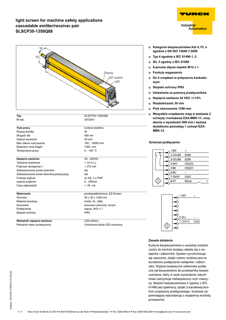light screen for machine safety applications cascadable emitter/receiver pair SLSCP30-1350Q88 ■ ■ Typ 4 zgodnie z IEC 61496-1,-2 ■ SIL 3 zgodny z IEC 61508 ■ 8-pinowe złącze męskie M12 x 1 ■ Funkcja wygaszenia ■ Typ Nr kat. SLSCP30-1350Q88 3072451 Tryb pracy Rodzaj światła Długość fali Optical resolution Max zakres wykrywania Detection zone height Temperatura pracy kurtyna świetlna IR 950 nm 30 mm 100…18000 mm 1350 mm 0…+50 °C Napięcie zasilania Tętnienie resztkowe Prąd bez obciążenia I0 Zabezpieczenie przed zwarciem Zabezpieczenie przed odwrotną polaryzacją Funkcja wyjścia wyjście prądowe Czas odpowiedzi 20…28VDC < 10 % Uss ð 275 mA tak tak 2x NZ, 2 x PNP 0…500mA < 25 ms Wykonanie Wymiary Materiał obudowy Soczewka Podłączenie Stopień ochrony prostopadłościenna, EZ-Screen 45 x 36 x 1420 mm metal, AL, żółta tworzywo sztuczne, acrylic złącze, M12 x 1 IP65 Wskaźnik napięcia zasilania Wskaźnik stanu przełączenia LED zielony 2-kolorowa dioda LED czerwony Kategoria bezpieczeństwa Kat 4, PL e zgodnie z EN ISO 13849-1:2008 Do 4 urządzeń w połączeniu kaskadowym ■ Stopień ochrony IP65 ■ Ustawianie za pomocą przełączników ■ Napięcie zasilania 24 VDC +/-15% ■ Rozdzielczość 30 mm ■ Pole skanowania 1350 mm ■ Wszystkie urządzenia mają w zestawie 2 uchwyty montażowe EZA-MBK-11; urządzenia o wysokości 900 mm i wyższe dodatkowo posiadają 1 uchwyt EZAMBK-12 Schemat podłączenia Zasada działania Edition • 2014-04-17T09:51:41+02:00 Kurtyna bezpieczeństwa o wysokiej rozdzielczości do kontroli dostępu składa się z nadajnika i odbiornika. System synchronizuje się optycznie, dzięki czemu możliwe jest redundantne podłączenie nadajnika i odbiornika. Wyjścia bezpieczne odbiornika podłącza się bezpośrednio do przekaźnika bezpieczeństwa, który w razie wyzwolenia natychmiast zatrzymuje niebezpieczny ruch maszyny. Stopień bezpieczeństwa 4 zgodny z IEC 61496 jest spełniony, dzięki 2-kanałowej kontroli urządzenia przełączanego i budowie zapewniającej redundancję z wzajemną kontrolą procesorów. 1/4 Hans Turck GmbH & Co.KG ñ D-45472 Mülheim an der Ruhr ñ Witzlebenstraße 7 ñ Tel. 0208 4952-0 ñ Fax 0208 4952-264 ñ [email protected] ñ www.turck.com light screen for machine safety applications cascadable emitter/receiver pair SLSCP30-1350Q88 Akcesoria montażowe Typ Nr kat. EZA-MBK-21 3073319 EZA-MBK-11 3071470 Rysunek wymiarowy Element montażowy, czarny, stalowy dla kurtyn EZ-ARRAY i EZ-SCREEN (standardowych 14 i 30 mm). Element montażowy, czarny, stalowy dla kurtyn EZ-ARRAY i EZ-SCREEN (standardowych i kaskadowych 14 i 30 mm). EZA-MBK-12 3071756 Element montażowy, czarny, stalowy dla kurtyn EZ-ARRAY i EZ-SCREEN (standardowych i kaskadowych 14 i 30 mm). EZA-MBK-20 3072587 Element montażowy, czarny, stalowy dla kurtyn EZ-ARRAY i EZ-SCREEN (standardowych 14 i 30 mm). Akcesoria - okablowanie Typ Nr kat. QDE-815D 3070883 Rysunek wymiarowy Przewód podłączeniowy, PVC, żółty, długość: 4,57 m, złącze żeńskie M12 x 1, 8-pinowe QDE-825D 3070884 Przewód podłączeniowy, PVC, żółty, długość: 7,62 m, złącze Edition • 2014-04-17T09:51:41+02:00 żeńskie M12 x 1, 8-pinowe 2/4 Hans Turck GmbH & Co.KG ñ D-45472 Mülheim an der Ruhr ñ Witzlebenstraße 7 ñ Tel. 0208 4952-0 ñ Fax 0208 4952-264 ñ [email protected] ñ www.turck.com light screen for machine safety applications cascadable emitter/receiver pair SLSCP30-1350Q88 Akcesoria - okablowanie Typ Nr kat. QDE-850D 3070885 Rysunek wymiarowy Przewód podłączeniowy, PVC, żółty, długość: 15,3 m, złącze żeńskie M12 x 1, 8-pinowe QDE-875D 3071466 Przewód podłączeniowy, PVC, żółty, długość: 22,9 m, złącze żeńskie M12 x 1, 8-pinowe QDE-8100D 3071467 Przewód podłączeniowy, PVC, żółty, długość: 30,5 m, złącze żeńskie M12 x 1, 8-pinowe DEE2R-81D 3072205 DEE2R-83D 3072206 DEE2R-88D 3072635 DEE2R-815D 3072207 DEE2R-825D 3072208 DEE2R-850D 3072209 DEE2R-875D 3072210 DEE2R-8100D 3072211 CSB-M1280M1280 3075375 Przewód podłączeniowy, PVC, żółty, długość: 0,31 m, złącze żeńskie M12 x 1 - złącze męskie M12 x 1, 8-pinowe Przewód podłączeniowy, PVC, żółty, długość: 0,91 m, złącze żeńskie M12 x 1 - złącze męskie M12 x 1, 8-pinowe Przewód podłączeniowy, PVC, żółty, długość: 2,44 m, złącze żeńskie M12 x 1 - złącze męskie M12 x 1, 8-pinowe Przewód podłączeniowy, PVC, żółty, długość: 4,57 m, złącze żeńskie M12 x 1 - złącze męskie M12 x 1, 8-pinowe Przewód podłączeniowy, PVC, żółty, długość: 7,62 m, złącze żeńskie M12 x 1 - złącze męskie M12 x 1, 8-pinowe Przewód podłączeniowy, PVC, żółty, długość: 15,2 m, złącze żeńskie M12 x 1 - złącze męskie M12 x 1, 8-pinowe Przewód podłączeniowy, PVC, żółty, długość: 22,9 m, złącze żeńskie M12 x 1 - złącze męskie M12 x 1, 8-pinowe Przewód podłączeniowy, PVC, żółty, długość: 30,5 m, złącze żeńskie M12 x 1 - złącze męskie M12 x 1, 8-pinowe Trójnik, PVC, żółty, ze złączem męskim, M12 x 1, 8-pinów na 2 x przewód 0,3 m, PVC, żółty, ze złączami żeńskimi, M12 x 1, 8-pinów Edition • 2014-04-17T09:51:41+02:00 CSB-M1281M1281 3073252 Trójnik typu Y, PVC, żółty, długość: 0,3 m ze złączem męskim, M12 x 1, 8-pinów na 2 x przewód 0,3 m, PVC, żółty, ze złączami żeńskimi, M12 x 1, 8-pinów CSB-M1288M1281 3073253 Trójnik typu Y, PVC, żółty, długość: 2,5 m ze złączem męskim, M12 x 1, 8-pinów na 2 x przewód 0,3 m, PVC, żółty, ze złączami żeńskimi, M12 x 1, 8-pinów CSB-M12815M1281 3073254 Trójnik typu Y, PVC, żółty, długość: 4,6 m ze złączem męskim, M12 x 1, 8-pinów na 2 x przewód 0,3 m, PVC, żółty, ze złączami żeńskimi, M12 x 1, 8-pinów 3/4 Hans Turck GmbH & Co.KG ñ D-45472 Mülheim an der Ruhr ñ Witzlebenstraße 7 ñ Tel. 0208 4952-0 ñ Fax 0208 4952-264 ñ [email protected] ñ www.turck.com light