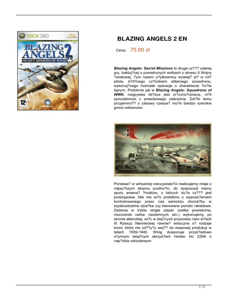 BLAZING ANGELS 2 EN Cena: 75.00 zł Blazing Angels: Secret Missions to druga cz??? udanej gry, traktuj?cej o powietrznych walkach z okresu II Wojny ?wiatowej. Tym razem u?ytkownicy wcielaj? si? w rol? pilota, b?d?cego cz?onkiem elitarnego szwadronu, wykonuj?cego rozmaite operacje o charakterze ?ci?le tajnym. Podobnie jak w Blazing Angels: Squadrons of WWII, rozgrywka bli?sza jest zr?czno?ciówce, ni?li symulatorowi z prawdziwego zdarzenia. Dzi?ki temu przyjemno?? z zabawy czerpa? mo?e bardzo szerokie grono odbiorców. Poniewa? w wirtualnej rzeczywisto?ci realizujemy misje o najwy?szym stopniu poufno?ci, do dyspozycji mamy spory arsena? ?rodków, z których du?a cz??? jest prototypowa. Nie ma wi?c problemu z wyposa?eniem kontrolowanego przez nas samolotu chocia?by w szybkostrzelne dzia?ka czy kierowane pociski rakietowe. Zadania w trybie single player (walka powietrzna, niszczenie celów naziemnych etc.) wykonujemy po stronie alianckiej, wi?c w staj?cych przeciwko nam si?ach III Rzeszy Niemieckiej równie? widoczne s? rodzaje broni, które nie zd??y?y wej?? do masowej produkcji w latach 1939-1945. Wróg dysponuje przyk?adowo s?ynnym lataj?cym skrzyd?em Horten Ho 229A o nap?dzie odrzutowym. 1/2 Developerzy z korporacji Ubisoft Entertainment zaimplementowali szereg interesuj?cych lokacji, gdzie przychodzi nam prowadzi? podniebne operacje militarne. Latamy wi?c m.in. nad spalonym s?onecznymi promieniami Kairem, po?ród himalajskich szczytów i w rejonie Moskwy. Ka?de wirtualne ?rodowisko posiada mnóstwo drobnych detali, czyli np. naturalnie wygl?daj?ce chmury, g?sty drzewostan i rz?sisty deszcz. Nie zapomniano nawet o wprowadzeniu zró?nicowanej g?sto?ci powietrza, wp?ywaj?cej rzecz jasna na zachowanie samolotów. Ca?o?ci dope?nia opcja multiplayer, oferuj?ca sporo ciekawych scenariuszy (dru?ynowe zdobywanie terytorium, epickie pojedynki asów przestworzy itp.). Zobacz wideo: Szczegóły wersja językowa ANGIELSKA 2/2 Powered by TCPDF (www.tcpdf.org)