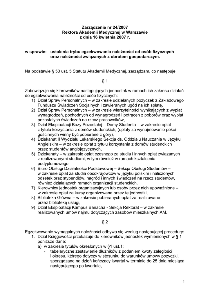 Zarządzenie nr 24/2007 Rektora Akademii Medycznej w Warszawie z dnia 16 kwietnia 2007 r. w sprawie: ustalenia trybu egzekwowania należności od osób fizycznych oraz należności związanych z obrotem gospodarczym. Na podstawie § 50 ust. 5 Statutu Akademii Medycznej, zarządzam, co następuje: §1 Zobowiązuje się kierowników następujących jednostek w ramach ich zakresu działań do egzekwowania należności od osób fizycznych: 1) Dział Spraw Personalnych – w zakresie udzielanych pożyczek z Zakładowego Funduszu Świadczeń Socjalnych i zawieranych ugód na ich spłatę, 2) Dział Spraw Personalnych – w zakresie wierzytelności wynikających z wypłat wynagrodzeń, pochodnych od wynagrodzeń i potrąceń z poborów oraz wypłat pozostałych świadczeń na rzecz pracowników, 3) Dział Eksploatacji Bazy Pozostałej – Domy Studenta – w zakresie opłat z tytułu korzystania z domów studenckich, (opłaty za wynajmowanie pokoi gościnnych winny być pobierane z góry), 4) Dziekanat II Wydziału Lekarskiego Sekcja ds. Oddziału Nauczania w Języku Angielskim – w zakresie opłat z tytułu korzystania z domów studenckich przez studentów anglojęzycznych, 5) Dziekanaty – w zakresie opłat czesnego za studia i innych opłat związanych z realizowanymi studiami, w tym również w ramach kształcenia podyplomowego, 6) Biuro Obsługi Działalności Podstawowej – Sekcja Obsługi Studentów – w zakresie opłat za studia obcokrajowców w języku polskim i naliczonych odsetek oraz stypendiów, nagród i innych świadczeń na rzecz studentów, również działających ramach organizacji studenckich. 7) Kierownicy jednostek organizacyjnych lub osoby przez nich upoważnione – w zakresie opłat za kursy organizowane przez te jednostki, 8) Biblioteka Główna – w zakresie pobieranych opłat za realizowane przez bibliotekę usługi, 9) Dział Eksploatacji Kampus Banacha - Sekcja Rektorat – w zakresie realizowanych umów najmu dotyczących zasobów mieszkalnych AM. §2 Egzekwowanie wymagalnych należności odbywa się według następującej procedury: 1. Dział Księgowości przekazuje do kierowników jednostek wymienionych w § 1 poniższe dane: a) w zakresie tytułów określonych w §1 ust.1: - tabelaryczne zestawienie dłużników z podaniem kwoty zaległości i okresu, którego dotyczy w stosunku do warunków umowy pożyczki, sporządzane na dzień kończący kwartał w terminie do 25 dnia miesiąca następującego po kwartale, 1 informacje o dokonanych w danym miesiącu wpłatach dotyczących zawartych ugód, sporządzane w terminie do 15 dnia następnego miesiąca, b) w zakresie tytułów określonych w §1 ust.2: - informacje o stwierdzonych w danym miesiącu niezgodnościach na koncie „Rozrachunki z pracownikami z tytułu wynagrodzeń” i pozostałych świadczeń, sporządzane w terminie do 25 dnia następnego miesiąca, - informacje o wniesionych przez pracowników i byłych pracowników wpłatach w przypadku dłużników wskazanych przez Sekcję Płac, sporządzane w terminie do 25 dnia następnego miesiąca, c) w zakresie tytułów określonych w §1 ust.3: - imienny wykaz dłużników z podaniem kwoty zaległości w formie wydruku komputerowego z ksiąg AM, sporządzony na dzień kończący miesiąc w terminie do 15 dnia następnego miesiąca, d) w zakresie tytułów określonych w §1 ust.4: - tabelaryczne zestawienie dłużników z podaniem kwoty należności w walucie obcej oraz okresu, którego dotyczy, sporządzane co 2 miesiące w terminie do 25 dnia następnego miesiąca (np. za miesiące IX i X do 25.XI), e) w zakresie tytułów określonych w §1 ust.5: - imienny wykaz dłużników z podaniem kwoty zaległości w formie wydruku komputerowego z ksiąg AM, sporządzony na dzień kończący miesiąc w terminie do 25 dnia następnego miesiąca , f) w zakresie tytułów określonych w §1 ust.6: - kserokopie wniesionych opłat za studia studentów obcokrajowców, studiujących w języku polskim, przekazywane po zakończeniu miesiąca w terminie do 15 dnia następnego miesiąca, - informacje o stwierdzonych w danym miesiącu niezgodnościach na koncie „Rozrachunki ze studentami” z tytułu wypłaconych stypendiów, nagród i innych świadczeń, sporządzane w terminie do 25 dnia następnego miesiąca, g) w zakresie tytułów określonych w §1 ust.7: - imienny wykaz dłużników z podaniem kwoty zaległości w formie wydruku komputerowego z ksiąg AM, sporządzony dla każdego kursu na dzień kończący miesiąc, w terminie do 15 dnia następnego miesiąca, h) w zakresie tytułów określonych w §1 ust.8: - imienny wykaz dłużników z podaniem kwoty zaległości w formie wydruku komputerowego z ksiąg AM, sporządzony na dzień kończący miesiąc w terminie do 15 dnia następnego miesiąca, i) w zakresie tytułów określonych w §1 ust.9: - imienny wykaz dłużników z podaniem kwoty należności w formie wydruku komputerowego, sporządzony na dzień kończący miesiąc do 25 dnia następnego miesiąca, 2. W ciągu 7 dni od otrzymania z Działu Księgowości informacji określonych w ust. 1, jednostki wymienione w § 1, wysyłają listem poleconym wezwania do zapłaty do osób zalegających z płatnościami, z podaniem 7-dniowego terminu płatności licząc od dnia jego otrzymania. - 2 W przydatku gdy należność nie przekracza kosztów pocztowych następuje odstąpienie od wezwania. 3. Po bezskutecznym pierwszym wezwaniu jednostki wymienione w § 1 wysyłają powtórne wezwanie do zapłaty według zasad określonych w ust.2. W przypadku zalegania ze spłatą pożyczek z ZFŚS kopię wezwania do zapłaty wysyłają również do wiadomości poręczycieli. 4. Bezskuteczne wezwanie do zapłaty kwot nie przekraczających 2-krotności kosztów przesyłki poleconej lub odstąpienie od wezwania zgodnie z ust. 2 kończy procedurę wezwań. Jednostka zobowiązana jest wówczas do wystąpienia o odstąpienie od egzekucji należności do Kanclerza i po uzyskani