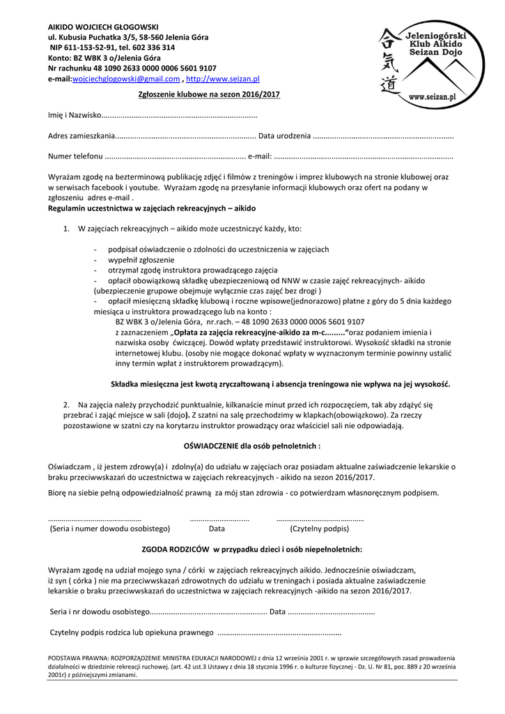 AIKIDO WOJCIECH GŁOGOWSKI ul. Kubusia Puchatka 3/5, 58-560 Jelenia Góra NIP 611-153-52-91, tel. 602 336 314 Konto: BZ WBK 3 o/Jelenia Góra Nr rachunku 48 1090 2633 0000 0006 5601 9107 e-mail:[email protected] , http://www.seizan.pl Zgłoszenie klubowe na sezon 2016/2017 Imię i Nazwisko......................................................................... Adres zamieszkania.................................................................. Data urodzenia .................................................................. Numer telefonu .................................................................. e-mail: .................................................................................... Wyrażam zgodę na bezterminową publikację zdjęć i filmów z treningów i imprez klubowych na stronie klubowej oraz w serwisach facebook i youtube. Wyrażam zgodę na przesyłanie informacji klubowych oraz ofert na podany w zgłoszeniu adres e-mail . Regulamin uczestnictwa w zajęciach rekreacyjnych – aikido 1. W zajęciach rekreacyjnych – aikido może uczestniczyć każdy, kto: - podpisał oświadczenie o zdolności do uczestniczenia w zajęciach - wypełnił zgłoszenie - otrzymał zgodę instruktora prowadzącego zajęcia - opłacił obowiązkową składkę ubezpieczeniową od NNW w czasie zajęć rekreacyjnych- aikido (ubezpieczenie grupowe obejmuje wyłącznie czas zajęć bez drogi ) - opłacił miesięczną składkę klubową i roczne wpisowe(jednorazowo) płatne z góry do 5 dnia każdego miesiąca u instruktora prowadzącego lub na konto : BZ WBK 3 o/Jelenia Góra, nr.rach. – 48 1090 2633 0000 0006 5601 9107 z zaznaczeniem „Opłata za zajęcia rekreacyjne-aikido za m-c.........“oraz podaniem imienia i nazwiska osoby ćwiczącej. Dowód wpłaty przedstawić instruktorowi. Wysokość składki na stronie internetowej klubu. (osoby nie mogące dokonać wpłaty w wyznaczonym terminie powinny ustalić inny termin wpłat z instruktorem prowadzącym). Składka miesięczna jest kwotą zryczałtowaną i absencja treningowa nie wpływa na jej wysokość. 2. Na zajęcia należy przychodzić punktualnie, kilkanaście minut przed ich rozpoczęciem, tak aby zdążyć się przebrać i zająć miejsce w sali (dojo). Z szatni na salę przechodzimy w klapkach(obowiązkowo). Za rzeczy pozostawione w szatni czy na korytarzu instruktor prowadzący oraz właściciel sali nie odpowiadają. OŚWIADCZENIE dla osób pełnoletnich : Oświadczam , iż jestem zdrowy(a) i zdolny(a) do udziału w zajęciach oraz posiadam aktualne zaświadczenie lekarskie o braku przeciwwskazań do uczestnictwa w zajęciach rekreacyjnych - aikido na sezon 2016/2017. Biorę na siebie pełną odpowiedzialność prawną za mój stan zdrowia - co potwierdzam własnoręcznym podpisem. ………………………………………… (Seria i numer dowodu osobistego) ............................ Data ……………………………………… (Czytelny podpis) ZGODA RODZICÓW w przypadku dzieci i osób niepełnoletnich: Wyrażam zgodę na udział mojego syna / córki w zajęciach rekreacyjnych aikido. Jednocześnie oświadczam, iż syn ( córka ) nie ma przeciwwskazań zdrowotnych do udziału w treningach i posiada aktualne zaświadczenie lekarskie o braku przeciwwskazań do uczestnictwa w zajęciach rekreacyjnych -aikido na sezon 2016/2017. Seria i nr dowodu osobistego....................................................... Data ......................................... Czytelny podpis rodzica lub opiekuna prawnego .......................................................... PODSTAWA PRAWNA: ROZPORZĄDZENIE MINISTRA EDUKACJI NARODOWEJ z dnia 12 września 2001 r. w sprawie szczegółowych zasad prowadzenia działalności w dziedzinie rekreacji ruchowej. (art. 42 ust.3 Ustawy z dnia 18 stycznia 1996 r. o kulturze fizycznej - Dz. U. Nr 81, poz. 889 z 20 września 2001r) z późniejszymi zmianami.