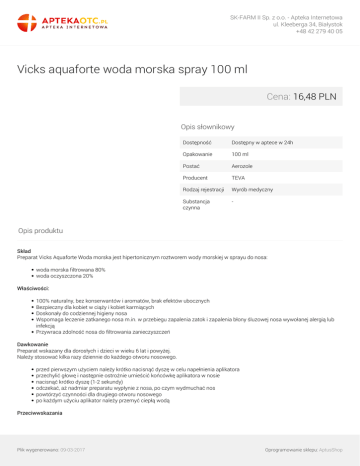 SK-FARM II Sp. z o.o. - Apteka Internetowa ul. Kleeberga 34, Białystok +48 42 279 40 05 Vicks aquaforte woda morska spray 100 ml Cena: 16,48 PLN Opis słownikowy Dostępność Dostępny w aptece w 24h Opakowanie 100 ml Postać Aerozole Producent TEVA Rodzaj rejestracji Wyrób medyczny Substancja czynna - Opis produktu Skład Preparat Vicks Aquaforte Woda morska jest hipertonicznym roztworem wody morskiej w sprayu do nosa: woda morska filtrowana 80% woda oczyszczona 20% Właściwości: 100% naturalny, bez konserwantów i aromatów, brak efektów ubocznych Bezpieczny dla kobiet w ciąży i kobiet karmiących Doskonały do codziennej higieny nosa Wspomaga leczenie zatkanego nosa m.in. w przebiegu zapalenia zatok i zapalenia błony śluzowej nosa wywołanej alergią lub infekcją Przywraca zdolność nosa do filtrowania zanieczyszczeń Dawkowanie Preparat wskazany dla dorosłych i dzieci w wieku 6 lat i powyżej. Należy stosować kilka razy dziennie do każdego otworu nosowego. przed pierwszym użyciem należy krótko nacisnąć dyszę w celu napełnienia aplikatora przechylić głowę i następnie ostrożnie umieścić końcówkę aplikatora w nosie nacisnąć krótko dyszę (1-2 sekundy) odczekać, aż nadmiar preparatu wypłynie z nosa, po czym wydmuchać nos powtórzyć czynności dla drugiego otworu nosowego po każdym użyciu aplikator należy przemyć ciepłą wodą Przeciwwskazania Plik wygenerowano: 09-03-2017 Oprogramowanie sklepu: AptusShop SK-FARM II Sp. z o.o. - Apteka Internetowa ul. Kleeberga 34, Białystok +48 42 279 40 05 Nadwrażliwość na którykolwiek ze składników preparatu. Informacje dodatkowe W razie pytań lub wątpliwości służymy Państwu pomocą pod adresem [email protected]. Plik wygenerowano: 09-03-2017 Powered by TCPDF (www.tcpdf.org) Oprogramowanie sklepu: AptusShop