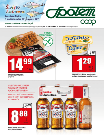 Lotnisko Dąbie 1 października 2016, godz. 1000 www.spolem.szczecin.pl Nr 18/2016 Informator handlowy wraz z częścią promocyjną. Ceny obowiązują od 16.09.2016 do 28.09.2016 lub do wyczerpania zapasów. PRODUKT BEZGLUTENOWY 14 19 16 99 1 kg 29 140 g 1 kg = 9,21 zł DANIO SEREK: białe; brzoskwinia; malina; truskawka; wanilia [Danone] PARÓWKI ZNAKOMITE [Indykpol] 1/2 LITRA PIWA ZAWIERA 25 GRAMÓW CZYSTEGO ALKOHOLU ETYLOWEGO NAWET TAKA ILOŚĆ SZKODZI ZDROWIU KOBIET W CIĄŻY I JEST NIEBEZPIECZNA DLA KIEROWCÓW 8 1 1 79 9 99 88 2l 1 l = 4,44 zł PIWO ŻYWIEC 3+1 BIAŁE 4 x 0,5 litra butelka NOWOŚĆ! 37 98 99 31 30 38 99 23 1 kg BEZ GLUTAMINIANU SODU 37 76 99 31 1 kg SZYNKA JAK Z PRL-U [Ozimek] SCHAB PIECZONY NATURRINO [Sokołów] 39 25 99 31 09 99 1 kg SCHAB PO KRÓLEWSKU [Olewnik] 30 NOWOŚĆ! 1 kg SZYNKA BEZ KONSERWANTÓW [Krakus] 1 kg KIEŁBASA Z FILETA ORYGINALNA [Lukullus] PRODUKT BEZ GLUTAMINIANU SODU BEZGLUTENOWY 13 68 99 10 26 27 66 99 23 1 kg SALCESON Z CZOSNKIEM [Krzyś] 1 kg PIERŚ OPIEKANA Z INDYKA [Morliny] 26 65 99 21 1 kg KIEŁBASA DOBROPOLSKA [JBB] 2637 25 35 99 21 1 kg 2803 20 99 1 kg 2342 99 19 1 kg UDZIEC Z INDYKA W GALARECIE [Łukosz] BOCZEK WĘDZONY EXTRA; BOCZEK DUŃSKI PARZONY [Kier] KARCZEK KOPCONY [Silesia] 2197 99 2204 99 2168 99 18 1 kg 17 1 kg FRANKFURTERKI [Pini Polska] KIEŁBASA SPOD STRZECHY [Nik-Pol] 2157 99 1983 99 17 1 kg KIEŁBASKI Z SZYNKI [Sokołów] 1782 99 14 1 kg PASZTETOWA Z WĘDZARNI [Polonus] 16 1 kg KIEŁBASA ZŁOTOPOLSKA [Drobimex] 1726 99 13 1 kg SZYNKA KONSERWOWA [Madej & Wróbel] 17 1 kg PASZTET WĘDZONY Z OGÓRKIEM [Mielczarek] 2079 99 15 1 kg SZYNKA ZŁOTA [Tarczyński] 1603 99 13 1 kg SZYNKOWA KANAPKOWA [Sława] DOBRE CENY! Oferta ważna 16.09–21.09.2016 r. 0 5 89 pęczek RZODKIEWKA 22.09–25.09.2016 r. CIELĘCINA • Zawiera dużo białka, żelaza, witamin z grupy B • Jest chude, delikatniejsze w smaku, o jasnej barwie • Przyrządzając cielęcinę warto pamiętać, że łatwo ją przesuszyć – dlatego nie pieczemy za długo, polewamy masłem w trakcie pieczenia • Uważajmy z ziołami i przyprawami – zbyt wiele lub zbyt wyraziste potrafią zgubić własny smak mięsa 28 99 1 kg 1 kg 1 kg 7 2 79 19 6 99 240-250 ml 1 l = 27,96-29,13 zł 1 OCET: WINNY – różne rodzaje; OCET JABŁKOWY; OCET JABŁKOWY STAROPOLSKI [McCormick] KASZA JĘCZMIENNA 4 x 100 g: wiejska; mazurska; perłowa; KASZA PĘCZAK JĘCZMIENNY 4 x 100 g [Cenos] 4 Górka cielęca bez kości IDEALNA NA ZRAZY, KOTLETY, STEKI, PULPETY Kości cielęce IDEALNE NA WYWAR DO ZUP DELIKATNYCH W SMAKU 1 kg – szparagowa, koperkowa, z młodych jarzyn 2 53 79 99 1 kg SZPONDER WOŁOWY Górka cielęca z kością IDEALNA NA KOTLETY Z KOSTKĄ 4 99 400 g 1 kg = 4,48 zł 80 g 1 kg = 27,38 zł PASTELLA LISNER – różne rodzaje 1 kg GÓRKA CIELĘCA 1 kg ŻEBERKA WIEPRZOWE MOSTKI 3399 99 37 Mostek cielęcy bez kości IDEALNY DO FASZEROWANIA I PIECZENIA MOSTEK CIELĘCY 16 99 UDKO Z KURCZAKA Z KOŚCIĄ Dostępne w dniach 2 9 99 6 29 99 470-480 g 1 kg = 10,40-10,62 zł PUDLISZKI KETCHUP: łagodny Premium NOWOŚĆ łagodny; pikantny; do pizzy; super pikantny [Heinz] 3 4 48 49 1 75 g 1 kg = 26,53 zł 400 g 1 kg = 8,73 zł MAKARON 2-JAJECZNY: wstążki; wstęgi; wstęgi ozdobne; krajaneczka [Makarony Polskie] 2 53 99 KUCHAREK SMAK NATURY [Prymat] 6 99 49 250 ml 1 l = 17,96 zł OLEJ KUJAWSKI – różne rodzaje [Kruszwica] MAJONEZ KIELECKI [Społem Kielce] 4 6 69 99 310 ml 1 l = 16,09 zł KONFITUREX 2:1 [Foodcare] 1 2 99 99 40 g 1 kg = 49,75 zł W tych sklepach Społem można kupić świeże ryby Kuchnia Społem prosto z Kołobrzegu Castor, ul. E. Plater 82 Pomorze, ul. E. Gierczak 27 Jowisz, ul. Monte Cassino 38 Hermes, ul. Lelewela 9 Hala Piastowska, ul. Barbary 1a Pogodno, ul. Reymonta 4 Sklep spożywczy, ul. Romantyczna 66 Sklep spożywczy, ul. Cedyńska 2 FLĄDRA W PŁATKACH MIGDAŁOWYCH SKŁADNIKI: • kilka filetów flądry, • dwie garści płatków migdałów, • jedno jajko, • mąka pszenna, • bułka tarta, • olej do smażenia • sól i pieprz PRZYGOTOWANIE: Flądrę należy najpierw pozbawić ciemnej, chropowatej skóry. Następnie wypłukać i osuszyć papierowym ręcznikiem. Oczyszczone filety dokładnie natrzeć solą i pieprzem, a następnie odstawić na około 15 minut. W tym czasie w osobnych miseczkach przygotować roztrzepane widelcem jajko, mąkę, bułkę tartą oraz płatki migdałów. Filet maczamy najpierw w jajku, następnie w mące, ponownie w jajku, od strony skóry pokrywamy go bułką tartą, z drugiej z kolei płatkami migdałów. Rozgrzewamy patelnię i smażymy rybę z obu stron do momentu aż panierka będzie zarumieniona. FLĄDRA PIECZONA W FOLII ALUMINIOWEJ SKŁADNIKI: • tuszki flądry • cytryna pokrojona w plastry • kilka łyżek masła • 2 łyżki posiekanego świeżego koperku • sól • pieprz cytrynowy 6 8 59 99 op. 1 kg = 38,83-39,94 zł POMIDORY SUSZONE: z ziołami 280/180 g; z czosnkiem 300/175 g [Smak] 4 5 69 44 op. 1 kg = 34,15-40,36 zł OLIWKI: czarne; zielone – 220/110 g; zielone: z czosnkiem; z pastą paprykową; z serem pleśniowym – 220/130 g [Smak] PRZYGOTOWANIE: Flądrę należy najpierw pozbawić ciemnej, chropowatej skóry. Dokładnie umyć i osuszyć ręcznikiem papierowym. Koperek wymieszać z masłem, dodać sól i pieprz. Powstałą pastą posmarować flądry. Obłożyć plastrami cytryny i zawinąć w folię aluminiową. Piec 20 minut w piekarniku rozgrzanym do 200 stopni. Podawać z surówką z kiszonej kapusty lub sałatką ze świeżych warzyw. Smacznego! 5 6 19 39 op. 1 kg = 14,18-15,85 zł OGÓRKI Z CHILI 720 ml/360 OGÓRKOWE KORECZKI 720 ml NOWOŚĆ OGÓRKI KISZONE PREMIUM 733 ml/380 OGÓRKI CZOSNKOWE 720 ml/340 [Salutario] NOWOŚĆ 4 29 540 ml/480 1 l = 8,31 zł Z BABCINEJ SPIŻARNI: jabłuszko, kapusta i słodka żurawinka; buraczek i piękna fasola [Salutario] Tradycyjny makaron wytwarzany ze świeżo wybijanych jaj i mąki od lokalnych dostawców. Jego lekko chropowata powierzchnia to zasług