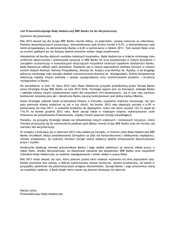 List Przewodniczącego Rady Nadzorczej BRE Banku SA do Akcjonariuszy Szanowni Akcjonariusze, Rok 2012 okazał się dla Grupy BRE Banku równie dobry, co poprzedni, uznany wówczas za rekordowy. Pomimo pesymistycznych scenariuszy, skonsolidowany zysk brutto wzrósł o 0,3%, a skonsolidowany zysk netto przypadający na akcjonariuszy Banku o 6,0% w porównaniu z rokiem 2011. Tym samym Bank wraz ze swoimi spółkami po raz kolejny spełnił stawiane wobec niego oczekiwania. Niezależnie od bardzo dobrych wyników kolejnych kwartałów, Rada Nadzorcza w trakcie minionego roku wnikliwie obserwowała i analizowała sytuację w BRE Banku SA oraz pozostawała w stałym kontakcie z Zarządem uczestnicząc w konsultacjach dotyczących wszystkich istotnych aspektów działalności Banku. Rada Nadzorcza odbyła sześć posiedzeń. Podobnie jak w latach poprzednich działała również w ramach swoich Stałych Komisji: Komisji Prezydialnej, Komisji ds. Audytu oraz Komisji ds. Ryzyka, a od drugiego półrocza minionego roku zaczęła działać nowoutworzona Komisja ds. Wynagrodzeń, której kompetencje obejmują między innymi politykę i zasady wynagradzania oraz monitorowanie poziomu i struktury wynagrodzeń w Banku. Na posiedzeniu w dniu 25 lipca 2012 roku Rada Nadzorcza przyjęła przedłożoną przez Zarząd Banku nową Strategię Grupy BRE Banku na lata 2012-2016. Strategia oparta jest na koncepcji Jednego Banku i zakłada między innymi ujednolicenie marki dla wszystkich linii biznesowych. Już w tym roku zarówno bankowość korporacyjna jak i detaliczna Banku zaczną funkcjonować pod jedną marką mBanku. Nowa Strategia zakłada także przebudowę bilansu w kierunku uzyskania większej równowagi. Na tym polu pierwsze efekty widoczne są już w tej chwili. Na koniec 2012 roku depozyty wzrosły o 6,9% w porównaniu do roku 2011, a wskaźnik kredytów do depozytów, który rok temu wynosił 125,1% spadł do 115,7% na koniec grudnia 2012 roku. Bank zaczął także w większym stopniu wykorzystywać rynki finansowe do pozyskiwania Finansowania, między innymi poprzez emisję euroobligacji. Ponadto, na przyjętą Strategię składa się kilkadziesiąt innych większych i mniejszych inicjatyw, które również przyczynią się do wzmocnienia podstaw pod dalszy rozwój Grupy BRE Banku oraz do wzrostu jej wartości dla akcjonariuszy. W związku z kończącą się w obecnym 2013 roku kadencją Zarządu, w imieniu całej Rady Nadzorczej BRE Banku chciałbym złożyć podziękowania Zarządowi za pięć lat konstruktywnej i efektywnej współpracy. Jestem przekonany, że wybrany wkrótce Zarząd nowej kadencji będzie kontynuował dotychczasowe prace i wysiłki. Serdecznie dziękuję również pracownikom Banku i jego spółek zależnych za owocny wkład pracy, a także Wam, drodzy Akcjonariusze, za okazywane zaufanie dla działalności BRE Banku oraz wszystkim Członkom Rady Nadzorczej za osobiste zaangażowanie i wielki wkład w pracę Rady. Rok 2013 może okazać się tym, który postawi przed nami większe wyzwania niż dwa poprzednie lata. Każde wyzwanie jest szansą, a dobrze wykorzystana szansa wzmacnia. Jestem przekonany, że nawet w przypadku spełnienia się pesymistycznych prognoz ekonomistów, Zarząd Banku i jego pracownicy staną na wysokości zadania, a Bank dzięki temu stanie się jeszcze silniejszy niż obecnie. Maciej Leśny Przewodniczący Rady Nadzorczej